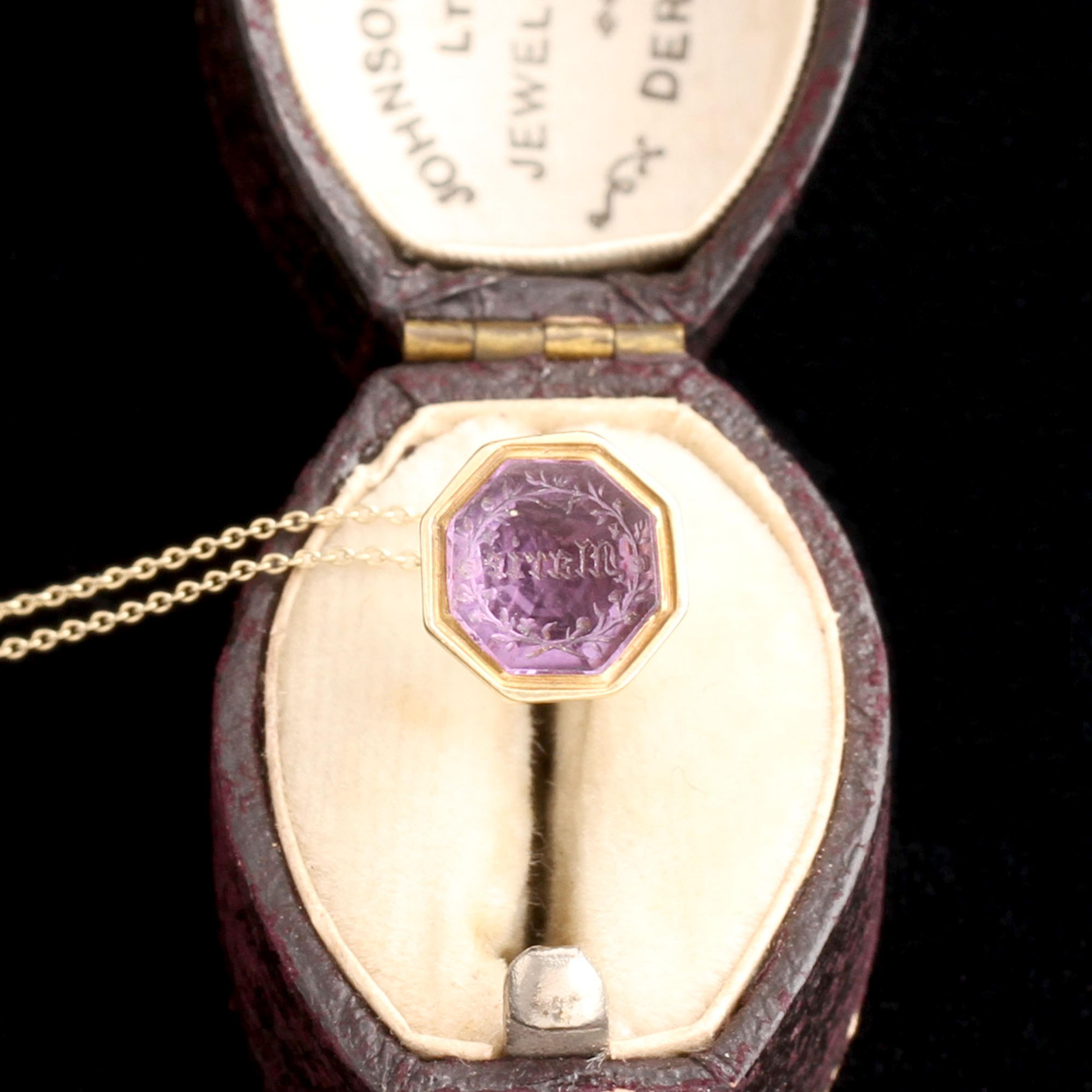 Marie had this amethyst set into a fob around 1829, before birthstones were standardized, so we can't be sure she was an Aquarius. We do know the wax seals on her letters were beautifully sealed, though. Her name and a halo of flowers would have made a beautiful impression.