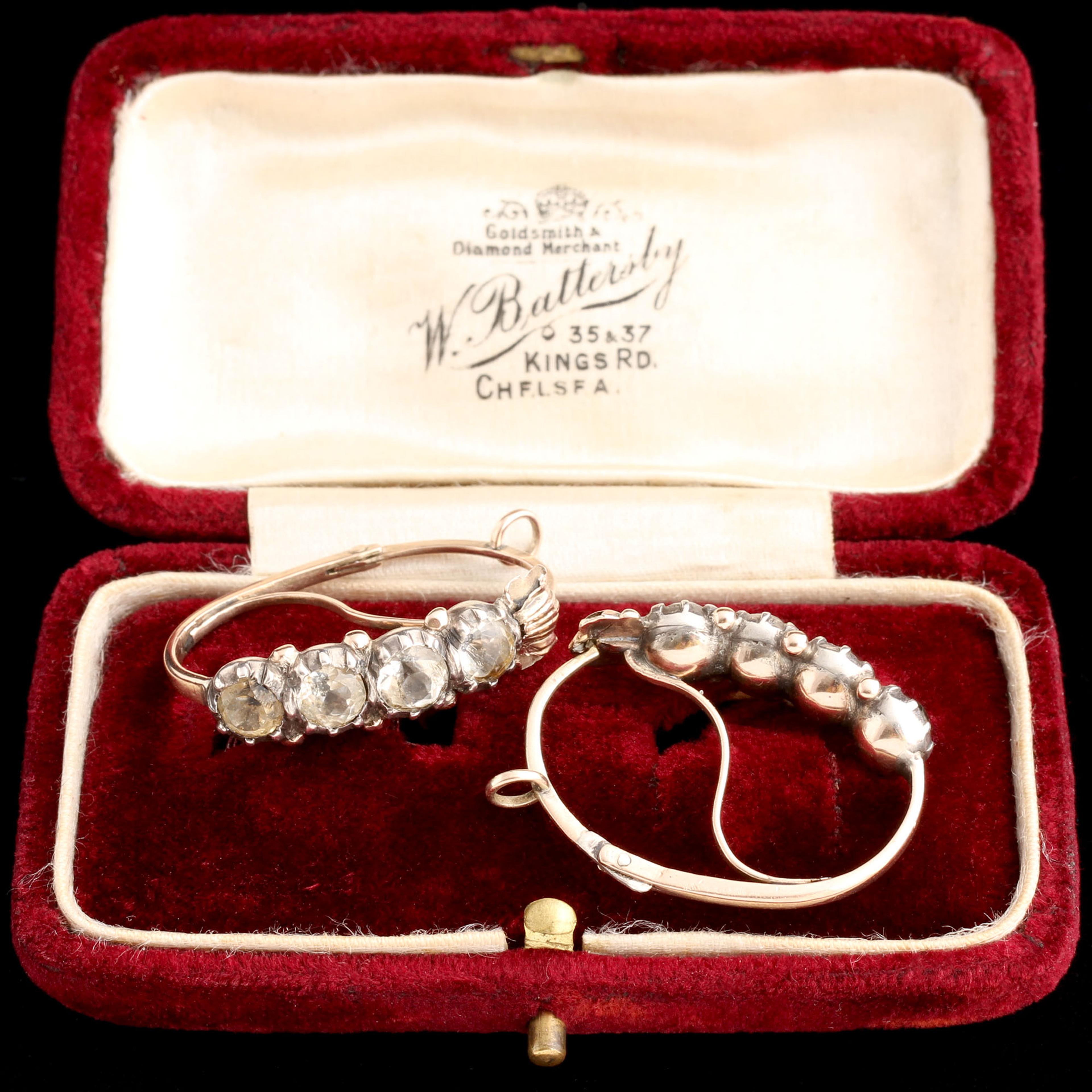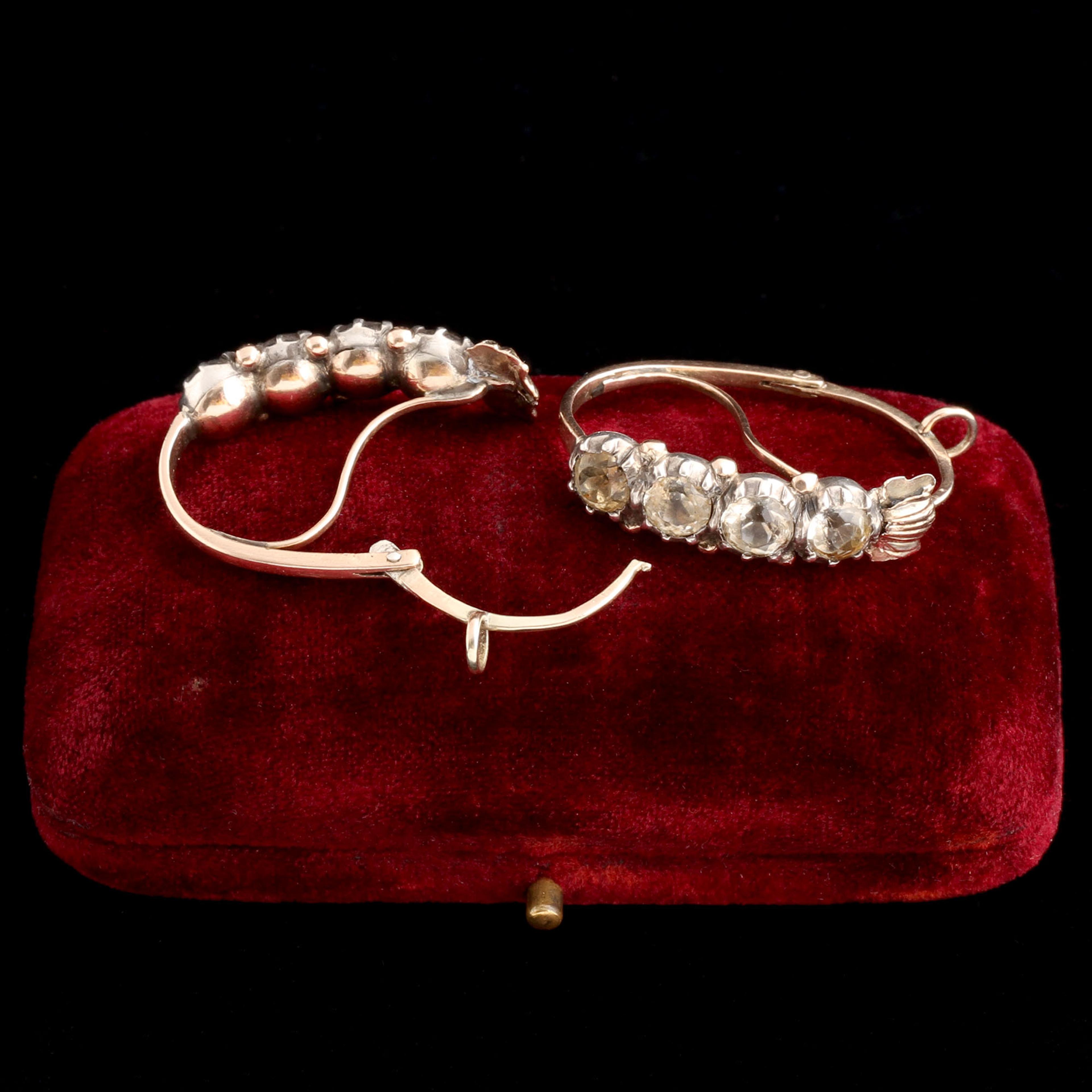 These striking hoop earrings are made in a style known as poissarde, which translates from French as ”fishwife“. There are two possibly apocryphal explanations for this how this moniker came to be. The first is that they are named for the female fish sellers who allegedly wore them while selling their goods in the Paris market of Les Halles. The alternate explanation (more believable and less fun) is that they are named for the vaguely fish hook shape. These earrings date to the turn of the 19th century, they are made in 10k gold and set with chunky black dot paste stones.