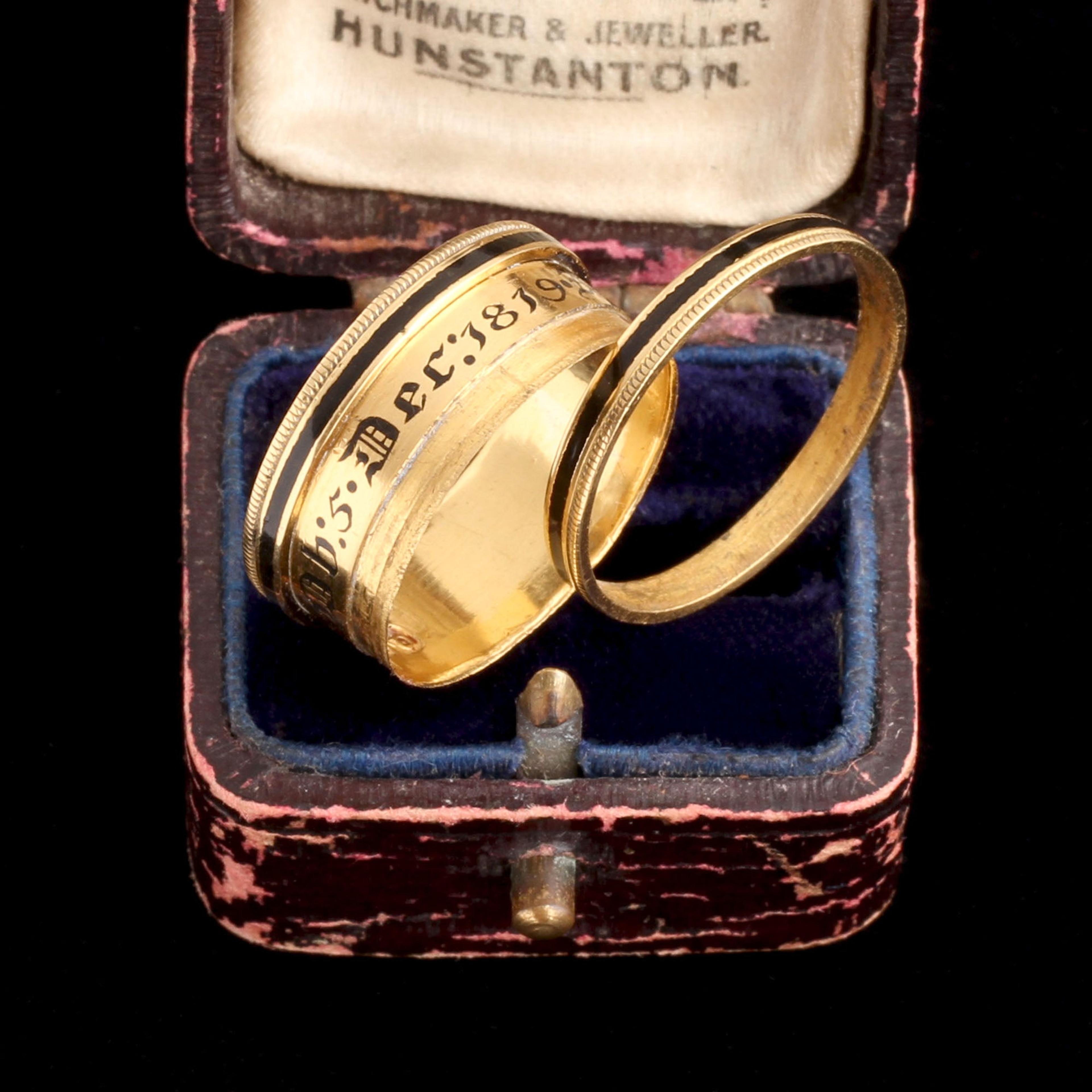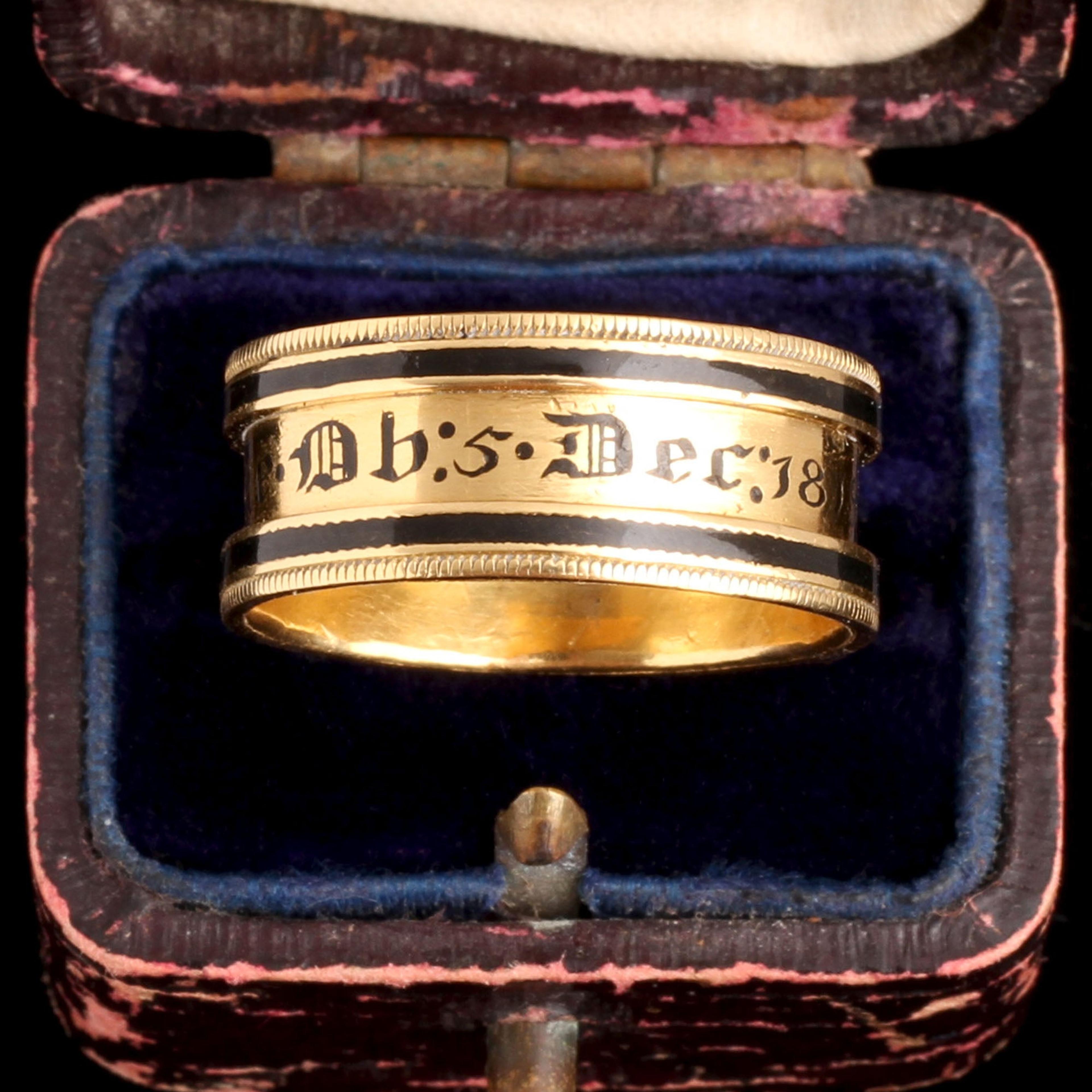 All early 19th century mourning rings are a little freaky, but Catherine Packe's family got even kookier than usual when they commissioned her memorial jewels. Odd: the border components are fitted on rather than cast in place. Also weird: on the outside, where we usually see the standard black enamel "IN MEMORY OF", all of her details are there. "Cath: packe Ob: 5 Dec: 1819 AE 72".