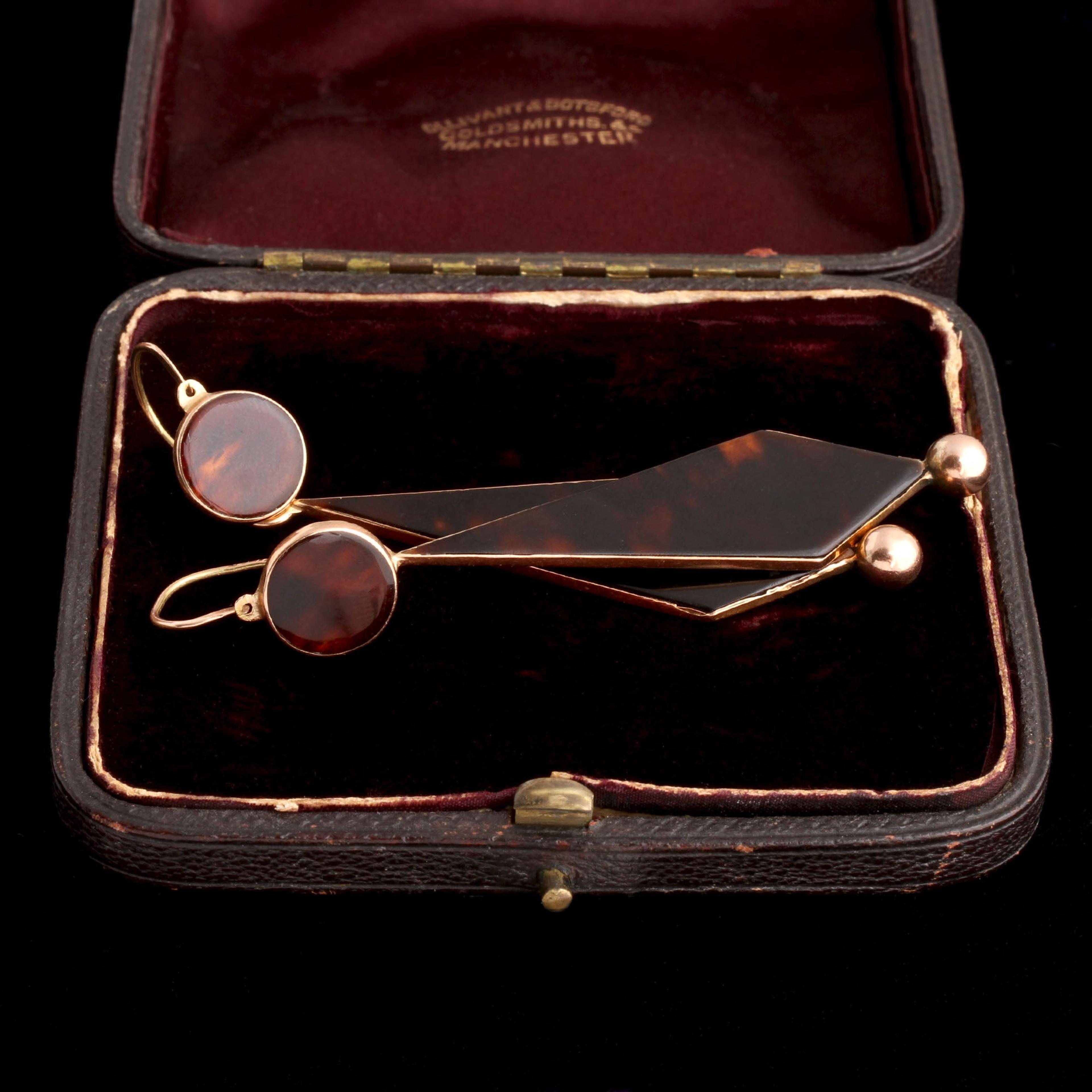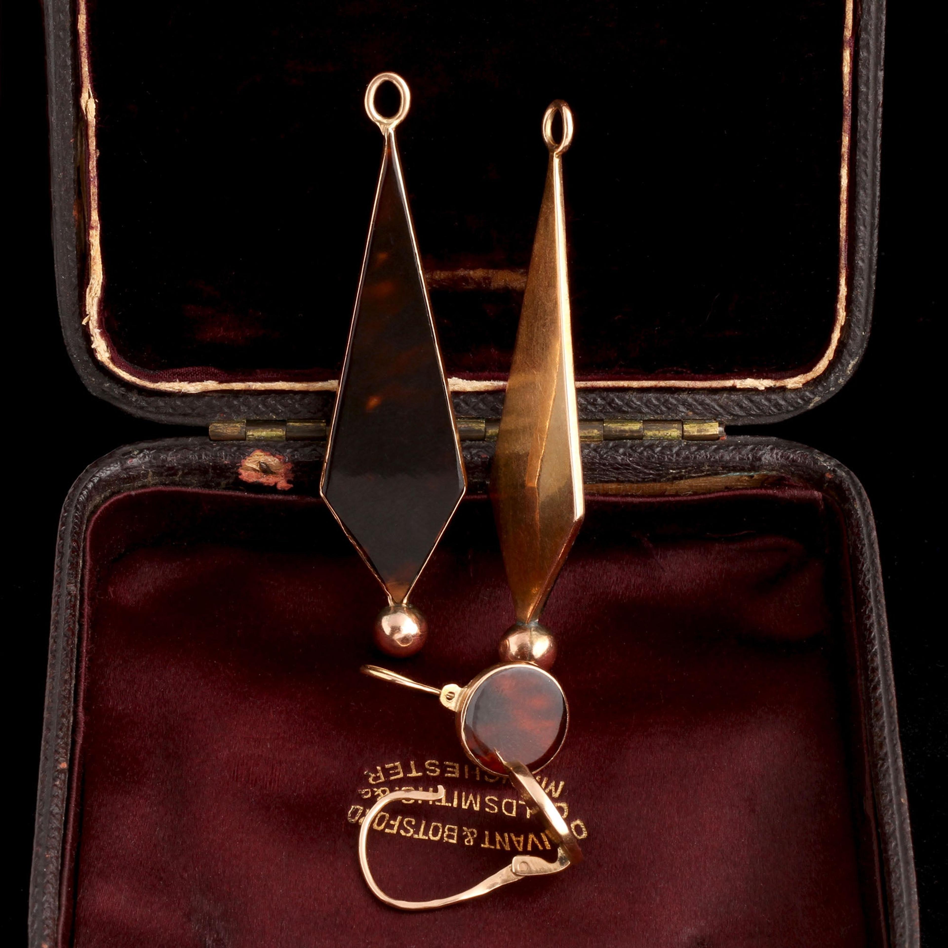 Restrained in design, these earrings telegraph lush glamour with their oversized scale and contrasting materials. Rich, warm tortoiseshell is set into barely-there 18k gold frames that are matte expanses on the back. Indecipherable maker's marks, but we believe these are Continental European jewels from the 1830s or so. Drops can be removed to wear the small discs solo.