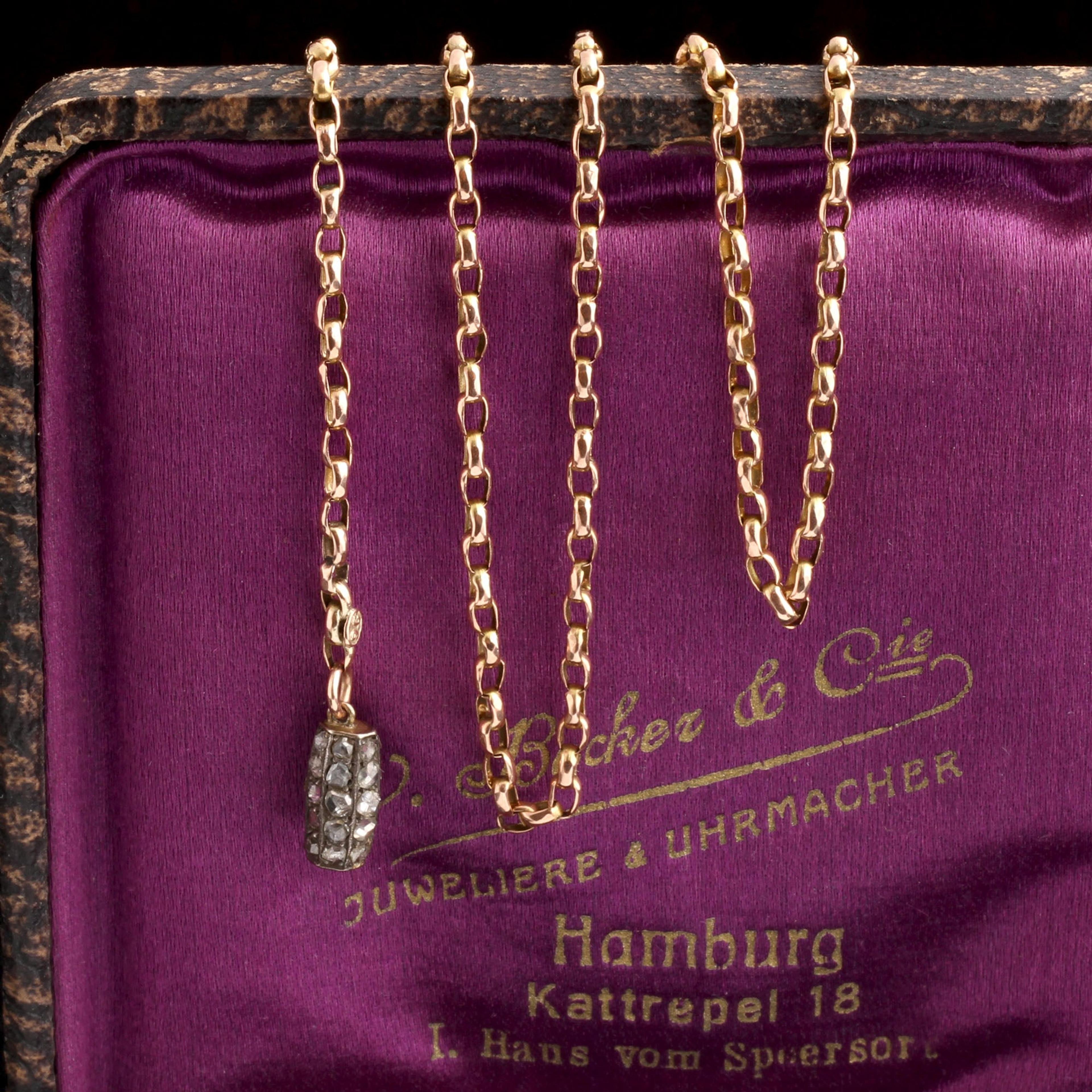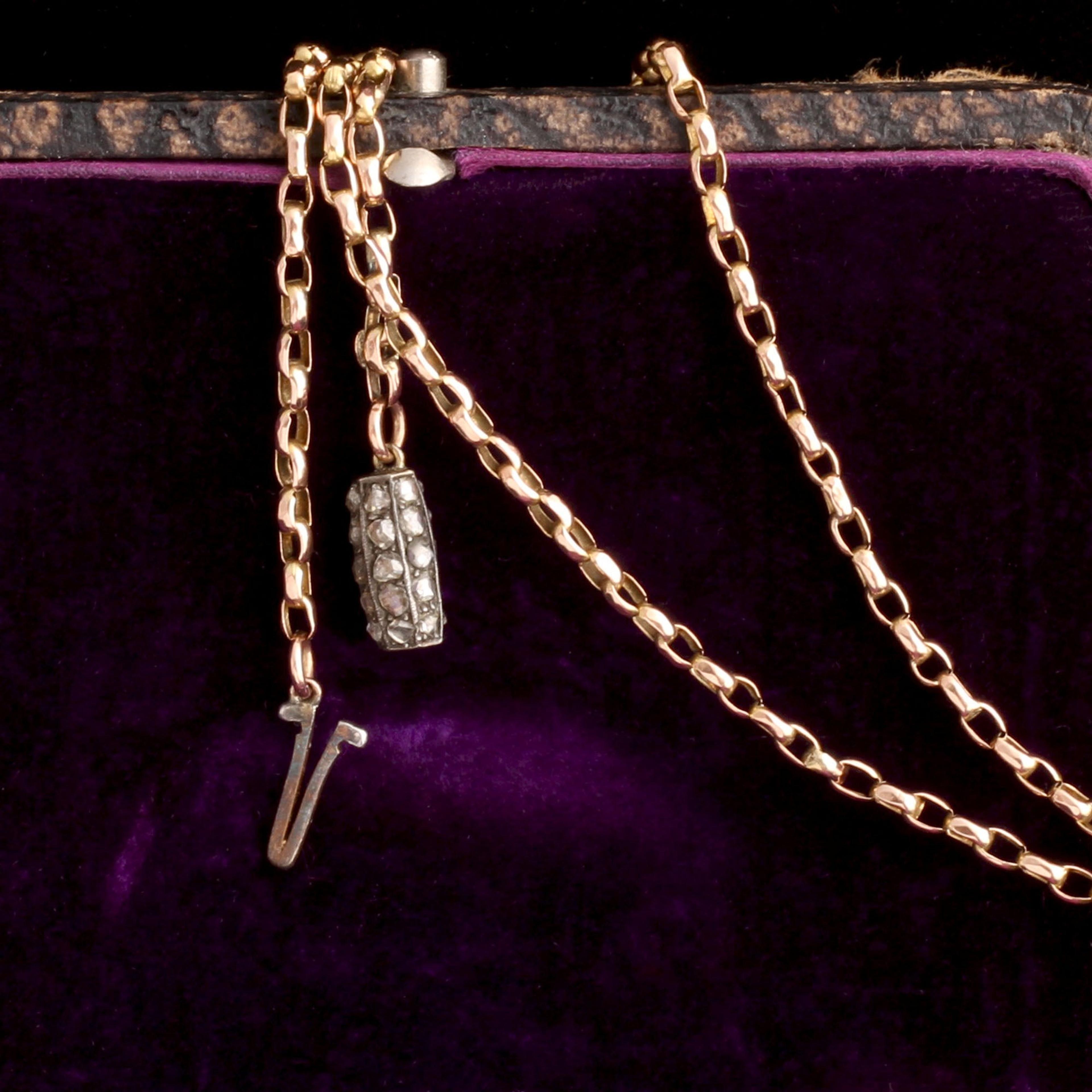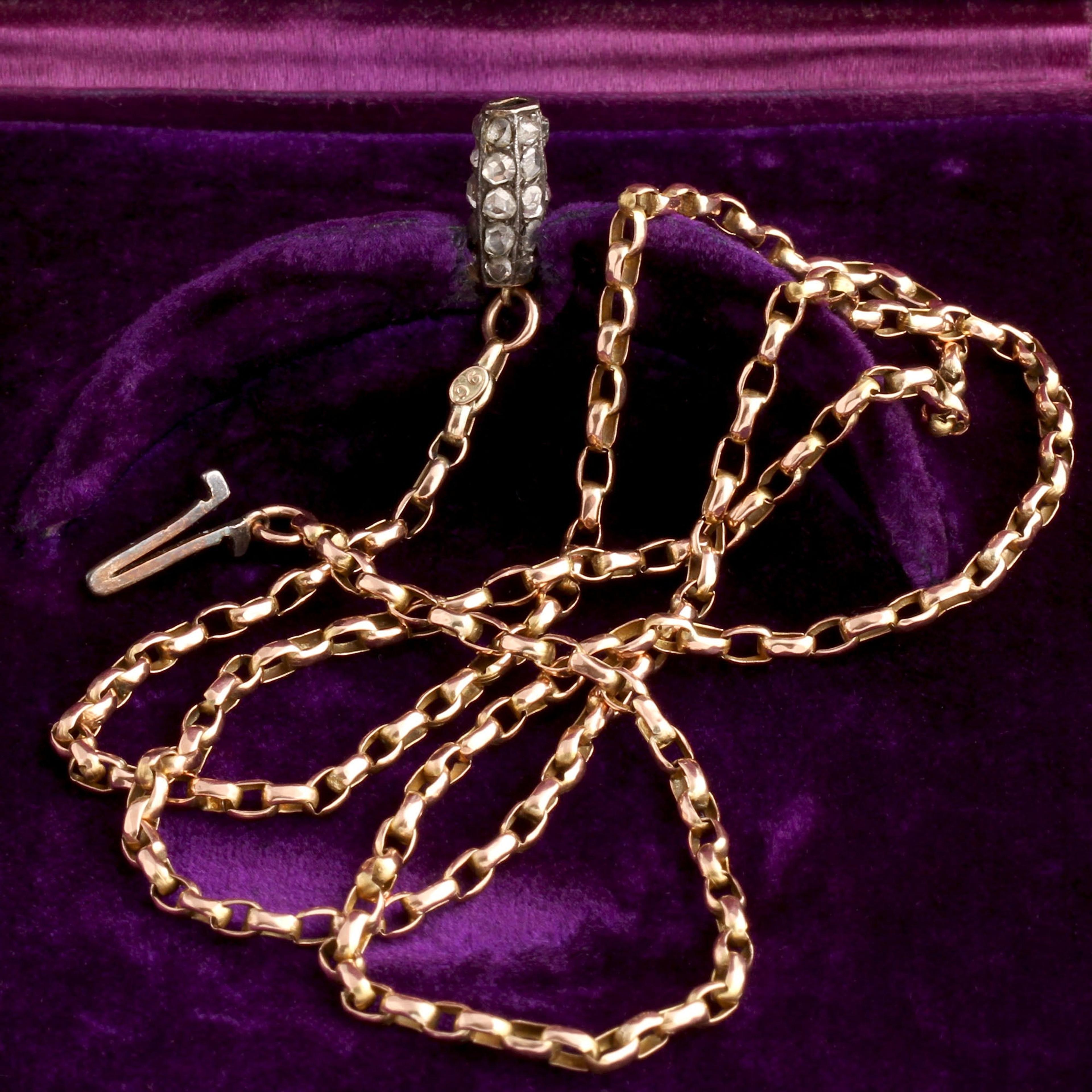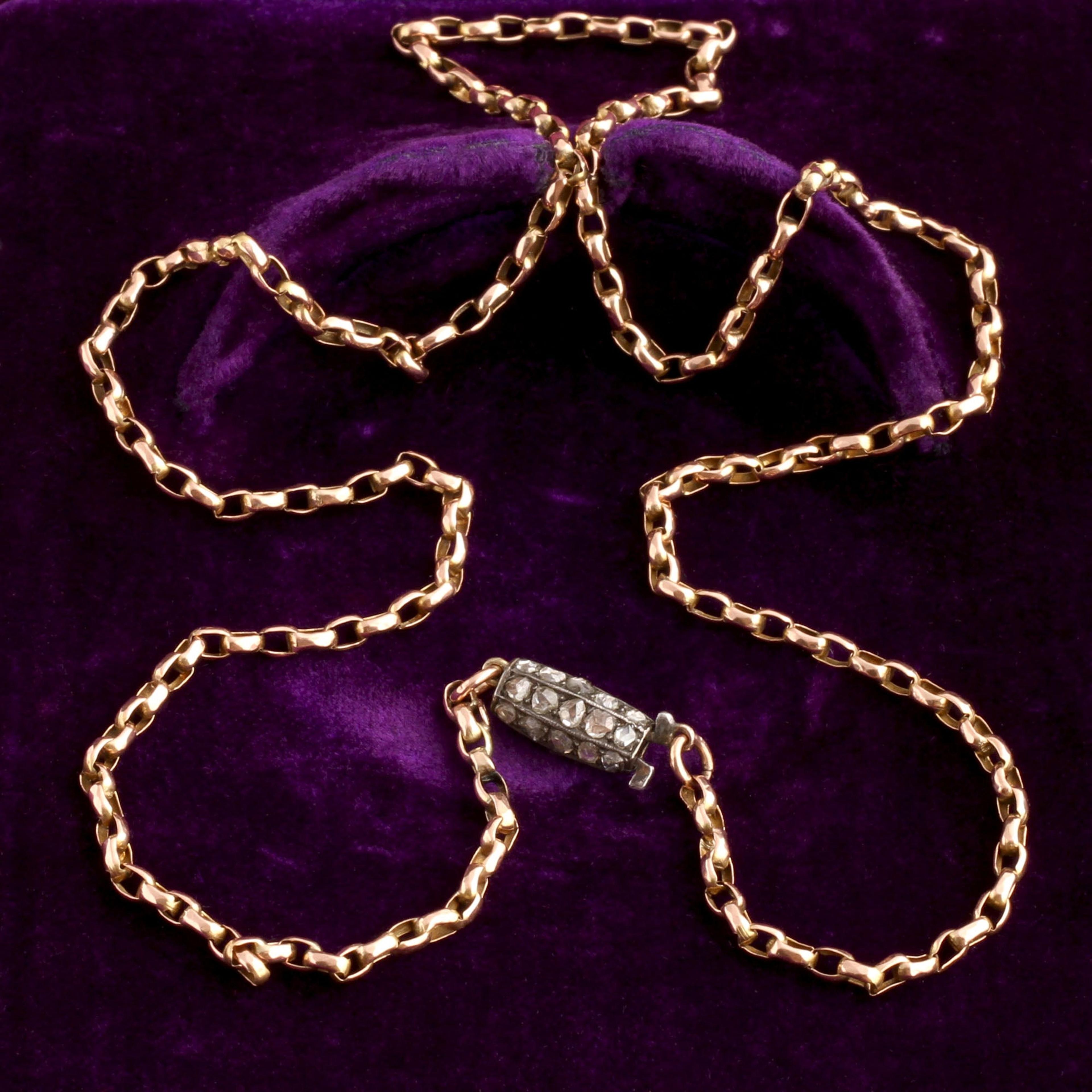 A darkly glittering barrel clasp made around the year 1800 with 30 rose-cut diamonds. It elevates an already great Victorian gold chain to the next level. Let this be your base for charms, or wear it solo with the barrel-shaped closure as the main event.