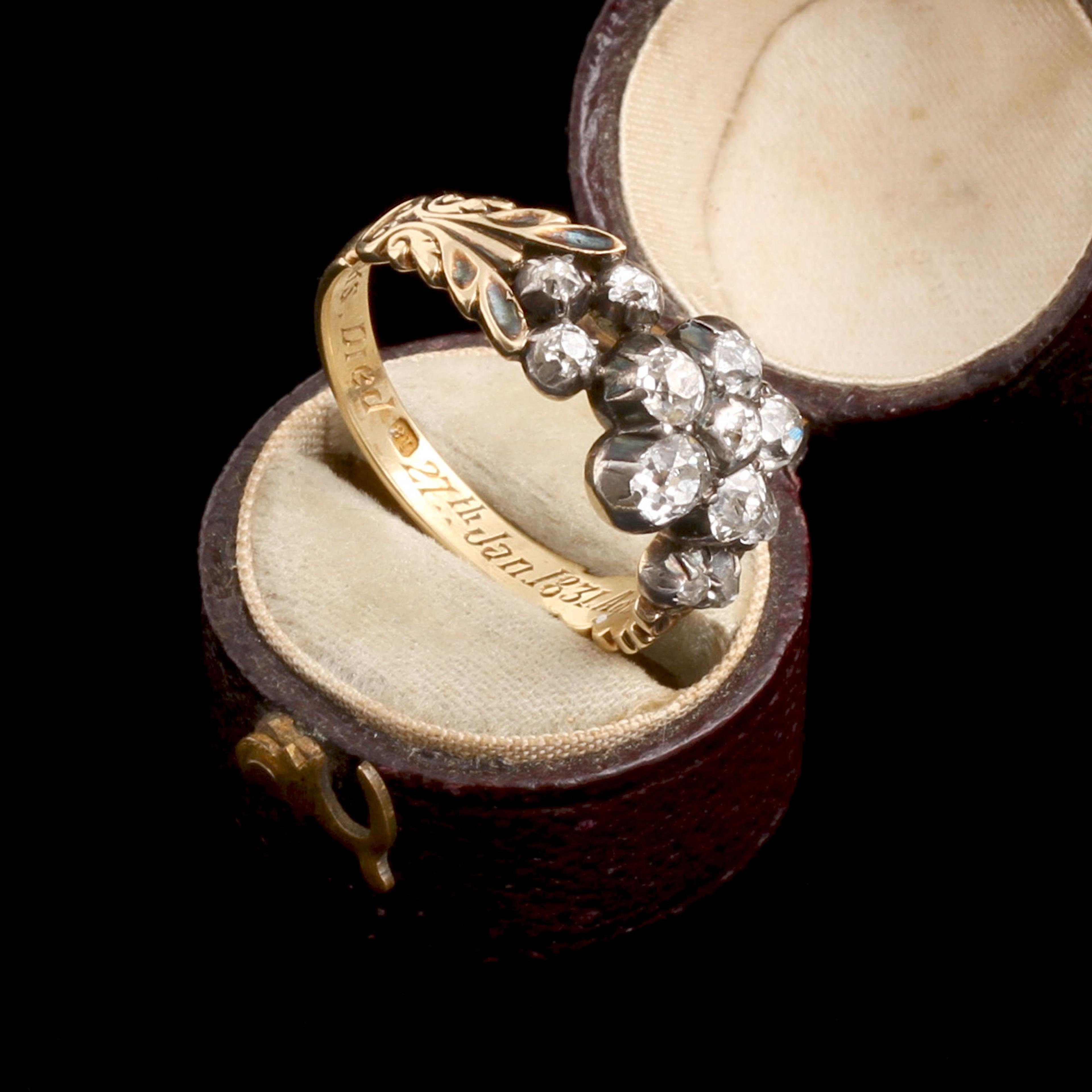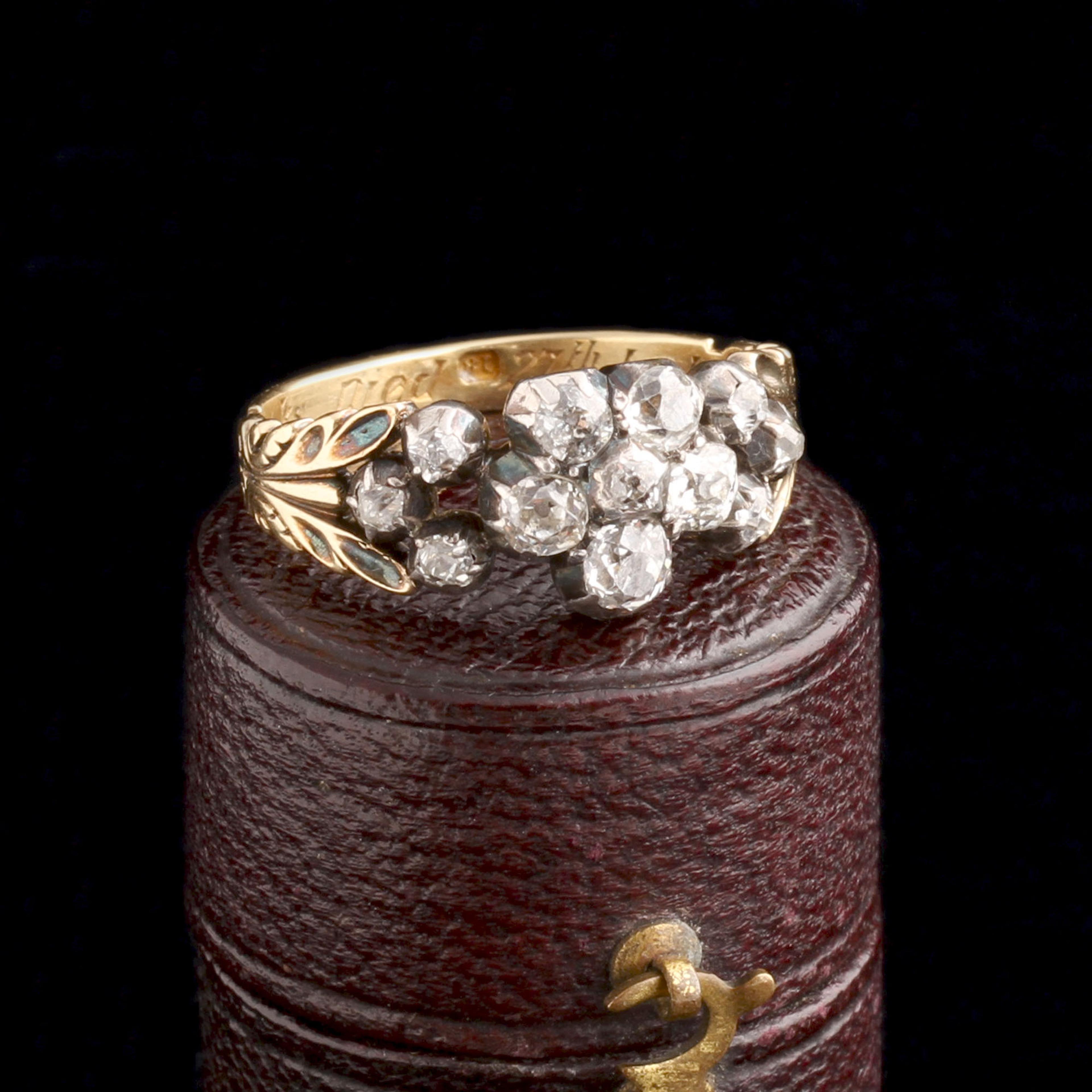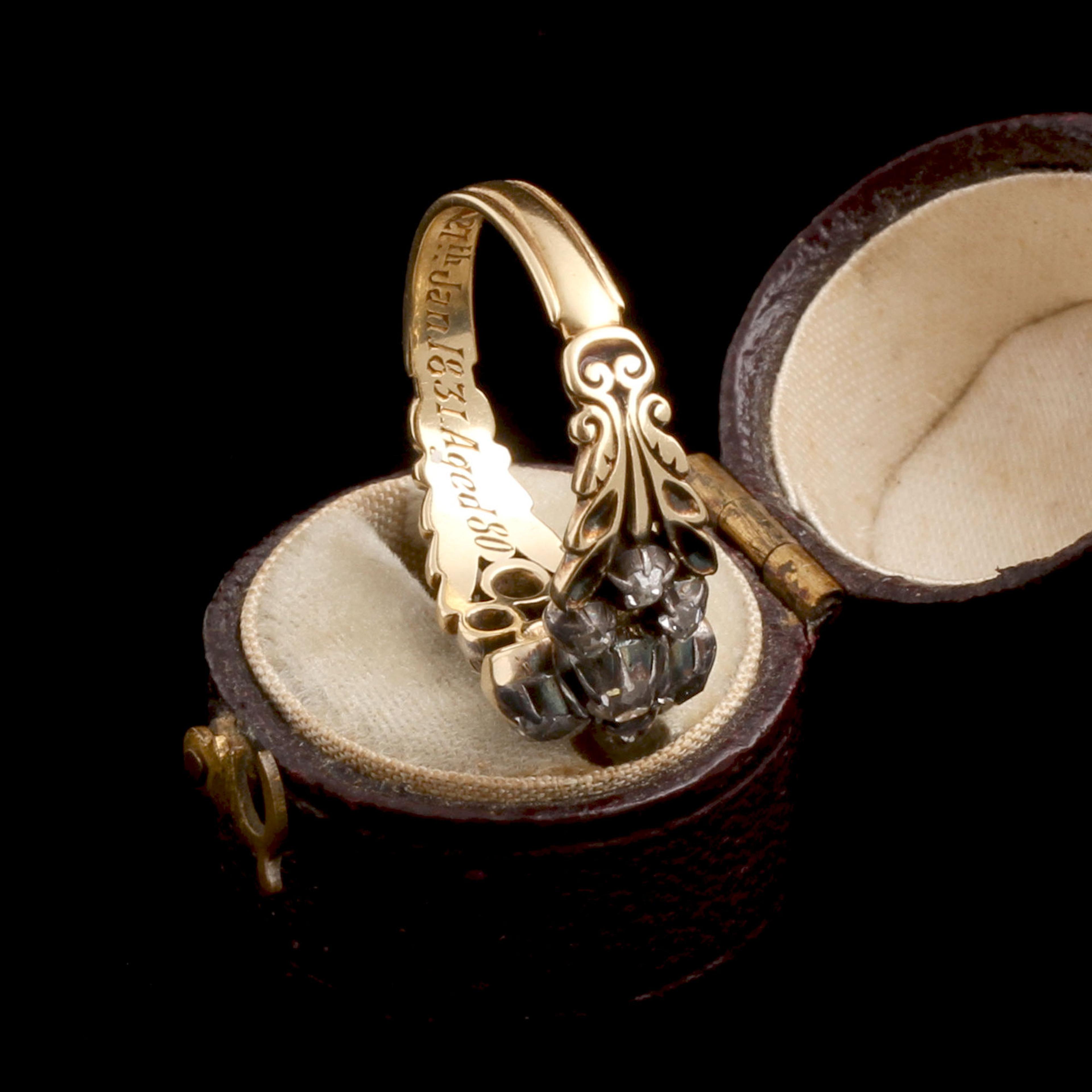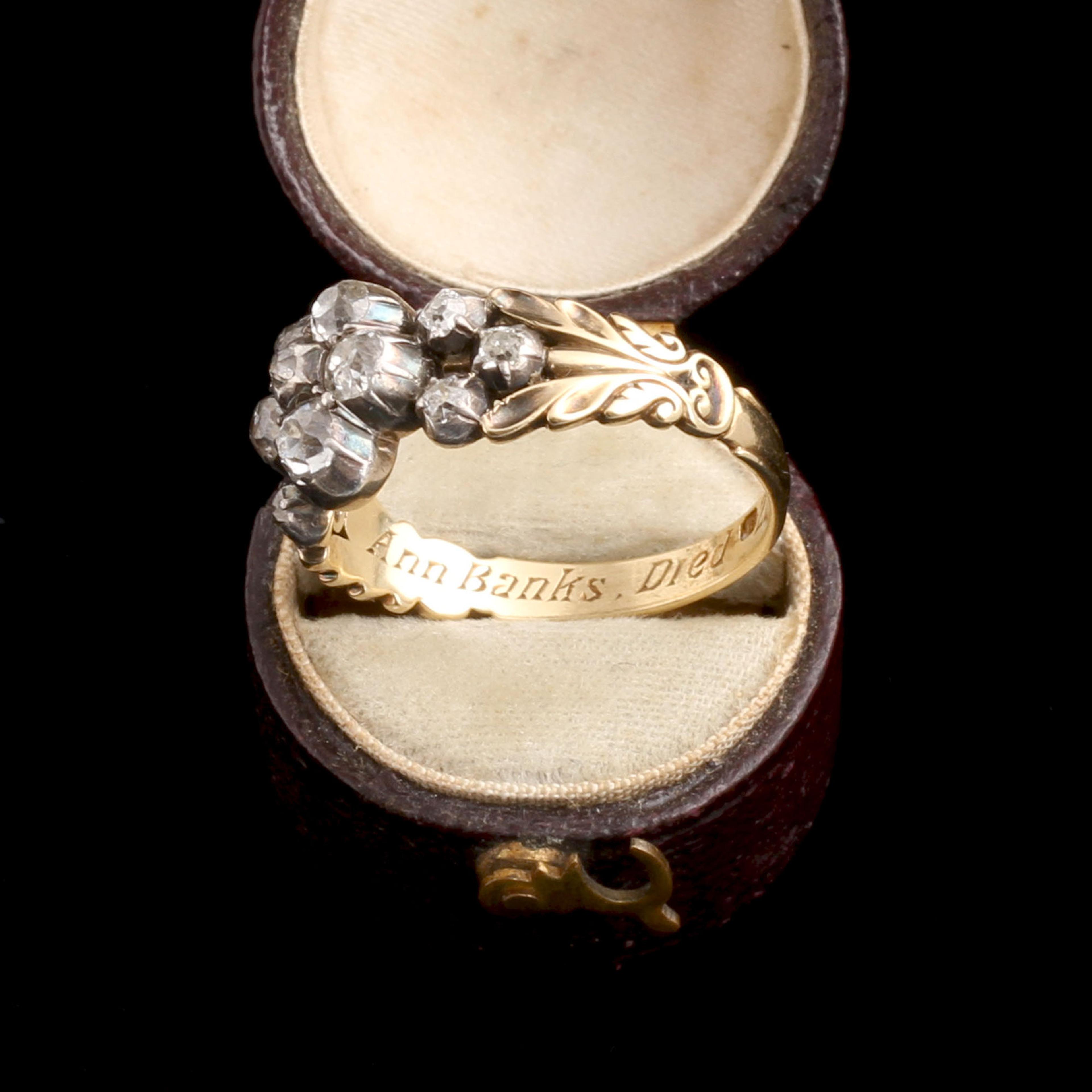 A CARAT'S WORTH of gorgeous old mine cut diamonds are arranged in an abstracted pansy pattern, which anyone in the 1830s would have recognized as a message: "think of me". In the unspoken 19th century language of floriography, every flower had meaning. The inside of the band is engraved with the death date of an 80 year old woman, Ann Banks. The ring is unusual in that it's not immediately recognizable as a memorial ring from the outside. Lots of sparkle, no black enamel. It's subtle and soft.