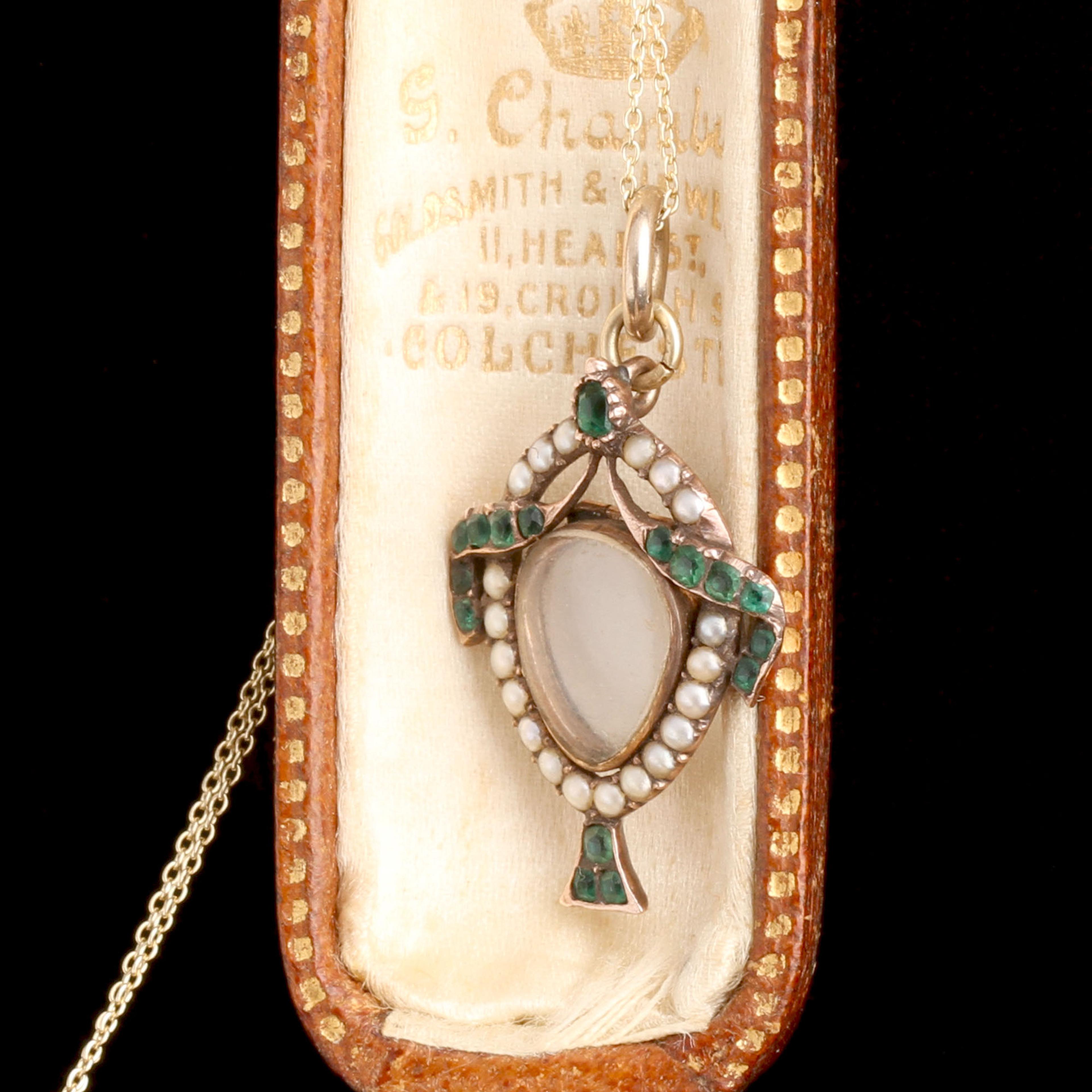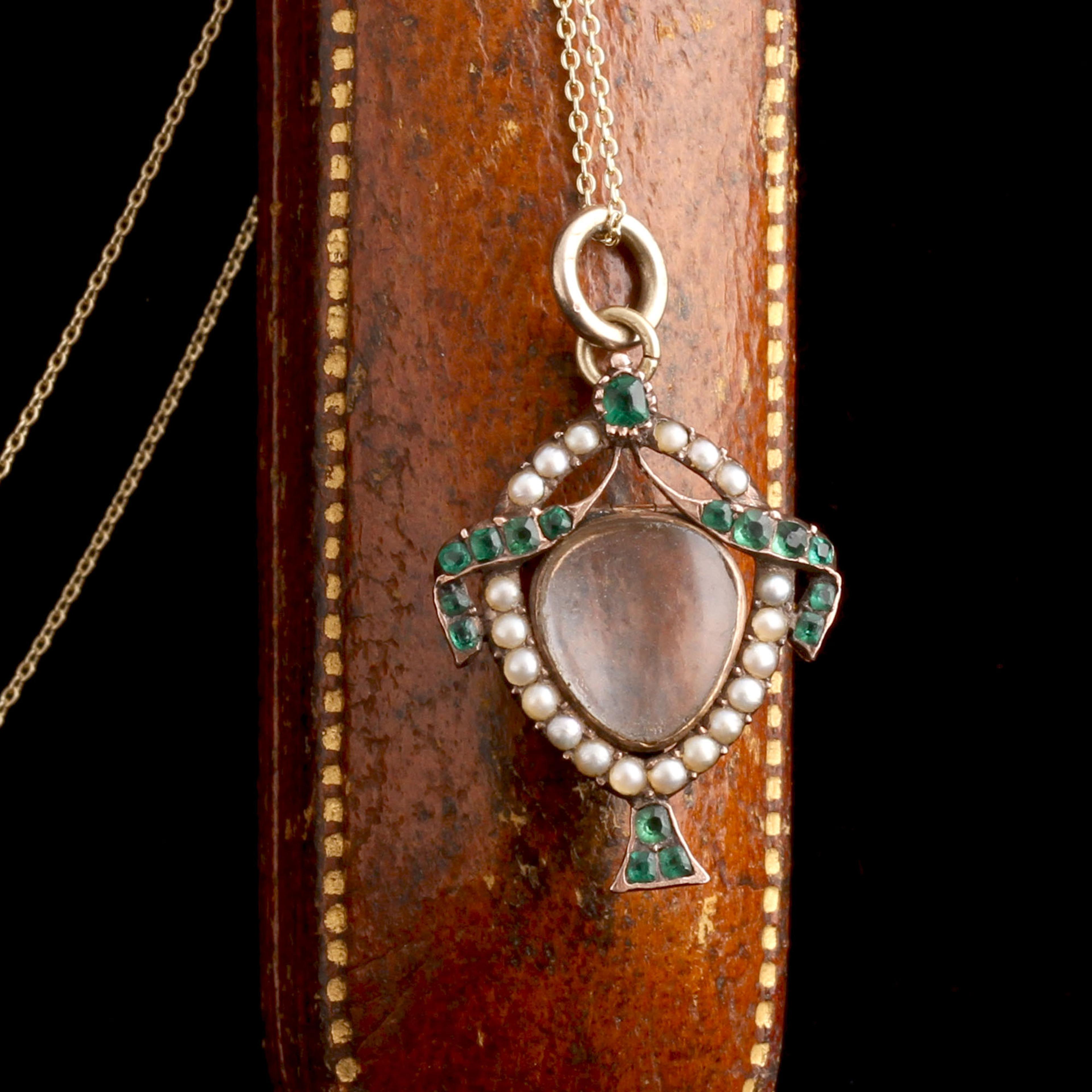 10k gold (tests), seed pearls, old cut emeralds, glass lens, rock crystal locket back, new 14k gold chain