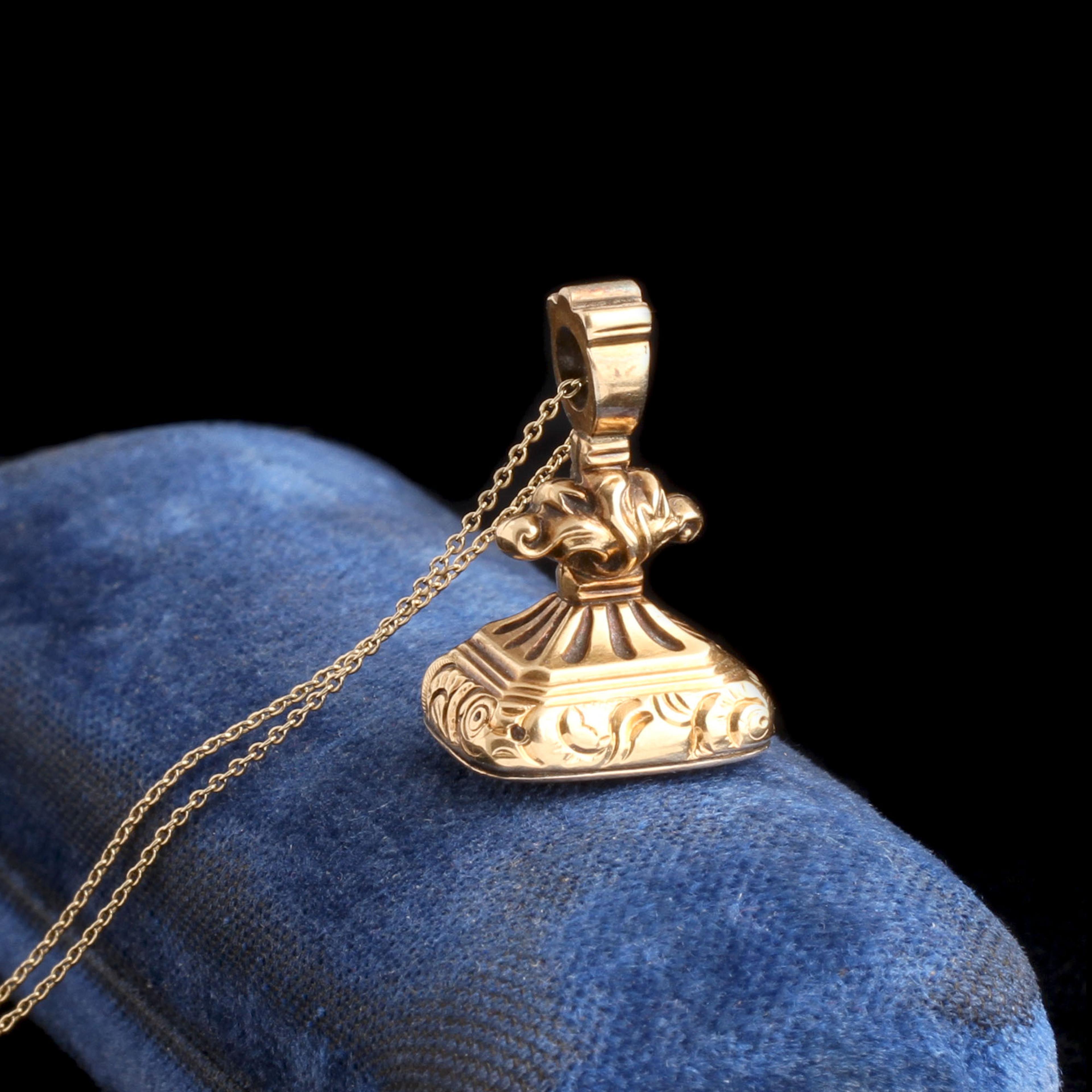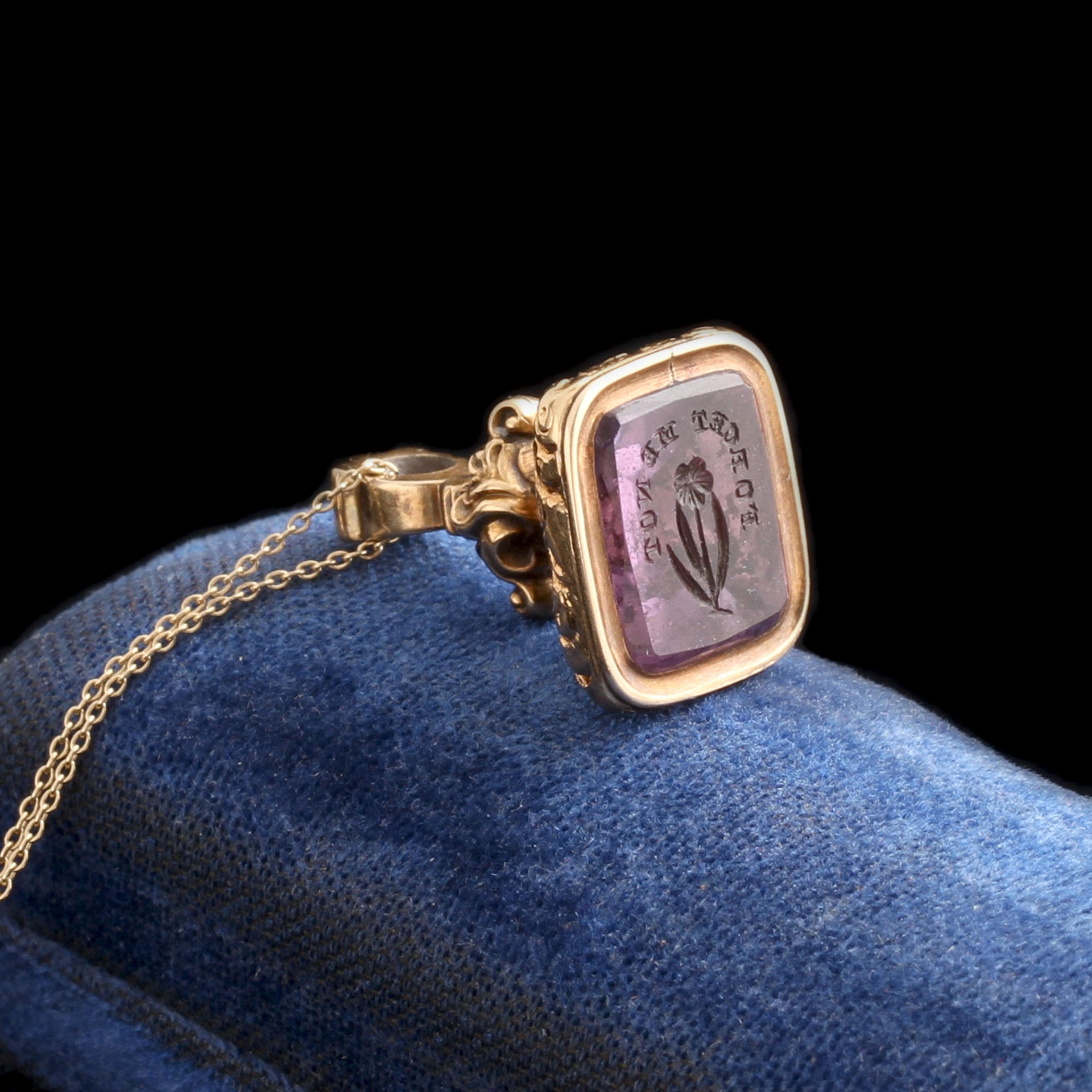 A Georgian seal fob modeled in gold with an amethyst intaglio featuring the words “Forget Me Not” arced over a flower of the same name. The words are etched in reverse in order to form a right-way-around impression when pressed into sealing wax. On a new 18" 14k gold chain.