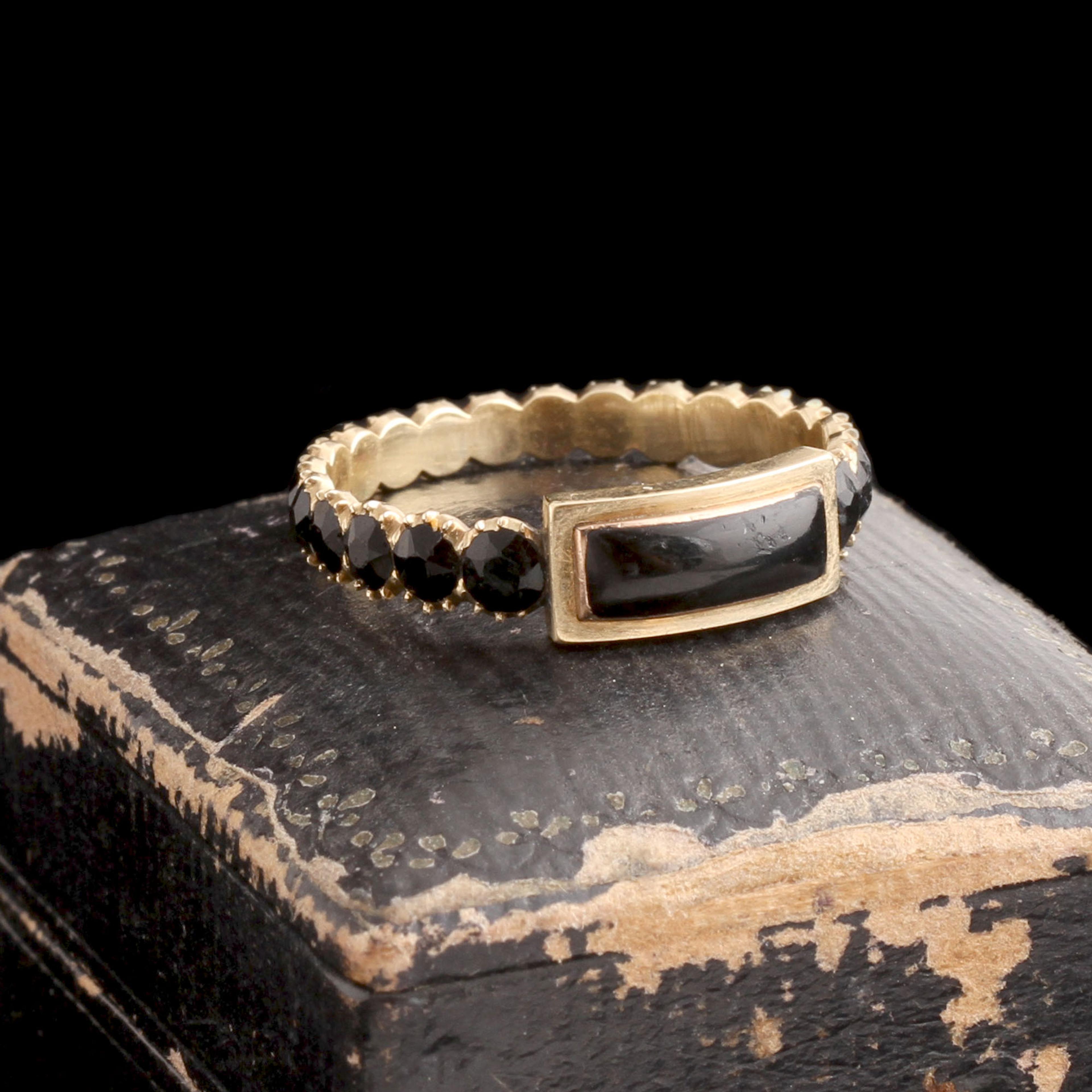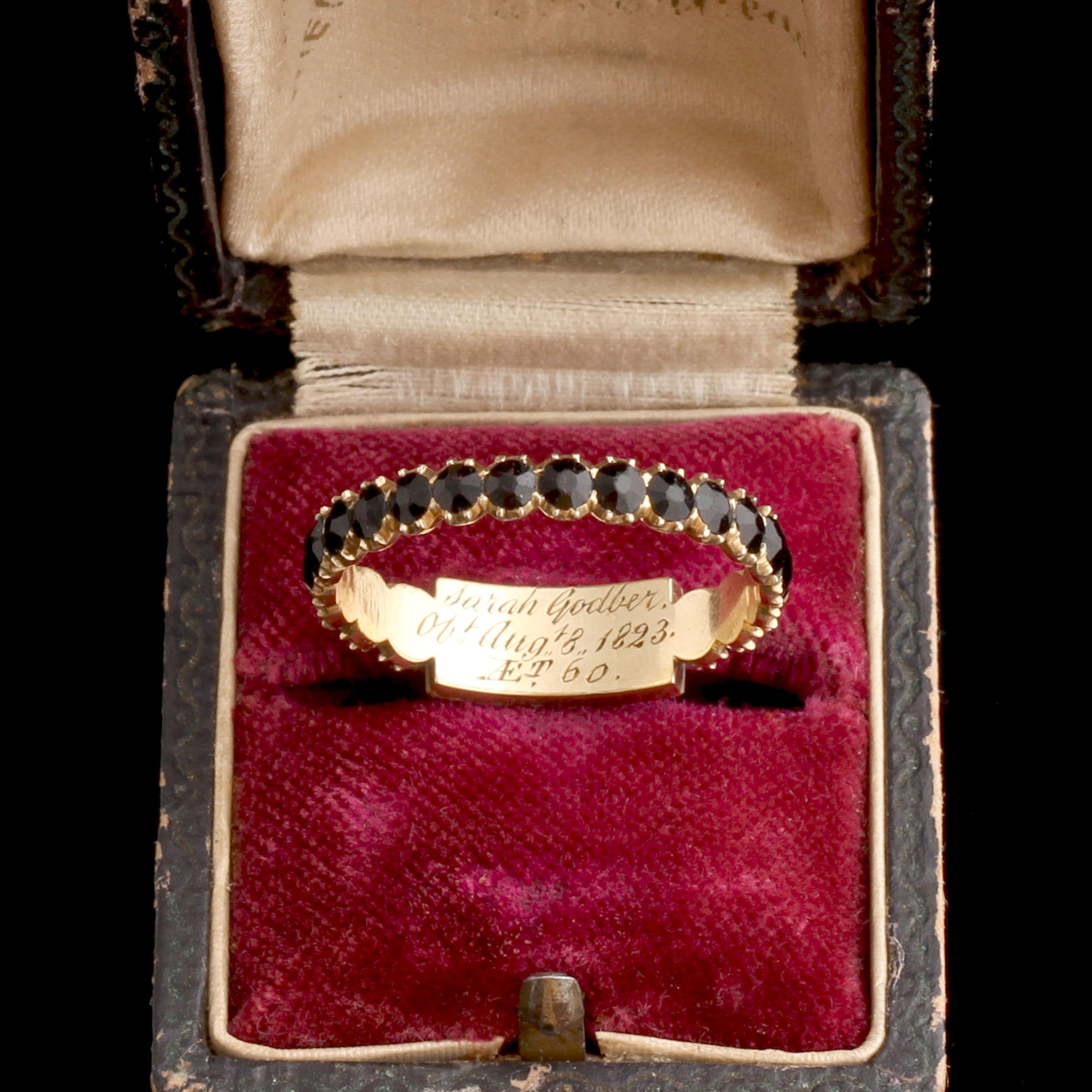THIS MOURNING RING is set with French jet—a glossy black glass often used in place of real jet, but just as effective at catching the light and setting a somber tone. The inscription reads: Sarah Godler Ob[t] Aug[t] 8 1823 AET 60—which means she died on August 8, 1823, at age 60. It was worn by someone close to Sarah who wanted her memory to live on.