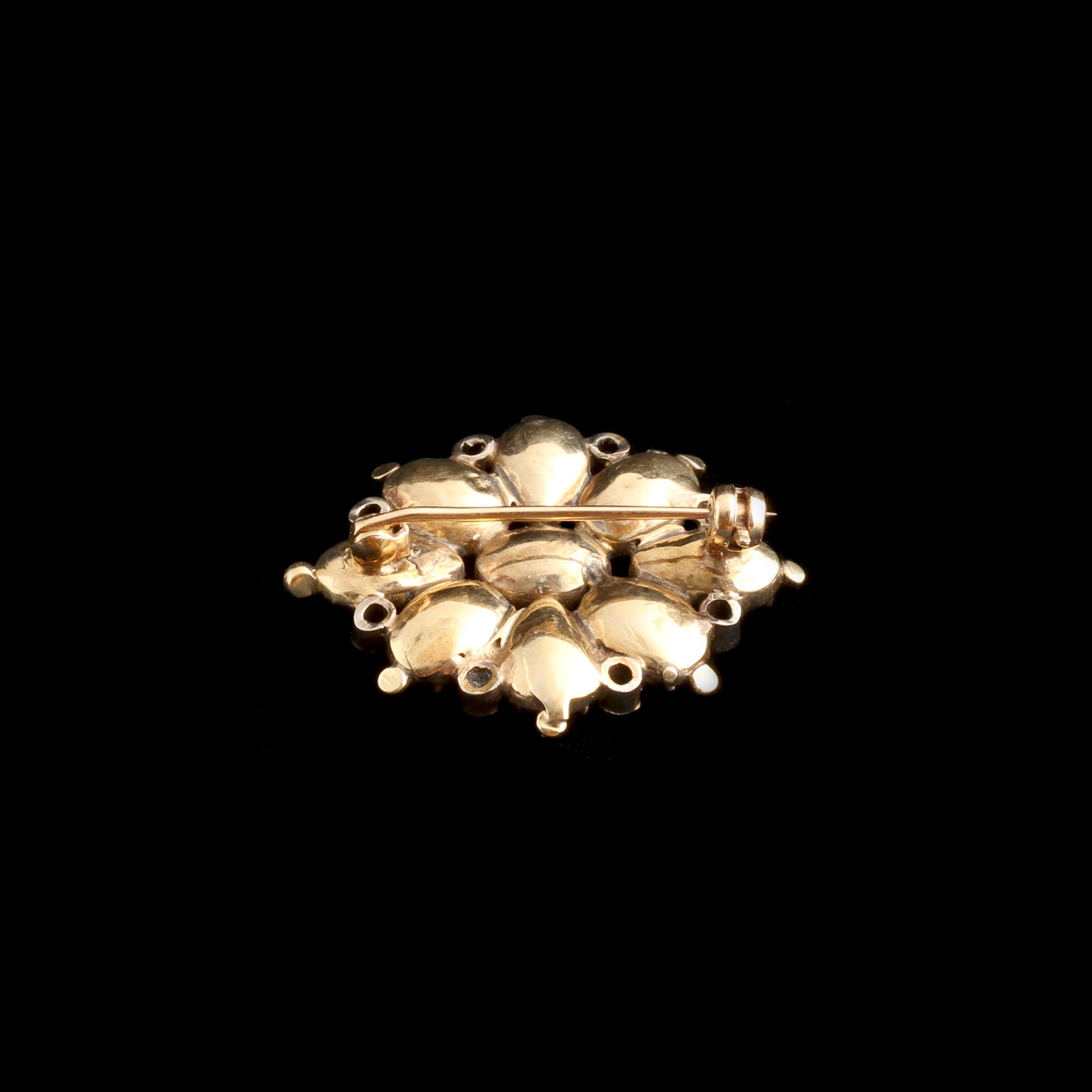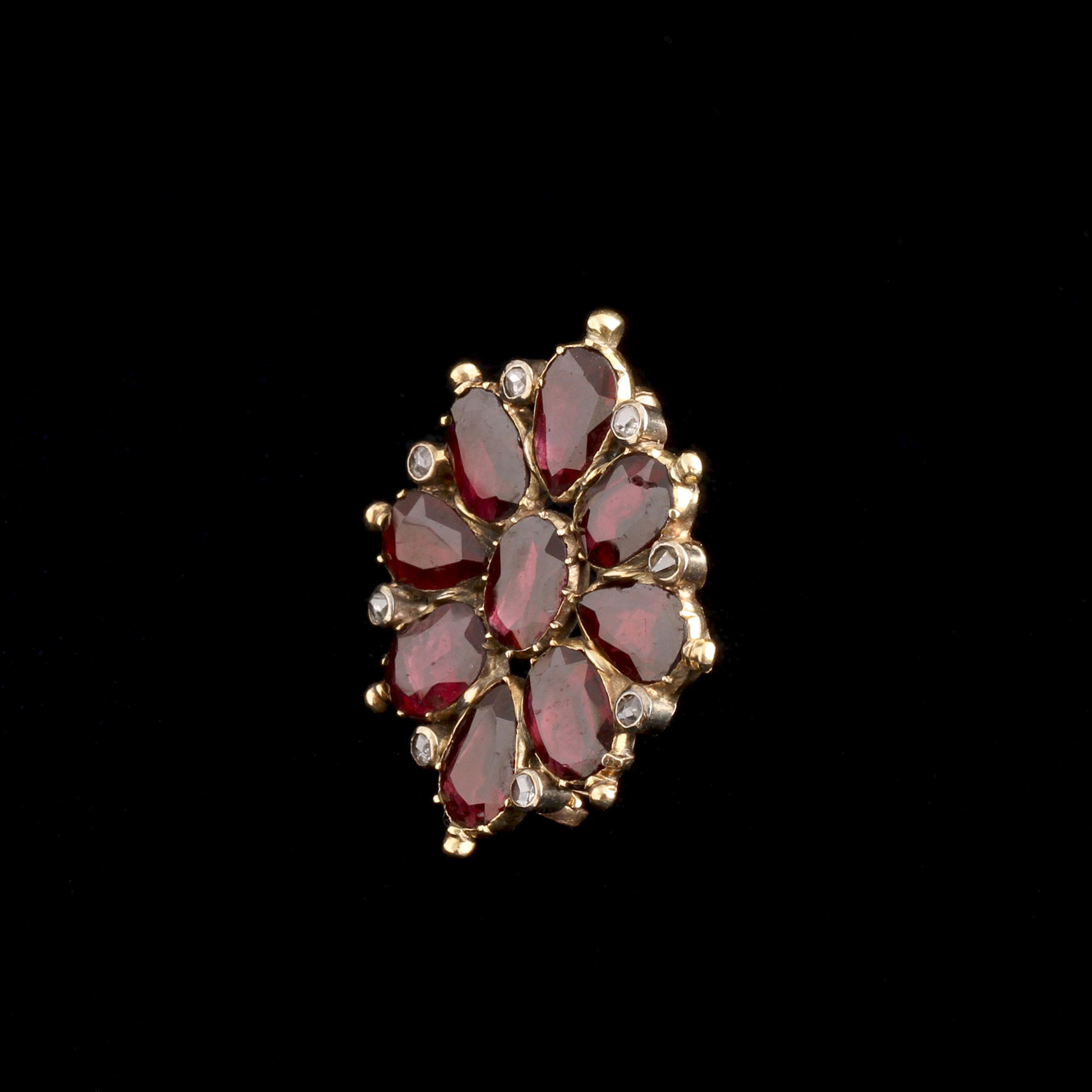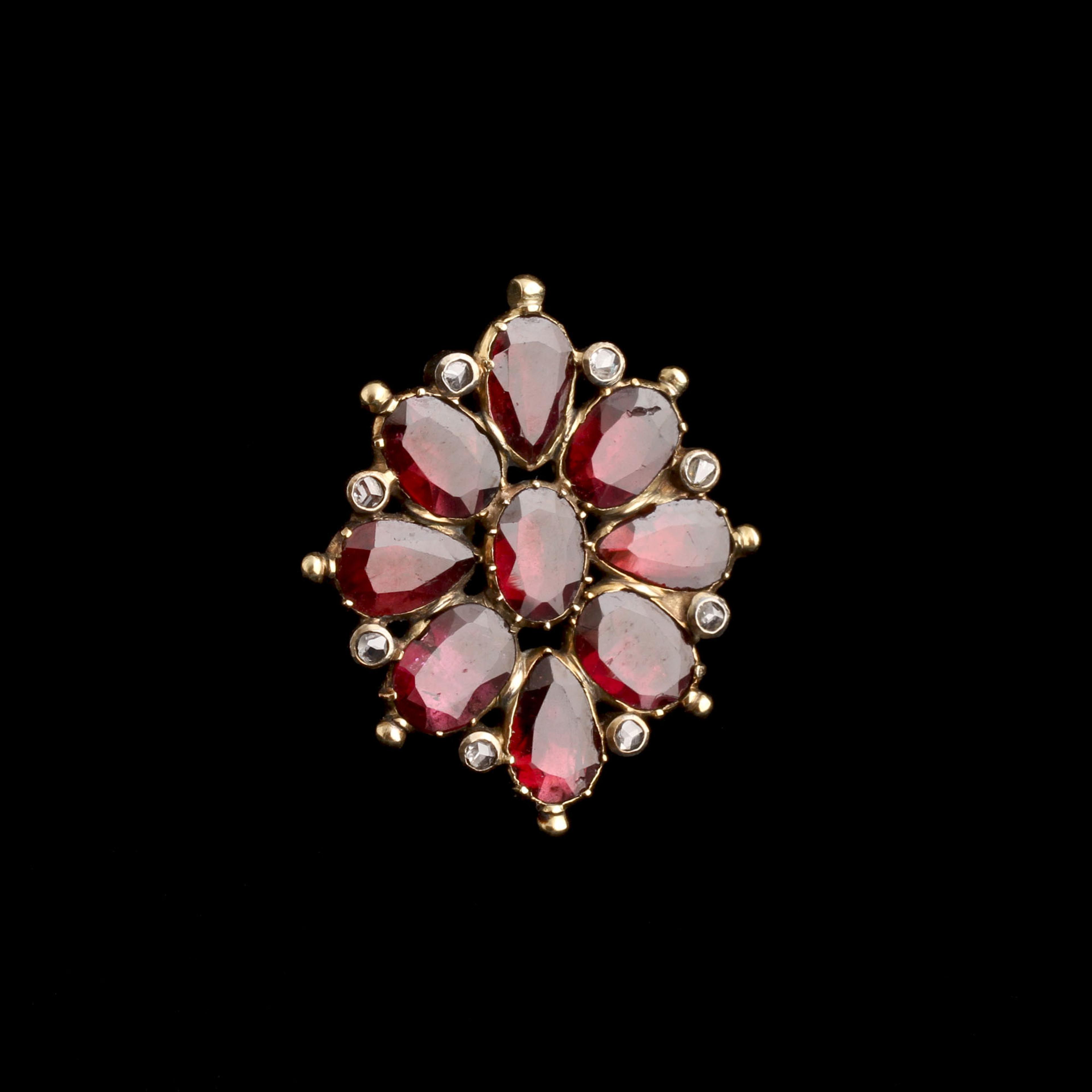 A vibrant Georgian cluster brooch modeled in gold with a mix of oval and pear-shaped flat cut garnets haloed by bright rose cut diamonds.
