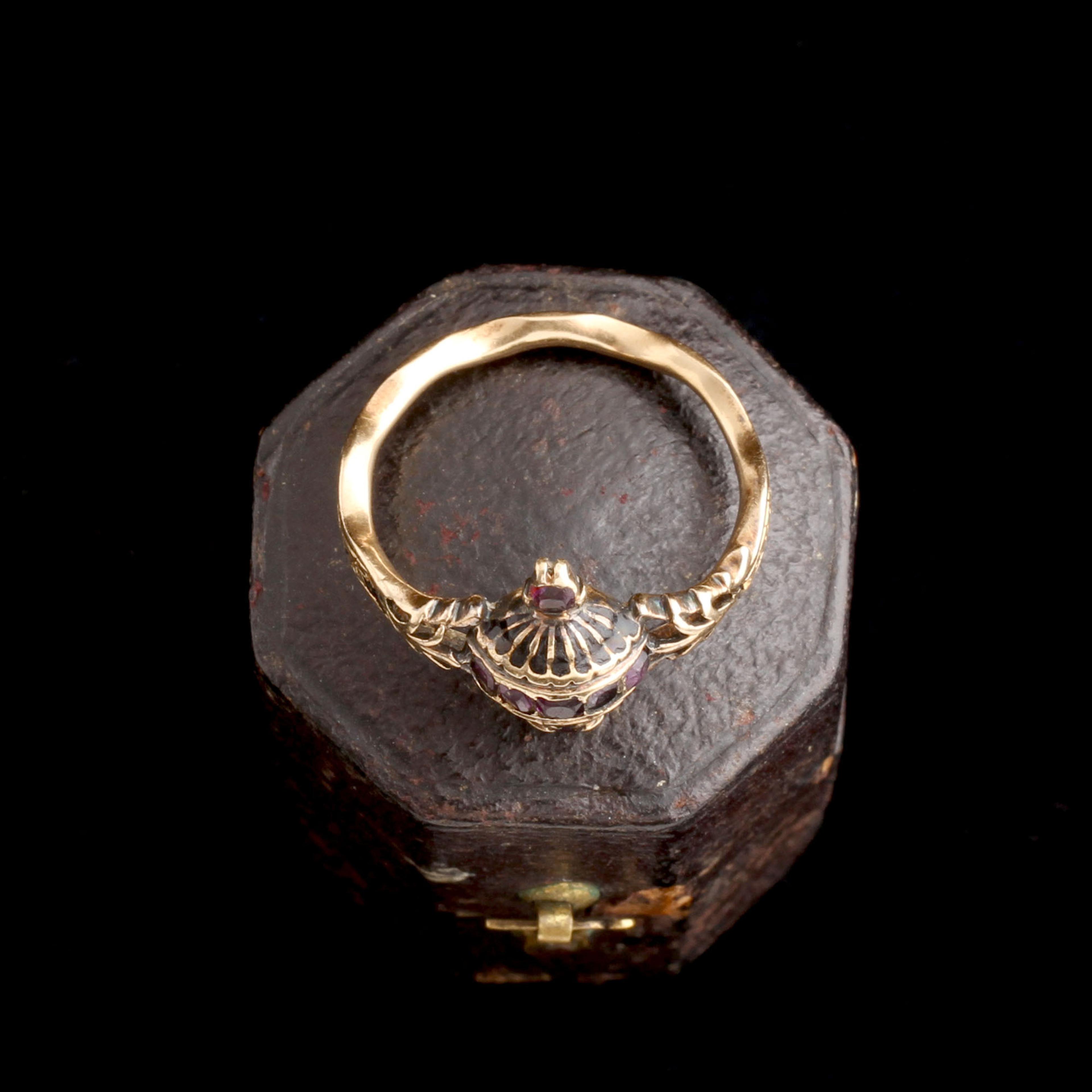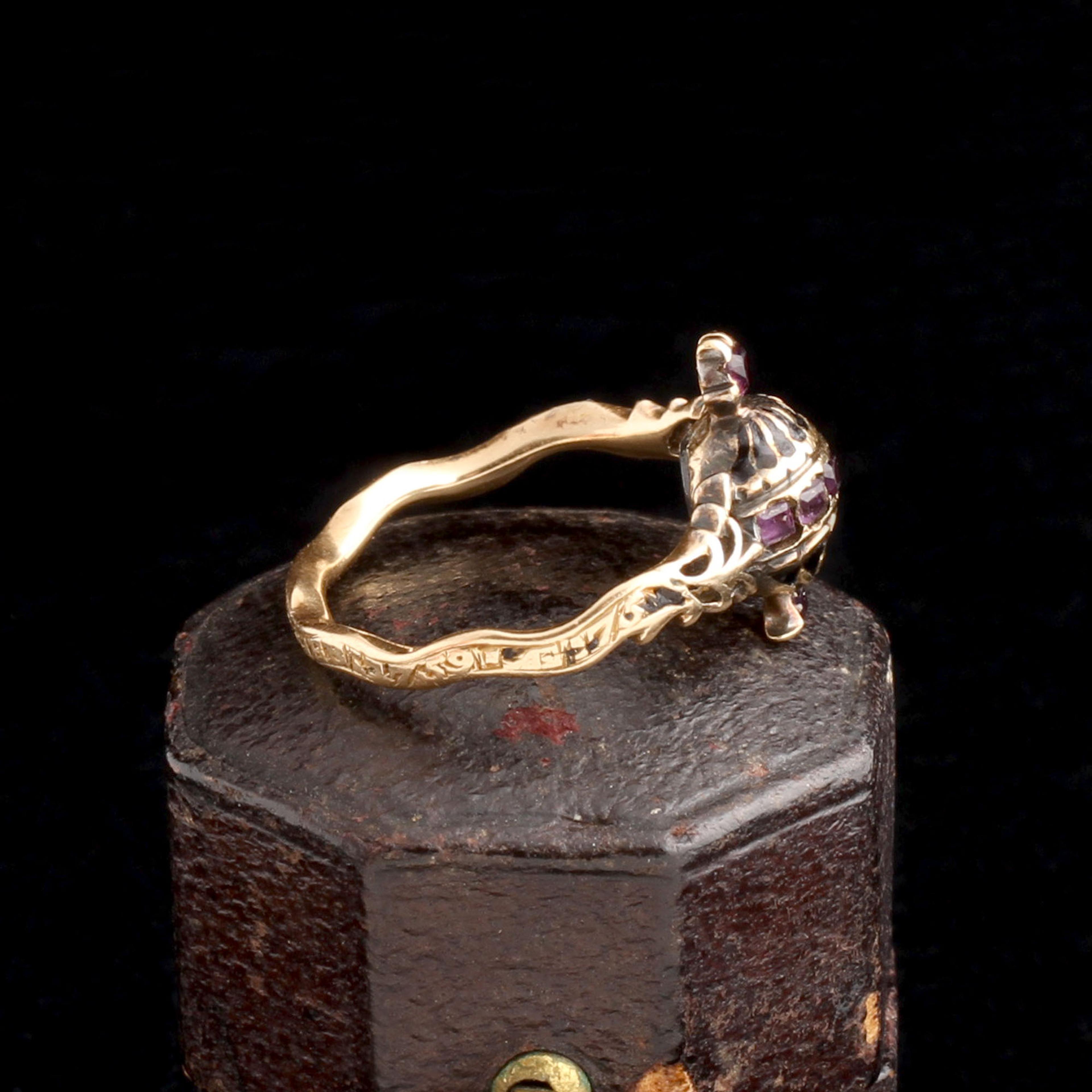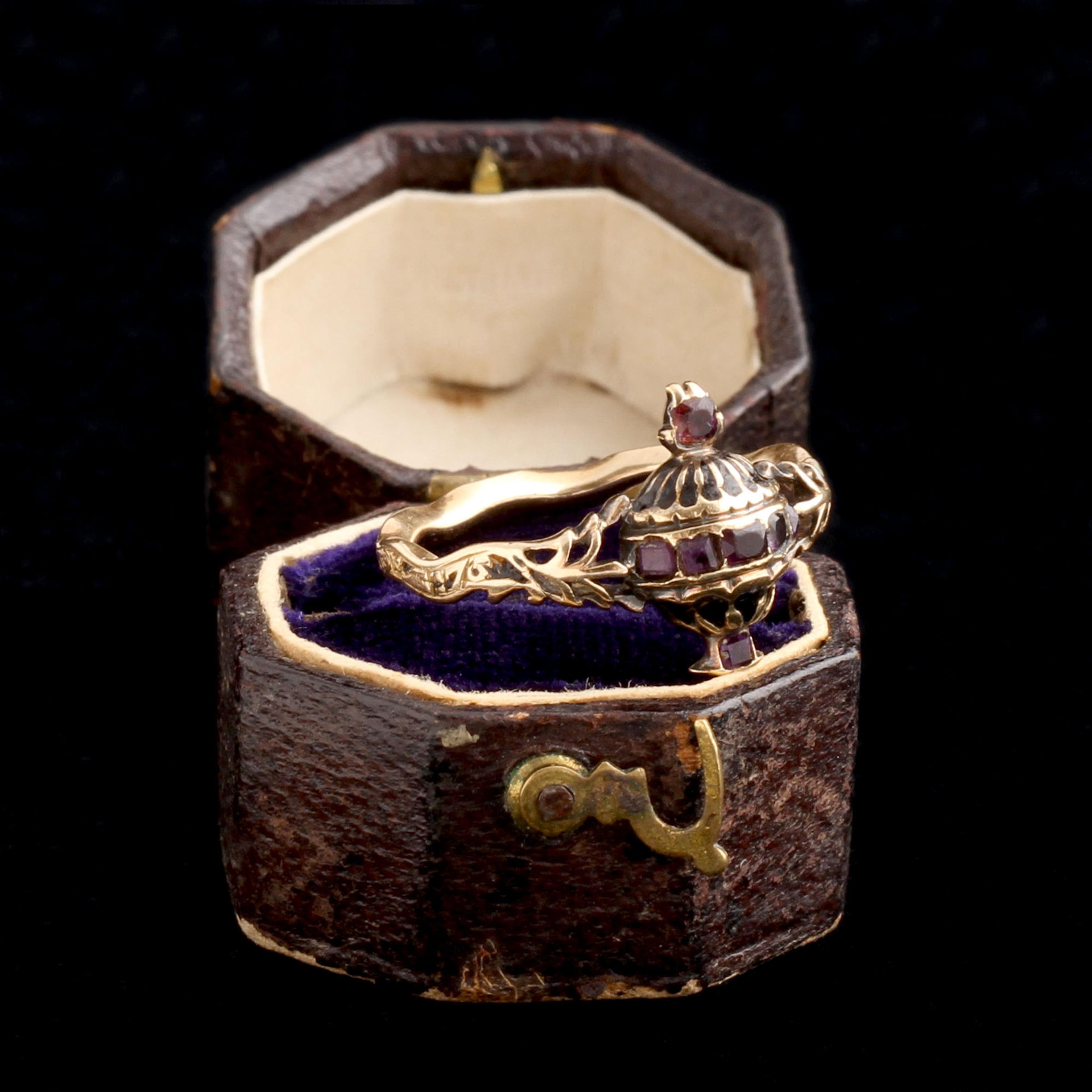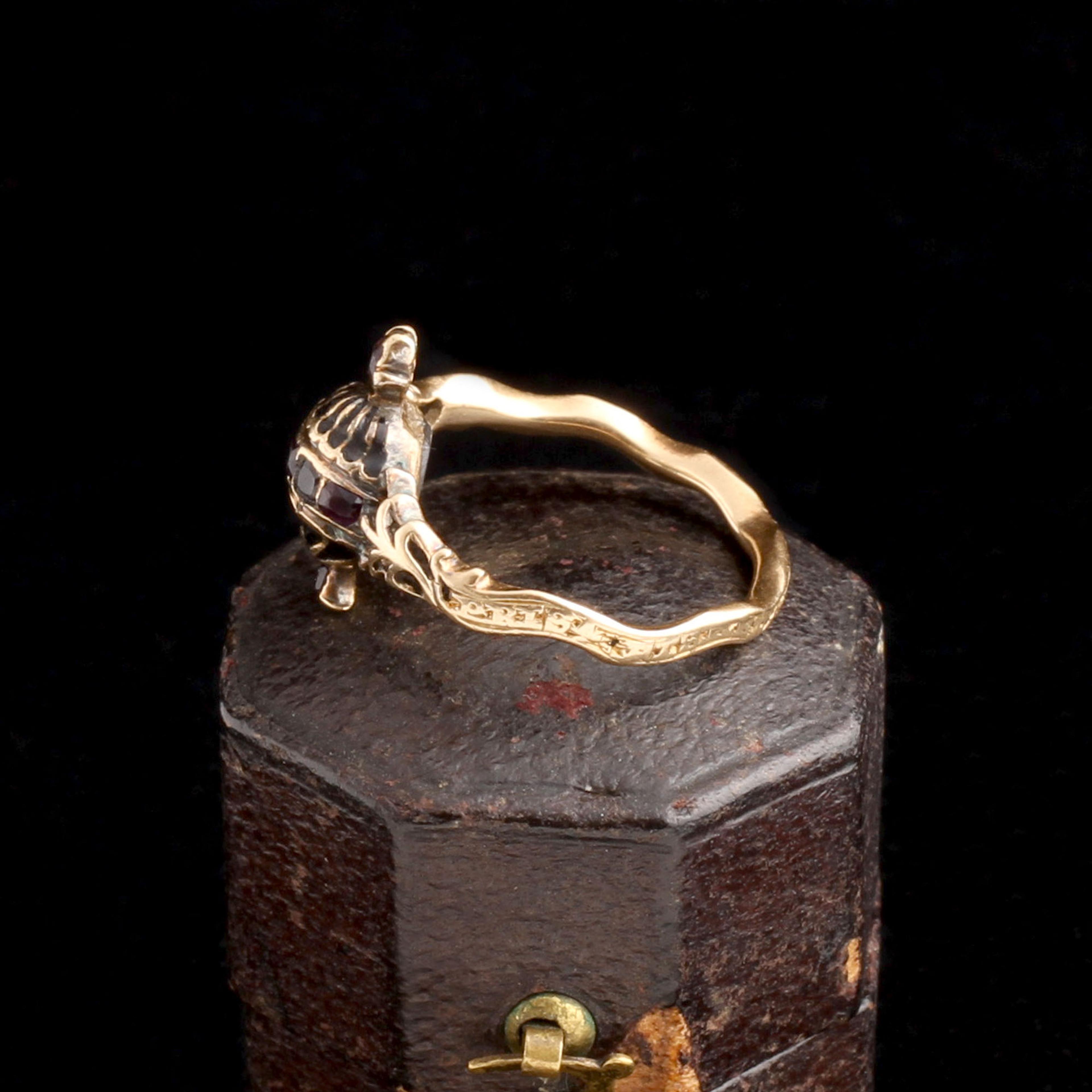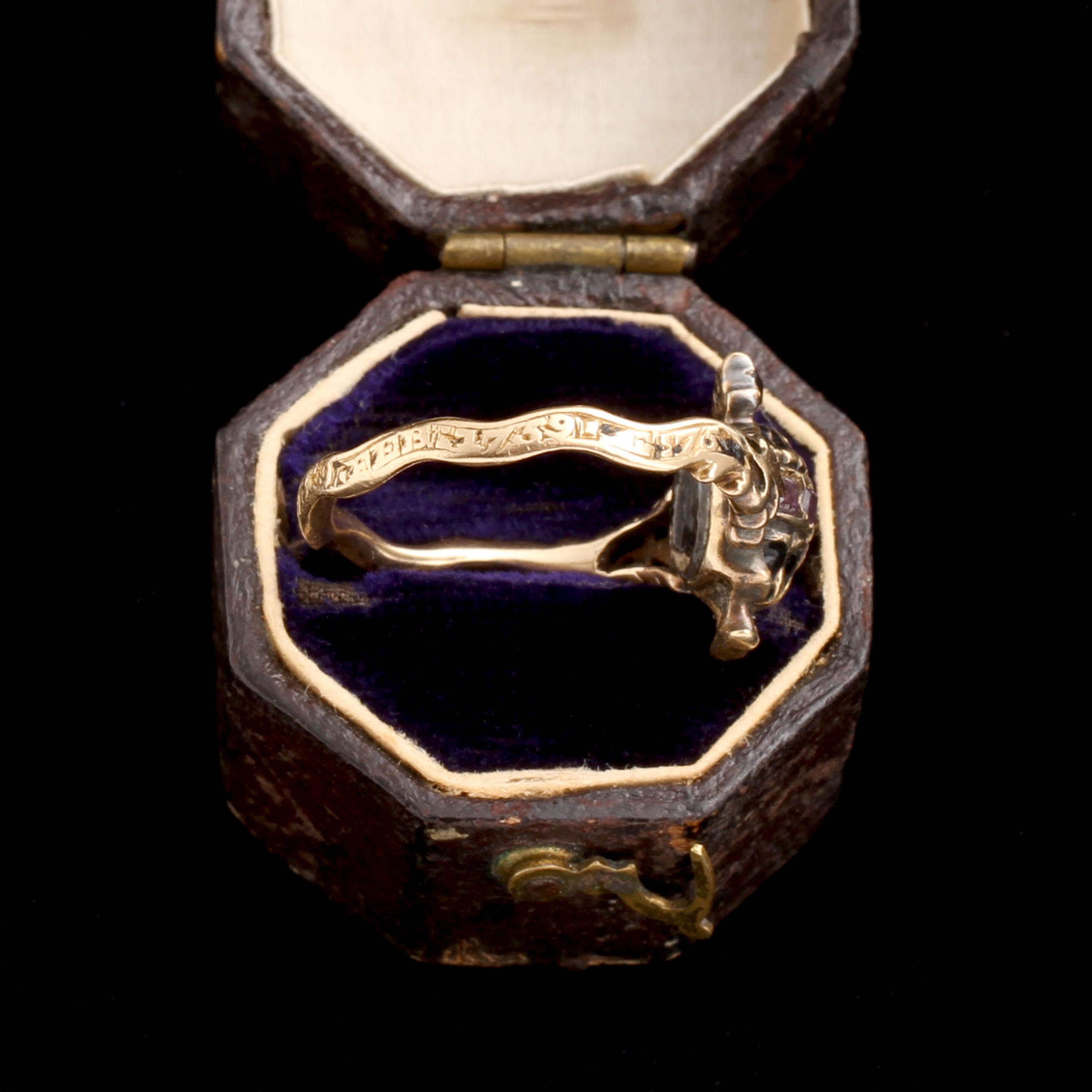 This ring, dedicated in 1759, is a stunning example of 18th-century memorial jewelry. It features an urn decorated with black enamel and flat cut amethysts. The inscription around the hoop reads "Pris Fisker Ob 9 Feb 17 1759 Ae 75," commemorating the long life of a woman who must have seen a thing or two. The use of expensive materials reflects her family's wealthy status.