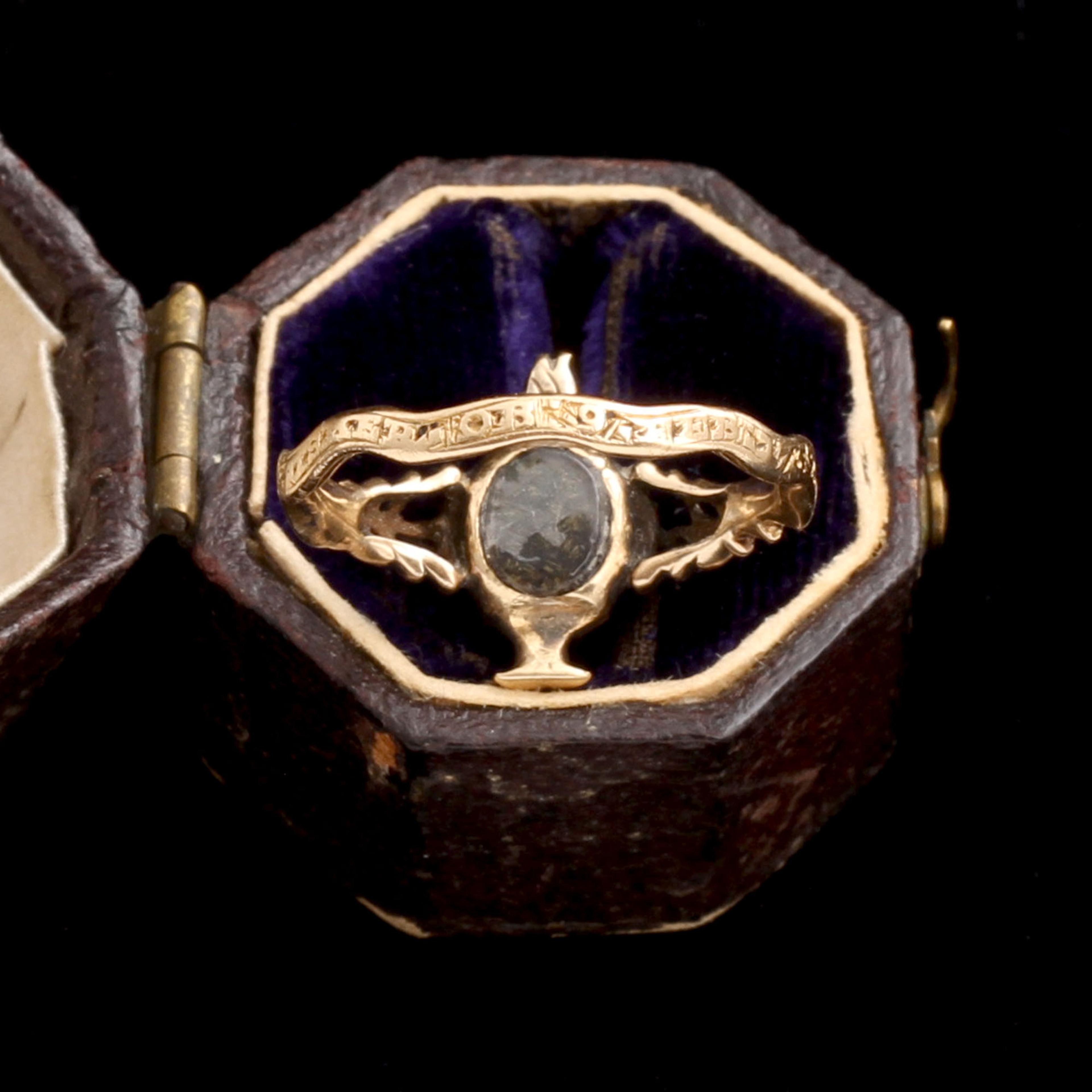 The boat-shaped marquise diamond cut was developed around this time, supposedly to imitate the smile of Louis XV’s mistress, the marquise de Pompadour. Paste — an imitation gemstone made from leaded glass — was newly developed in the 18th century, and set into jewelry with the same creativity and care as its more precious counterparts. Real and imitation gems were almost always set in closed-backed settings, lined on the underside with thin sheets of foil to enhance the color of the stone and highlight it's sparkle. This makes Georgian rings tough for modern women to wear, especially on an everyday basis: genteel, jewelry-owning ladies of the 18th century were not famous for working with their hands like we are. Nor did they wash their hands as much as we do. Water will virtually ruin a foiled setting, so take special care with your Georgian ring. Very little jewelry from this period is still in circulation, and it's very difficult to repair.