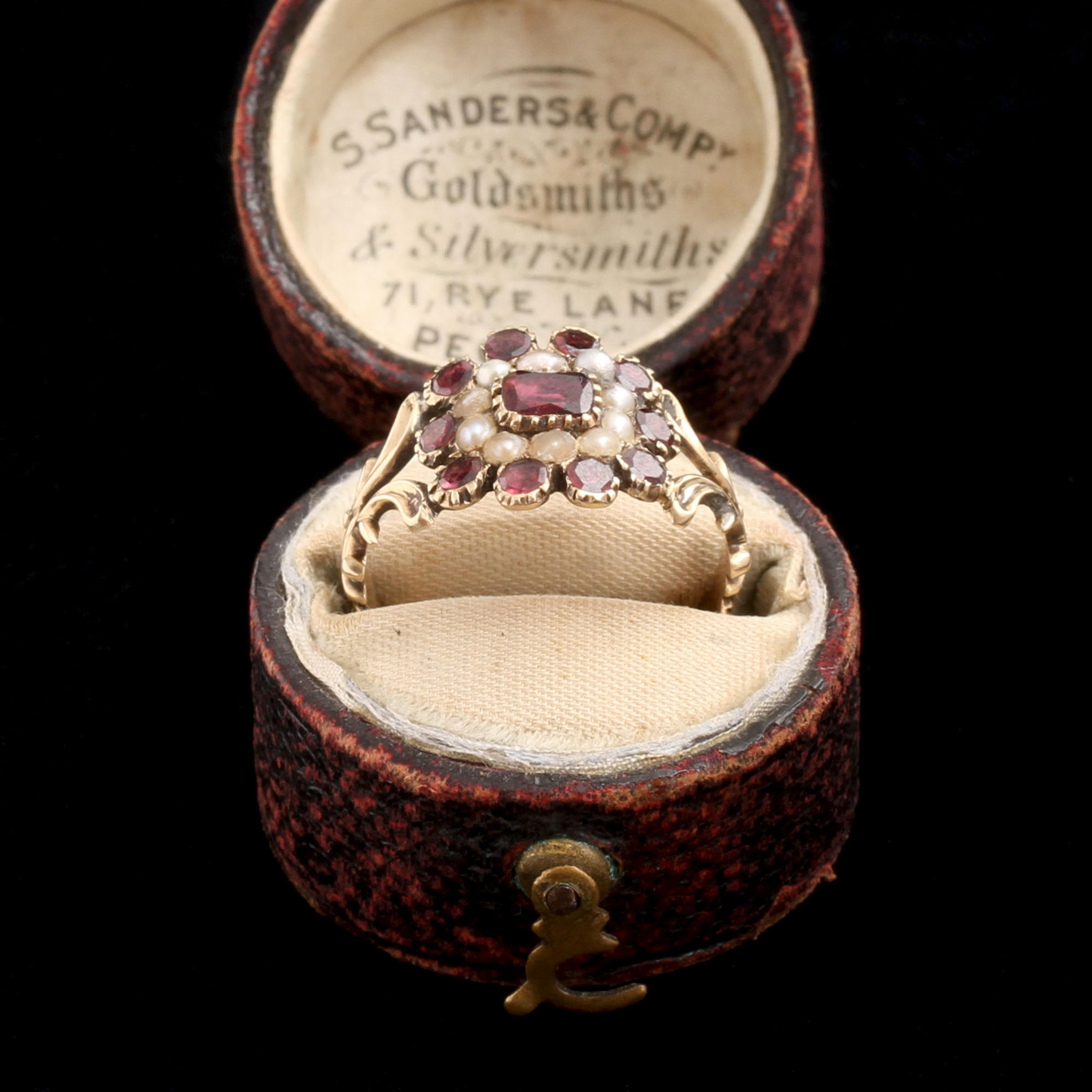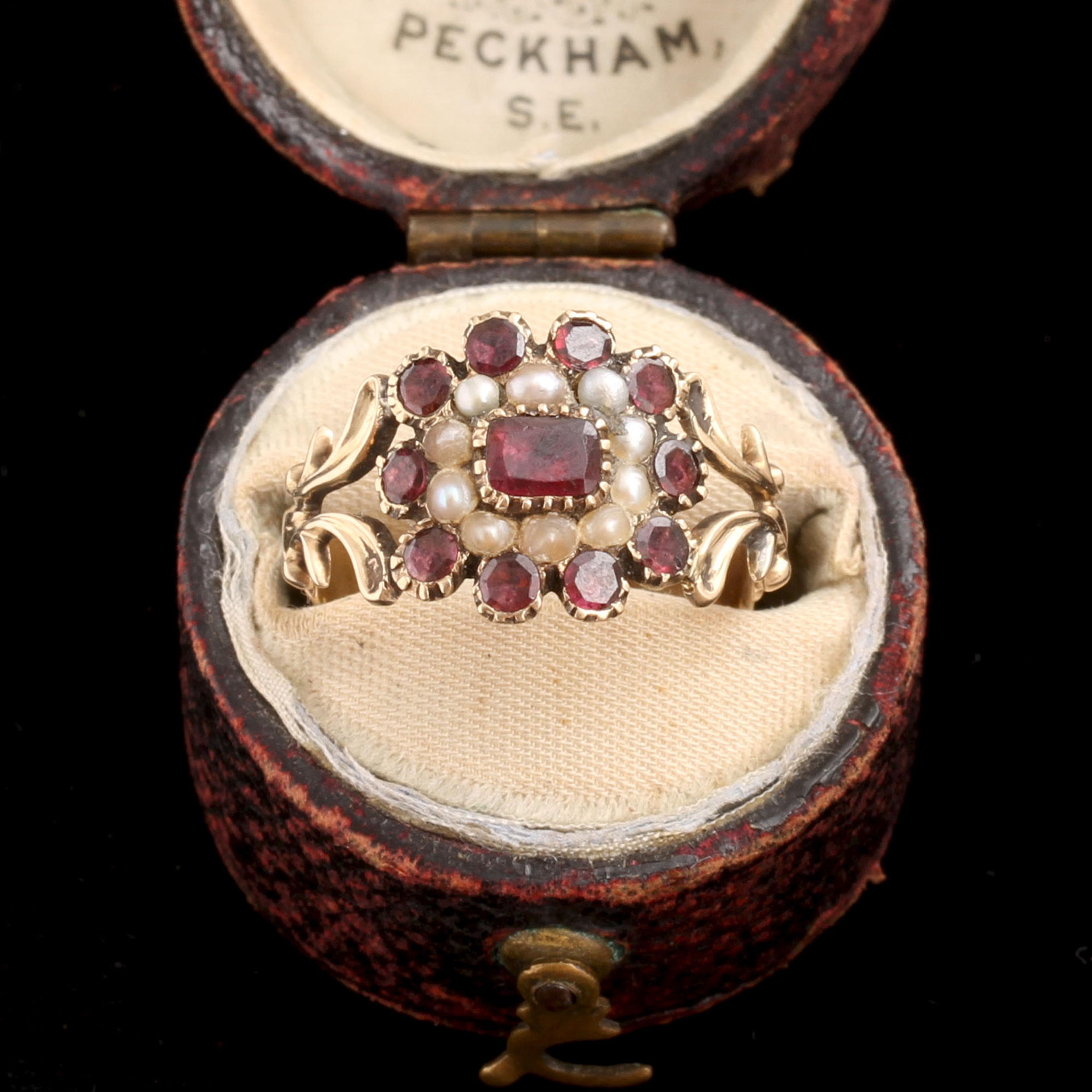 This classic Georgian ring is rendered in gold with ornate split shoulders and a cluster face composed of seed pearls and fiery flat cut garnets.