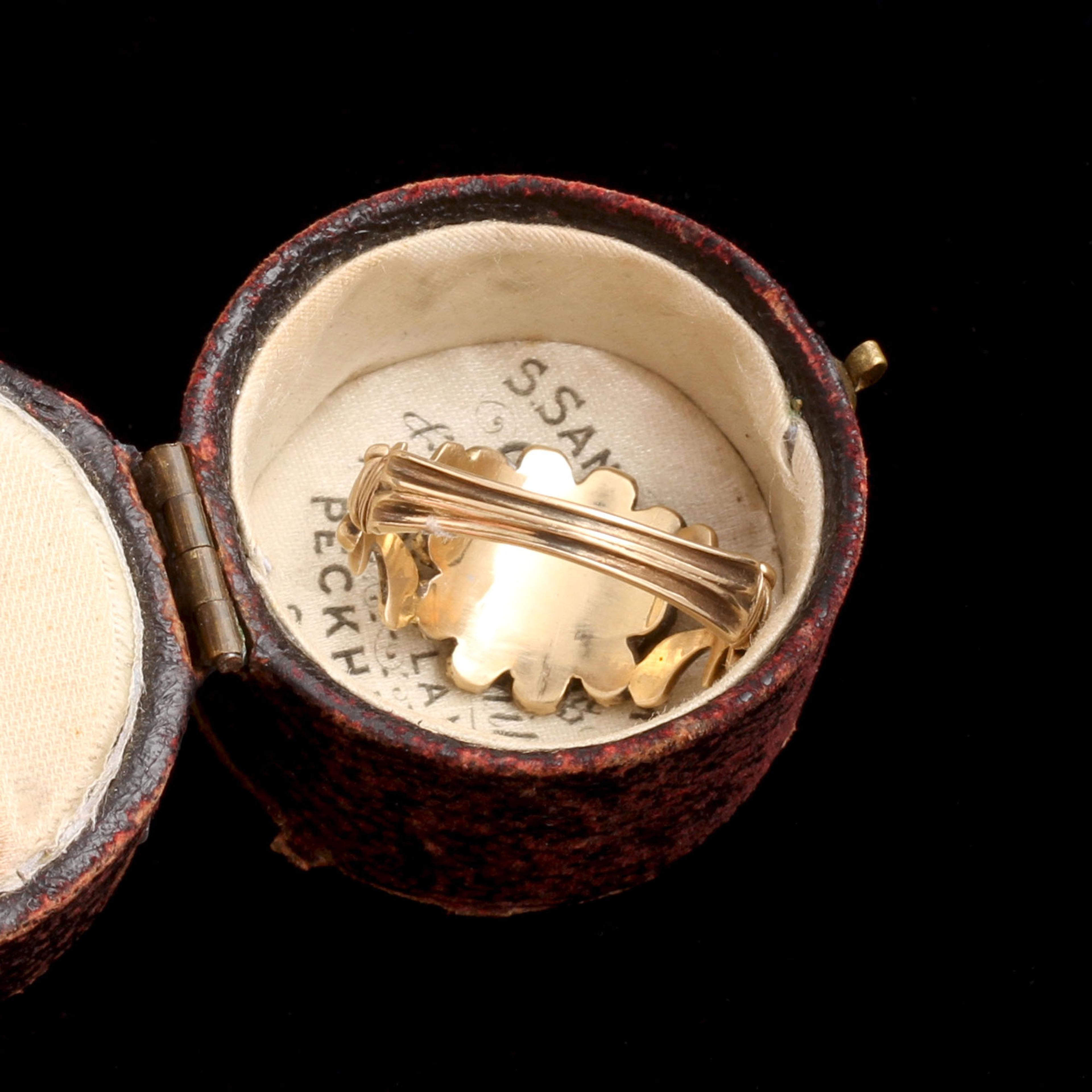 The boat-shaped marquise diamond cut was developed around this time, supposedly to imitate the smile of Louis XV’s mistress, the marquise de Pompadour. Paste — an imitation gemstone made from leaded glass — was newly developed in the 18th century, and set into jewelry with the same creativity and care as its more precious counterparts. Real and imitation gems were almost always set in closed-backed settings, lined on the underside with thin sheets of foil to enhance the color of the stone and highlight it's sparkle. This makes Georgian rings tough for modern women to wear, especially on an everyday basis: genteel, jewelry-owning ladies of the 18th century were not famous for working with their hands like we are. Nor did they wash their hands as much as we do. Water will virtually ruin a foiled setting, so take special care with your Georgian ring. Very little jewelry from this period is still in circulation, and it's very difficult to repair.