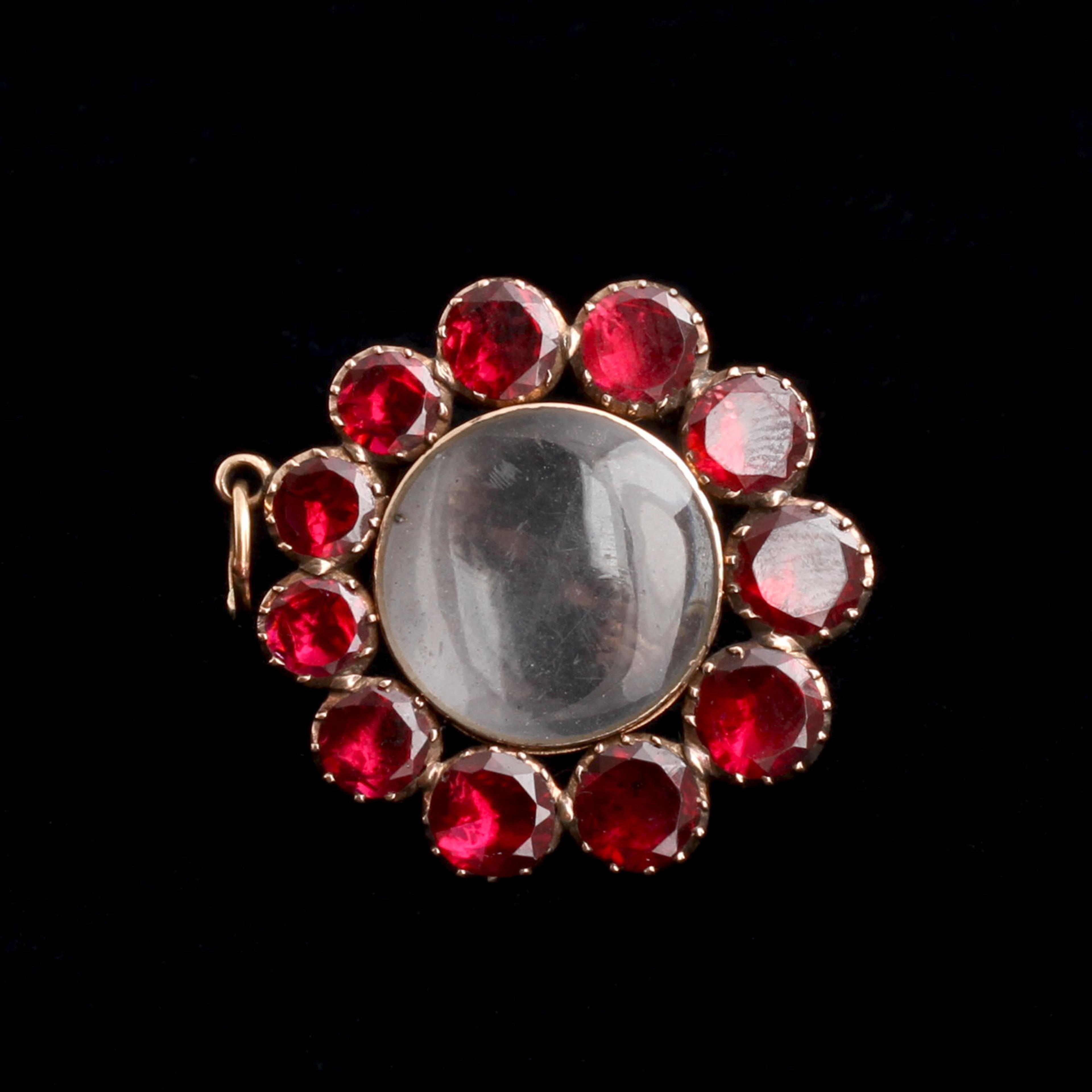 10k gold (tests), flat cut garnets, glass lenses, steel pin