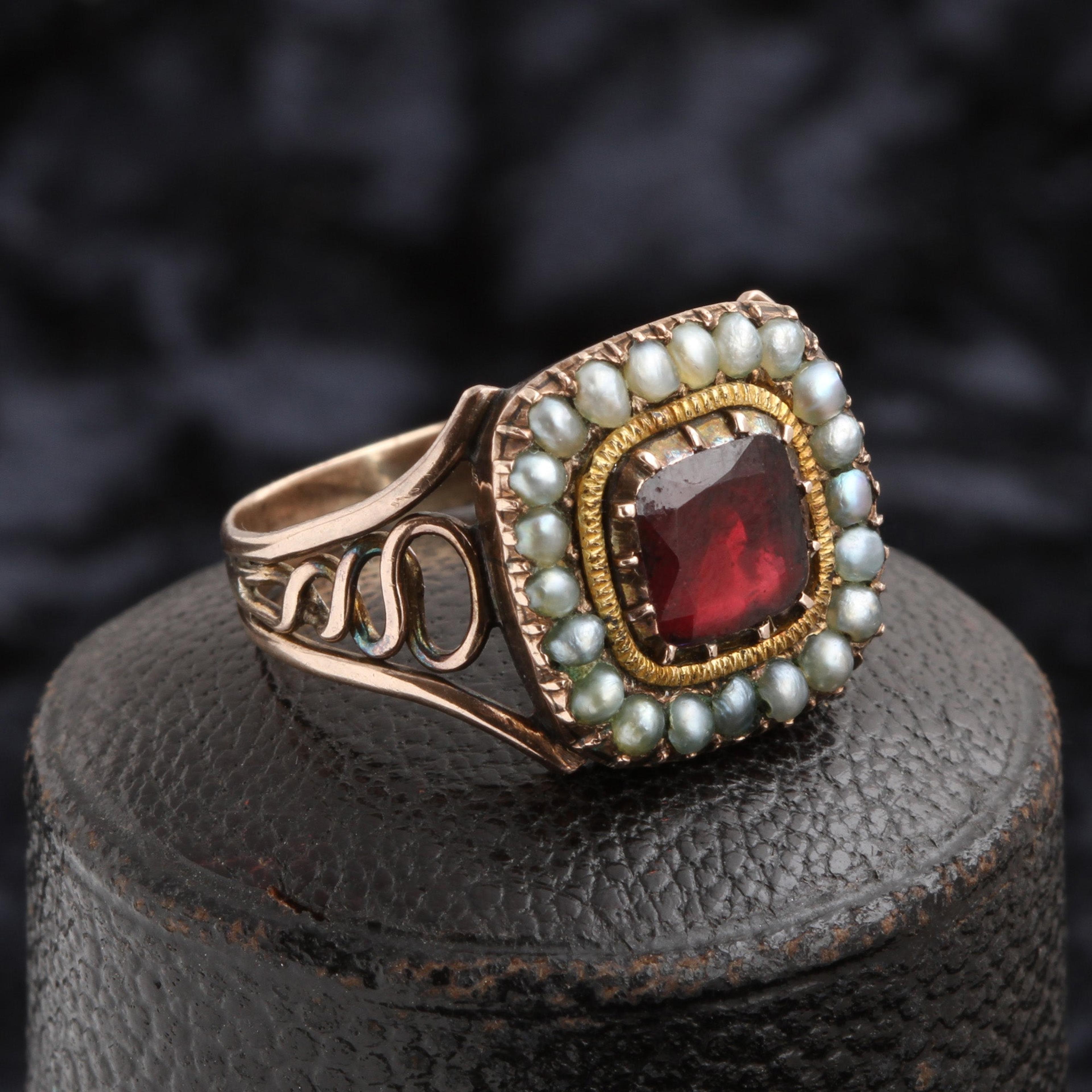 A classic late Georgian ring with a square cluster head composed of lustrous pearls and a flat cut garnet. The ring has split shoulders accented with sinuous twisted wire.