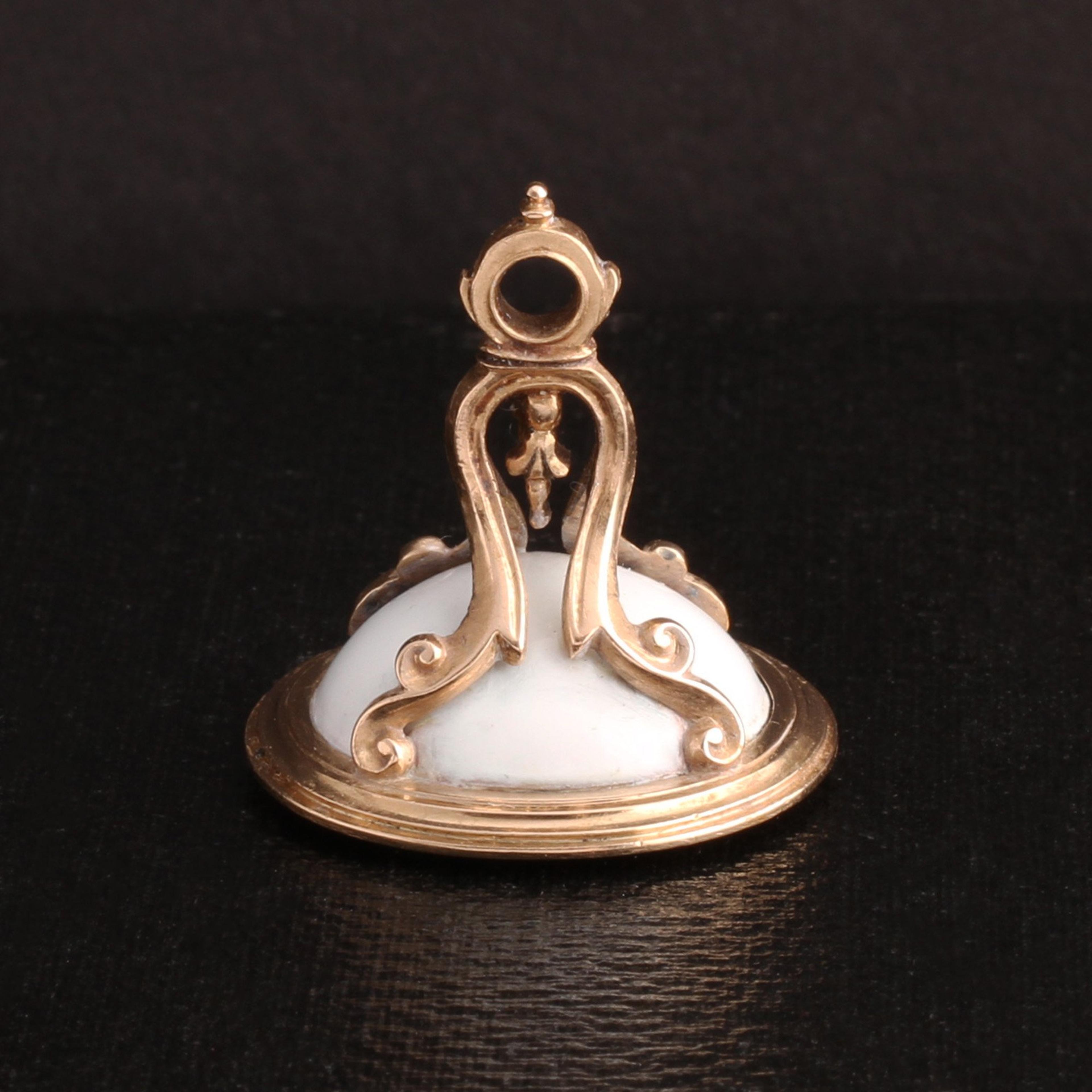 14k gold (tests), white enamel, garnet intaglio