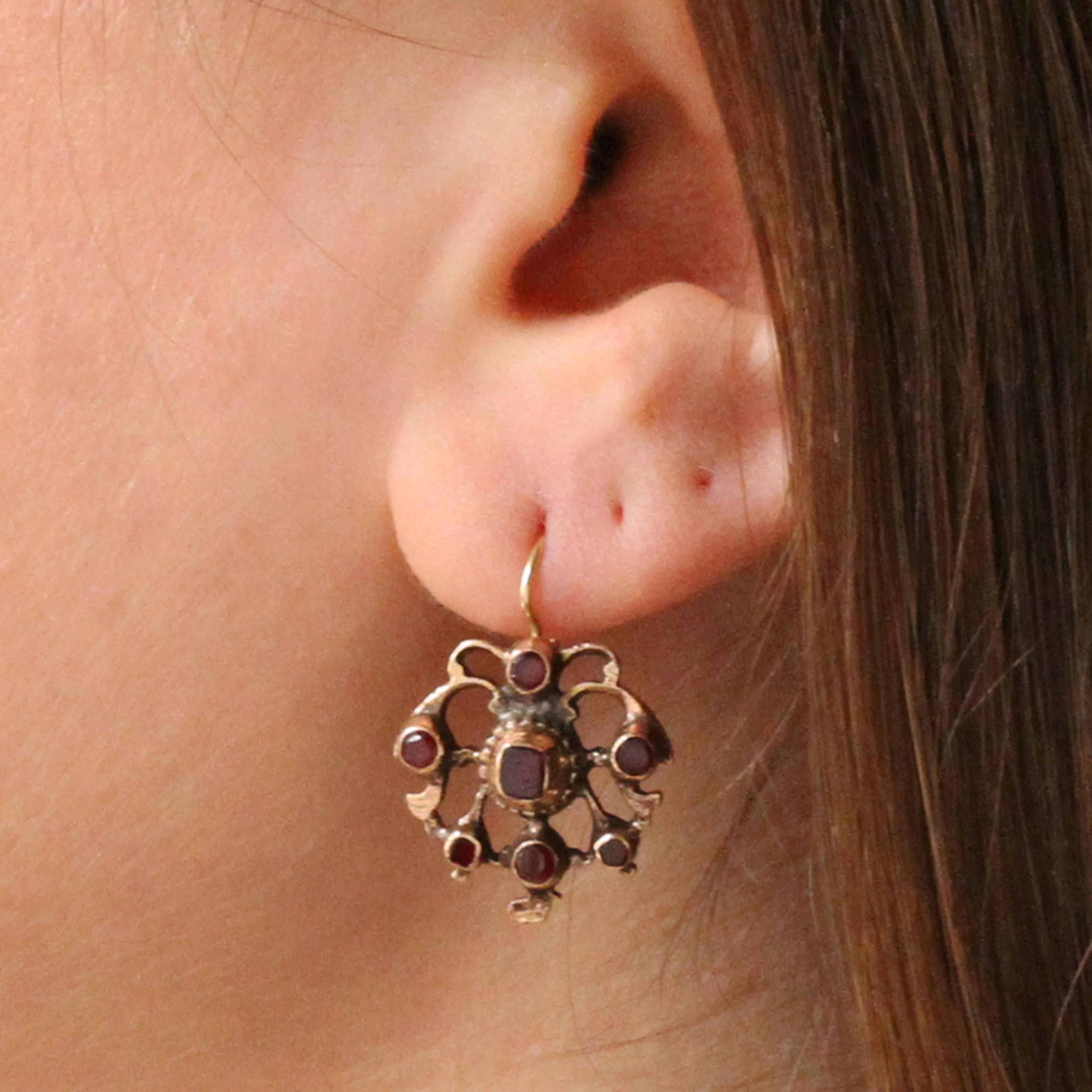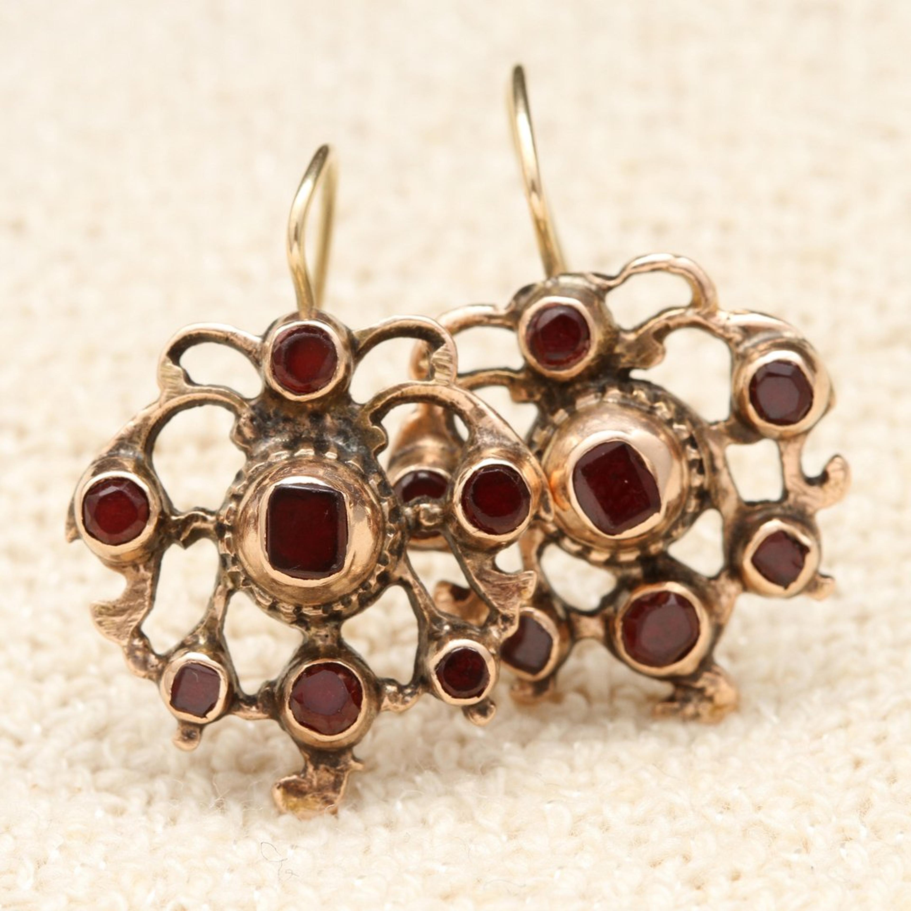 Garnet takes its name from the Latin for grain, so called because the red crystals of the garnet resembled the kernels of the pomegranate. The almandine and pyrope varieties of the gem were the fashionable stone of the 18th and 19th centuries. These flat cut garnets are set in gilt silver and arranged in an organic foliate design. The 9k ear wires were added to the earrings at some point in history; the original fittings would most likely have had thick back to front closures.