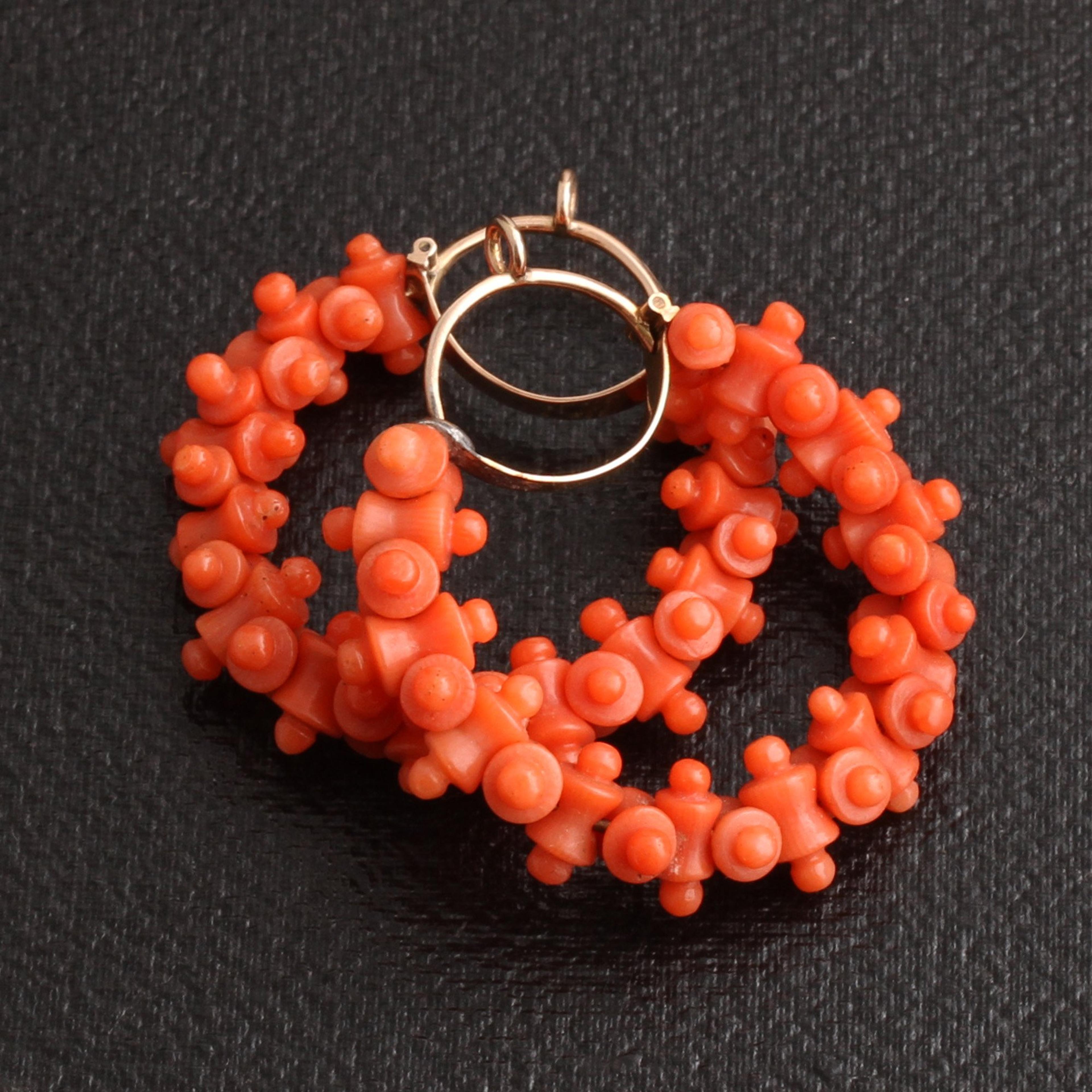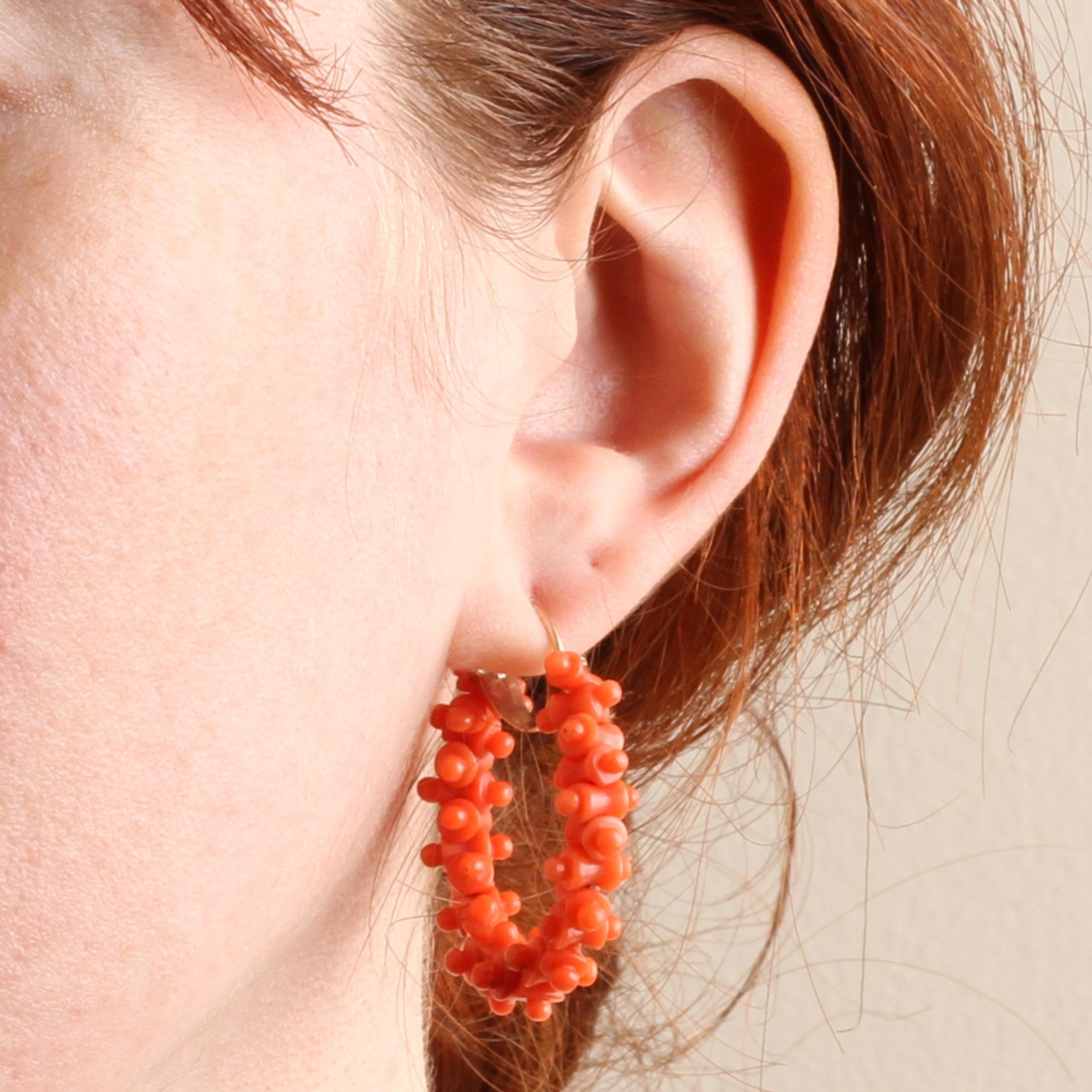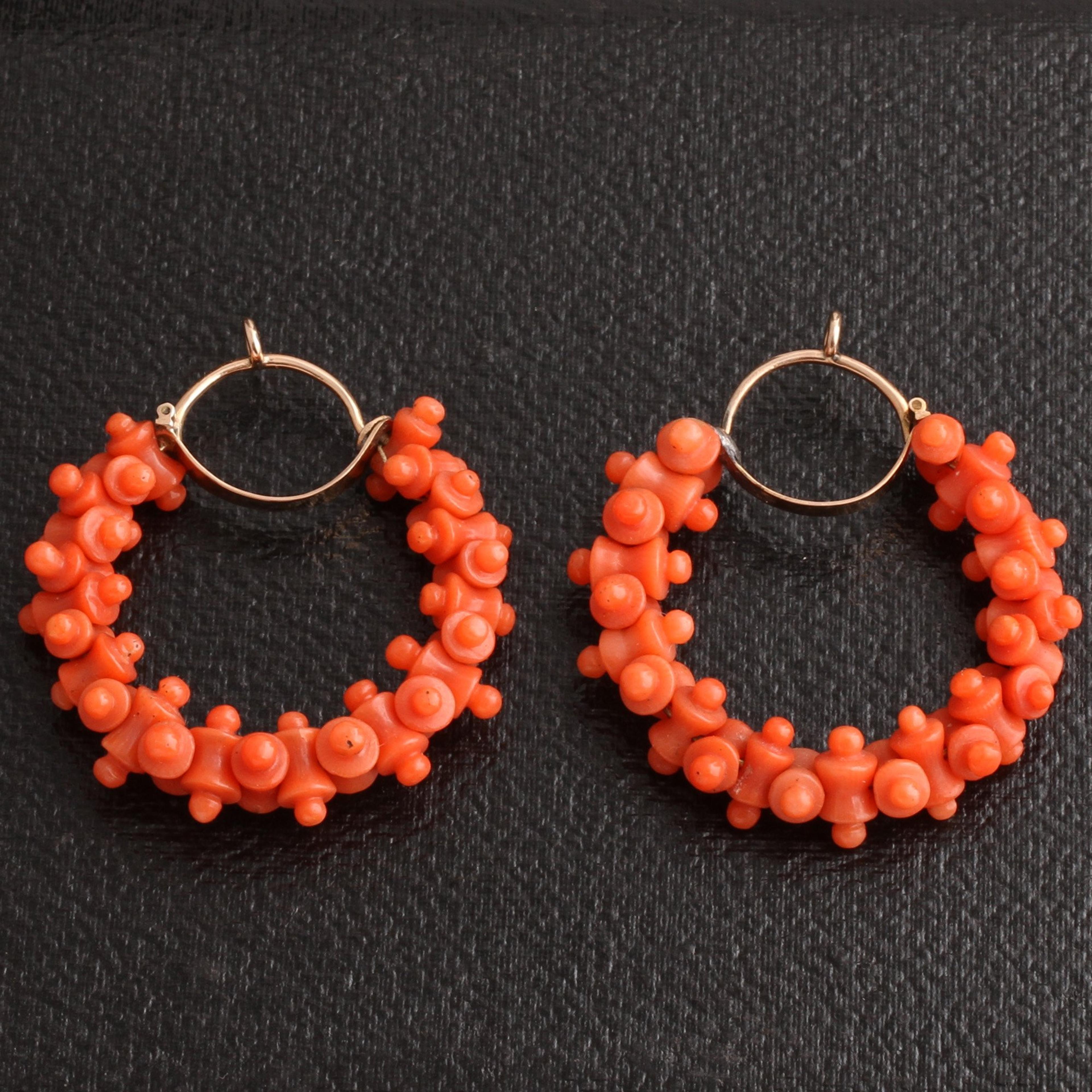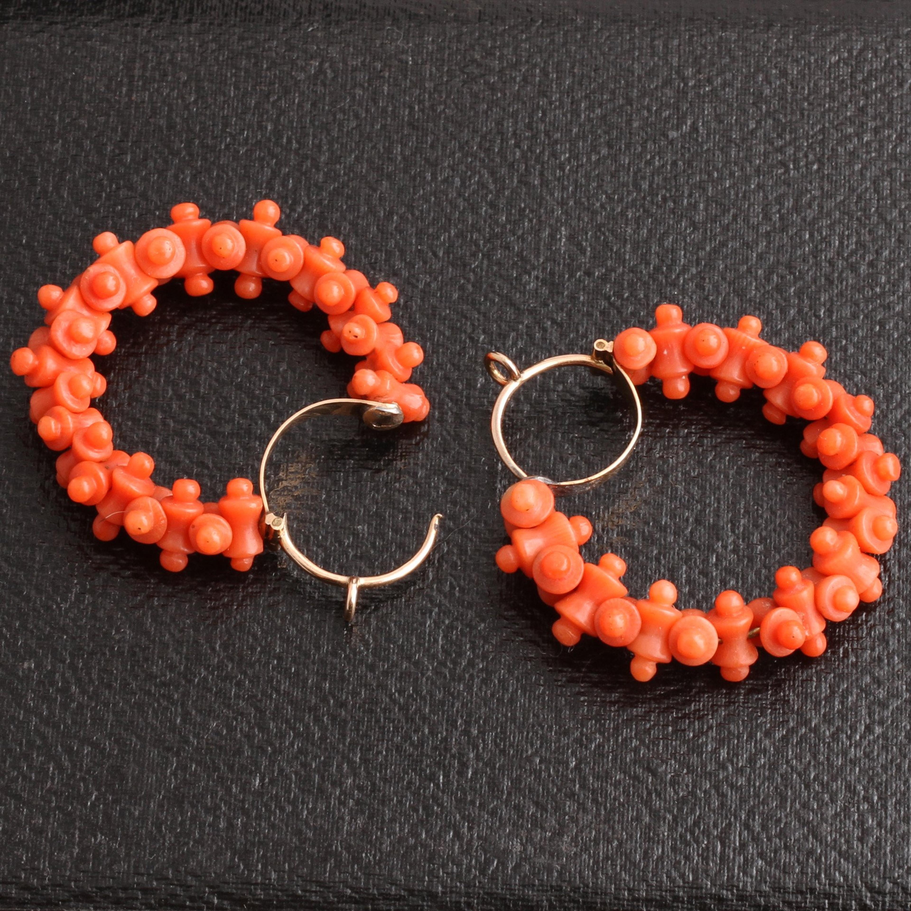 The Grand Tour was an essential undertaking for any English man of means beginning in the 1700s, but it wasn't until the early 1800s with the invention of steam-powered transportation that it became a pursuit open to anyone, including women. The tour typically began in Dover, England and culminated in Italy. Throughout the tour one was supposed to acquire knowledge of language, politics, sport and art and become a generally more well-rounded person of privilege. And on the way, they shopped for souvenirs, often in jewelry form. These outstanding Georgian era hoop earrings feature elaborate carved coral beads strung together and affixed to back to front gold ear wires complete with wig hooks. The style and material of these earrings are clues that tell us that, most likely, these earrings were a souvenir purchased on someone's Italian leg of the Grand Tour in the early 1800s.