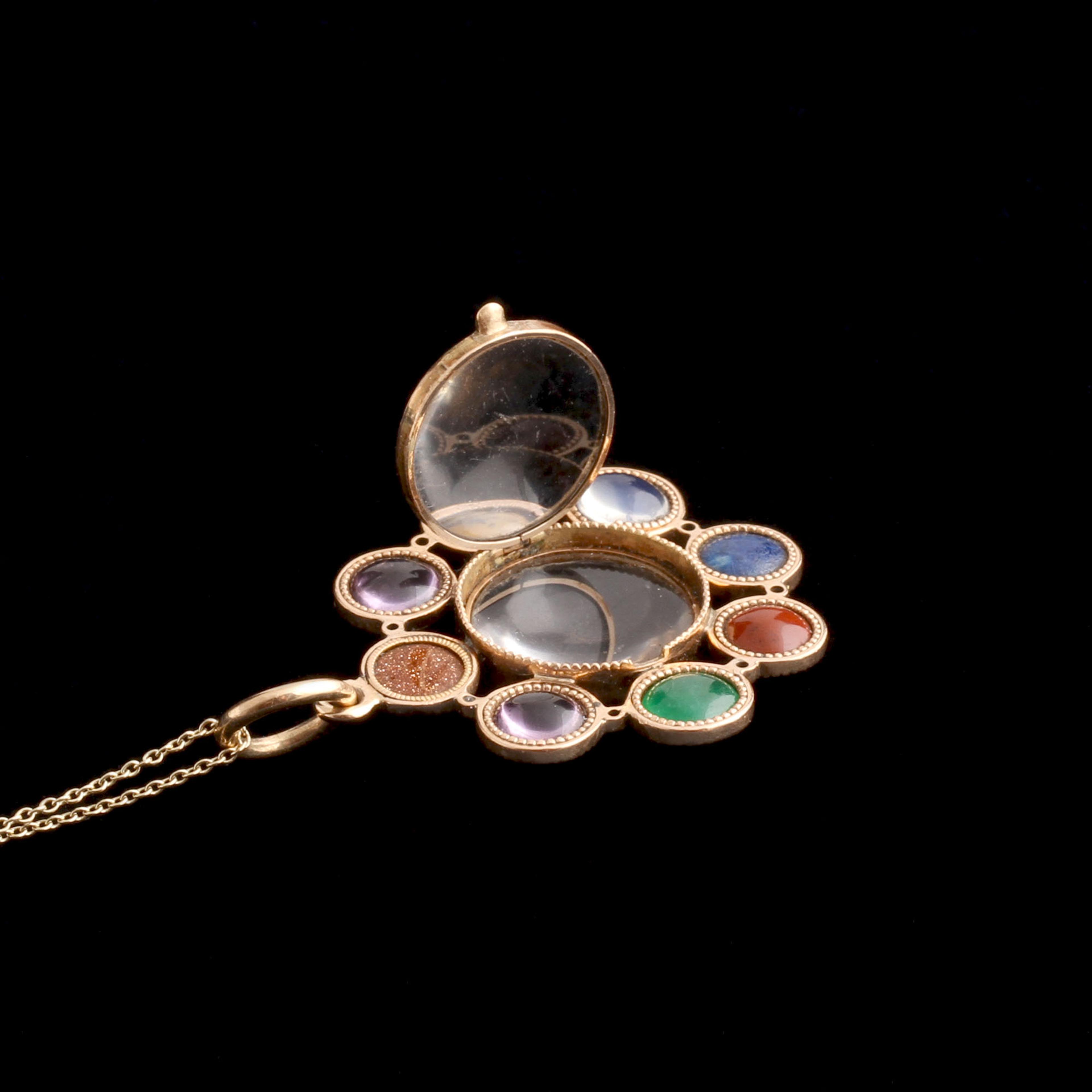A miniature universe of color and light, this Georgian locket may have been conceived as a planetary jewel — each stone representing one of the celestial bodies thought to influence human fate. In the early 19th century, astronomy and astrology were often intertwined, and jewels like this echoed the heavens in their design. The eight gem cabochons encircle a central rock crystal locket like planets orbiting a sun: goldstone, amethyst, green chalcedony, red jasper, lapis lazuli, and jasper, all set in 14k gold. The locket opens to hold a keepsake - a secret world in a cosmic frame.