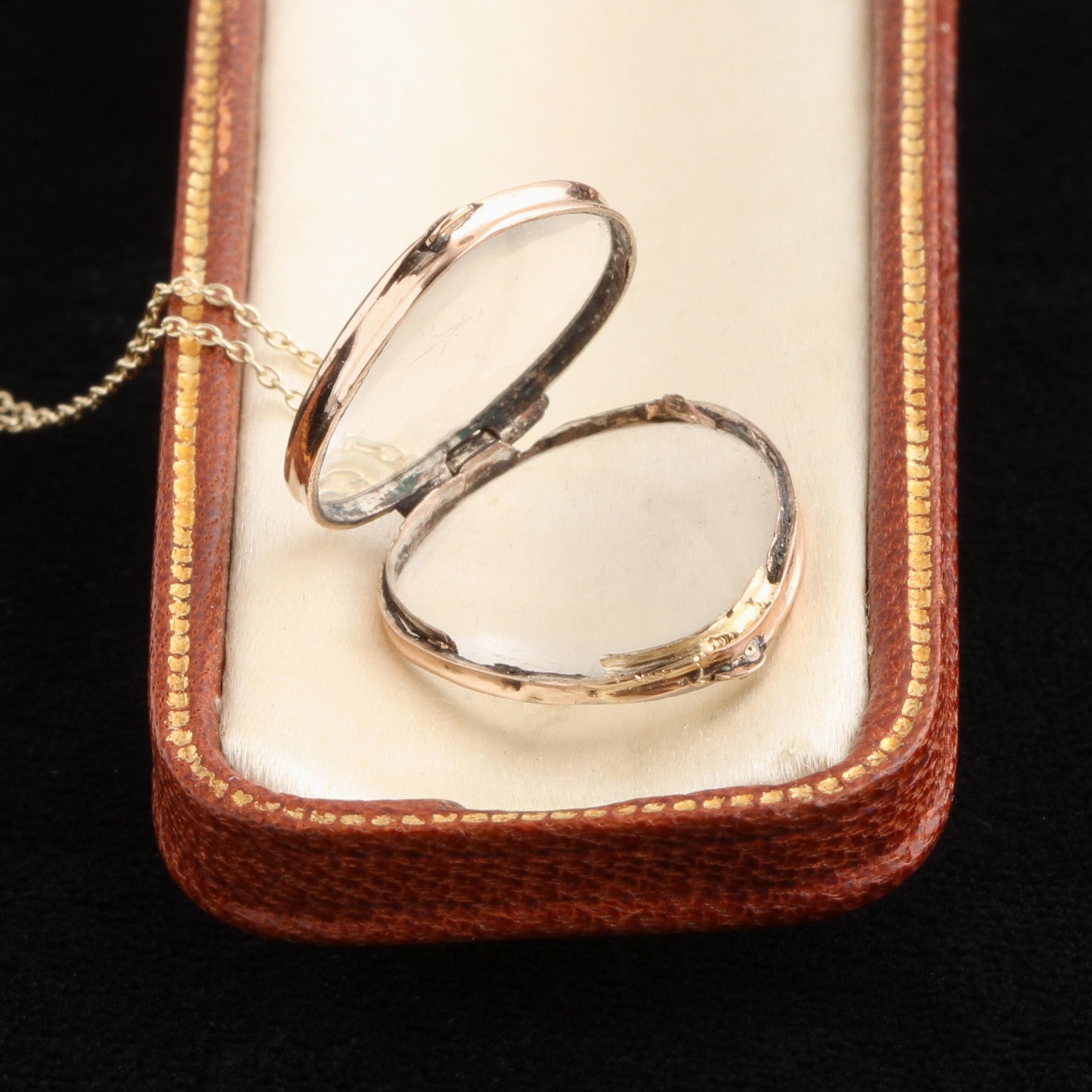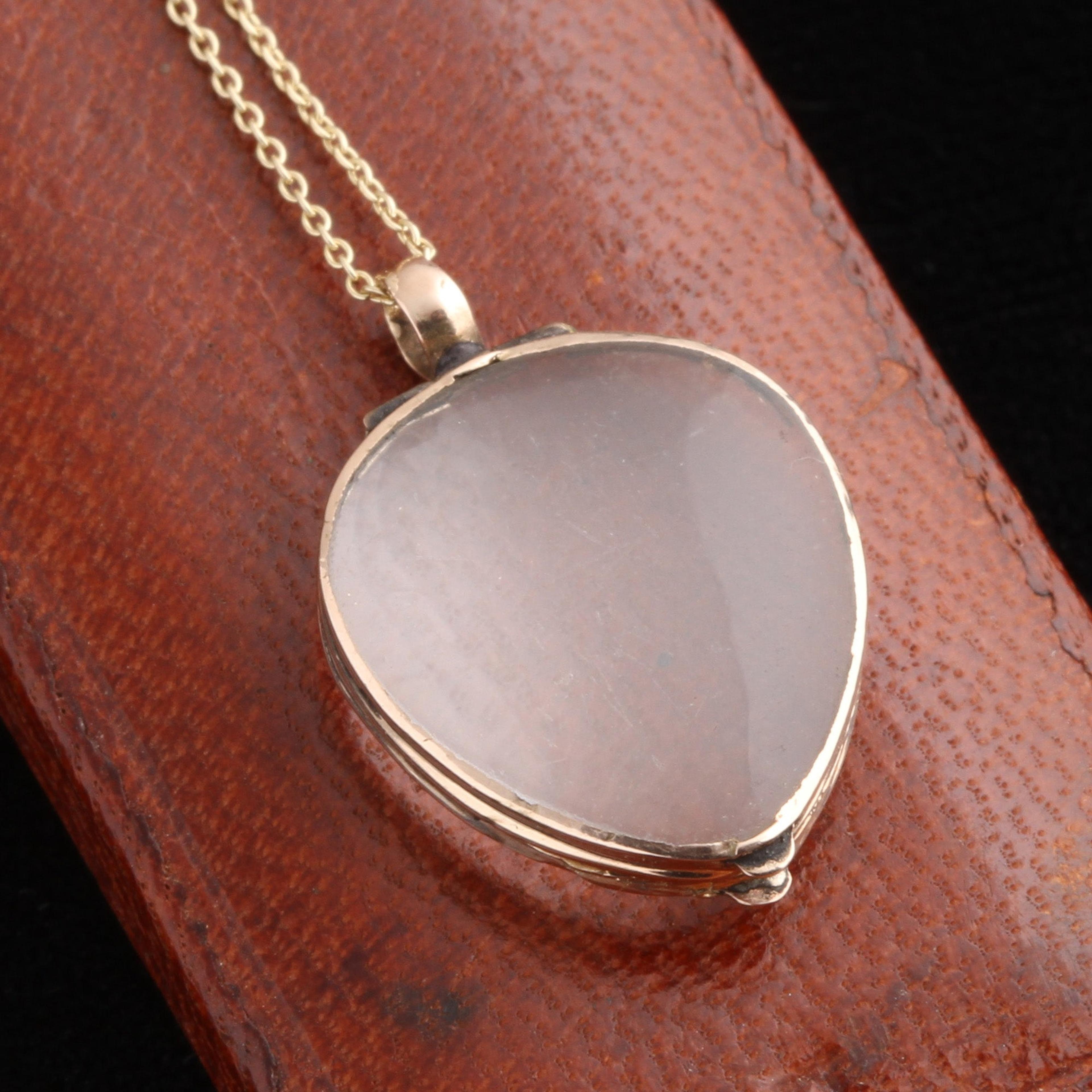 This Georgian locket features two glass panels fashioned in the shape of a “heart.” The locket opens from the bottom and is fitted in gold.