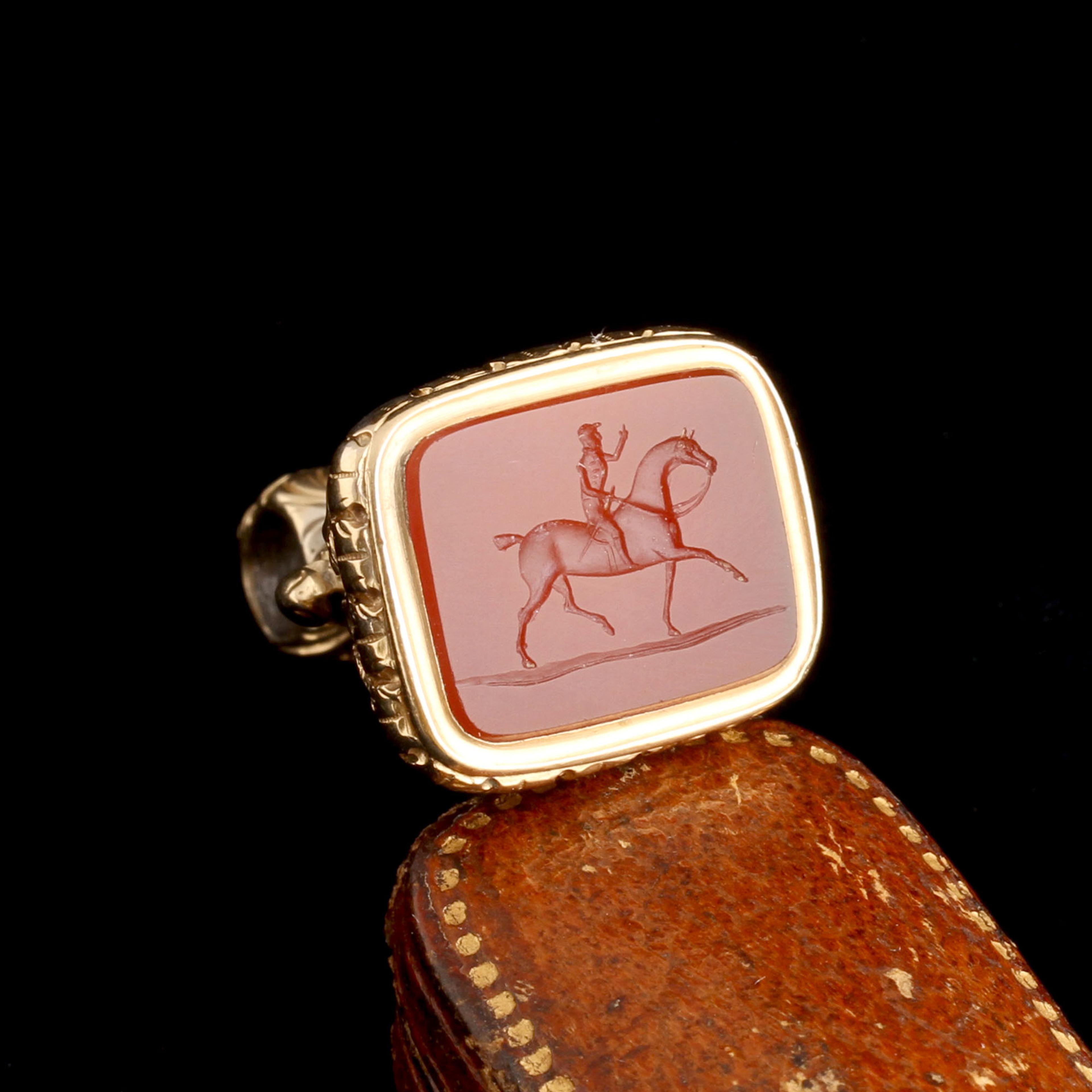 A finely carved carnelian intaglio shows a horse and rider in motion. Set in a gold-cased mount, this piece would once have been worn on a watch chain and pressed into wax to leave its impression on letters and documents. Today, it’s a talisman for anyone who still is in their "horse girl" phase. Do we ever really grow out of it?