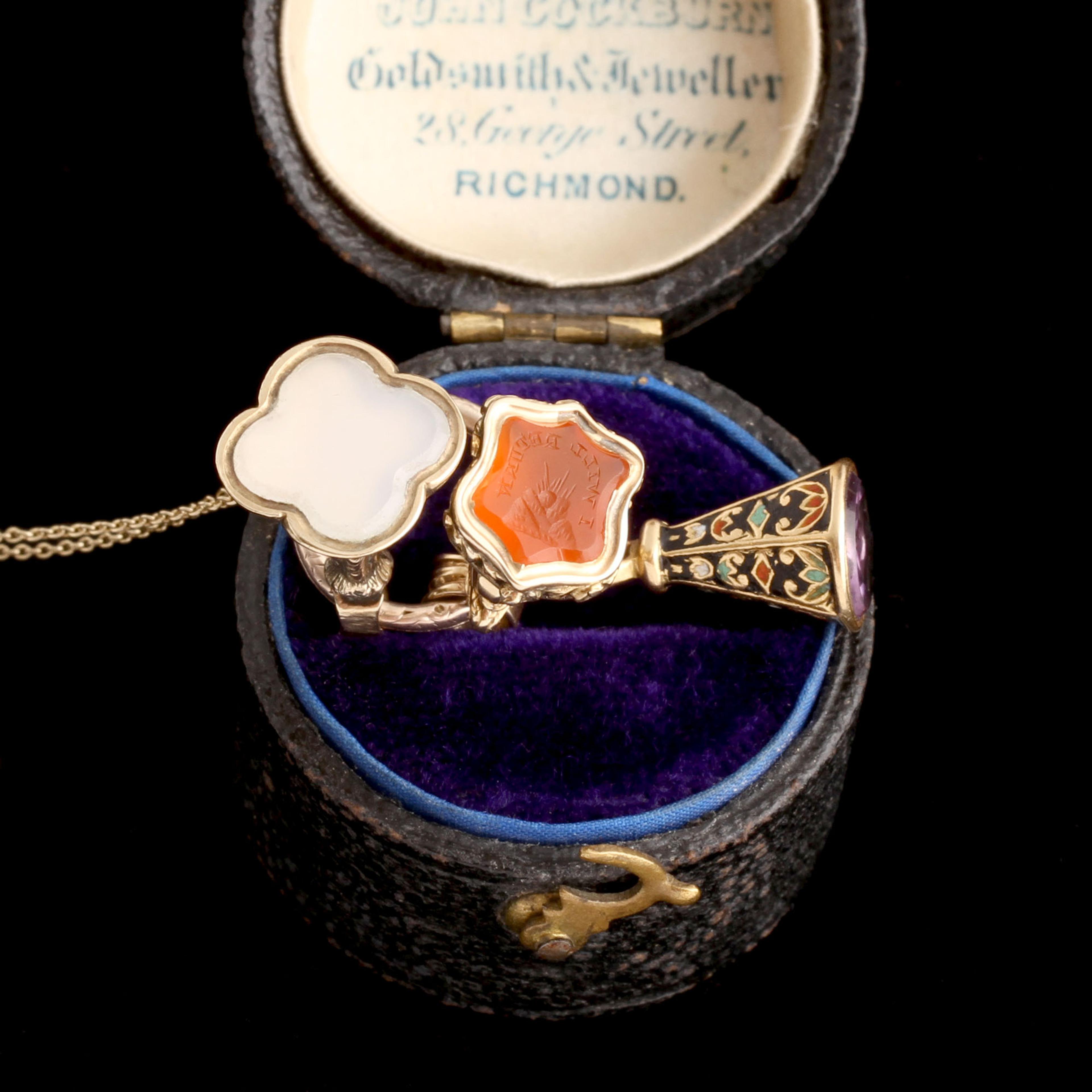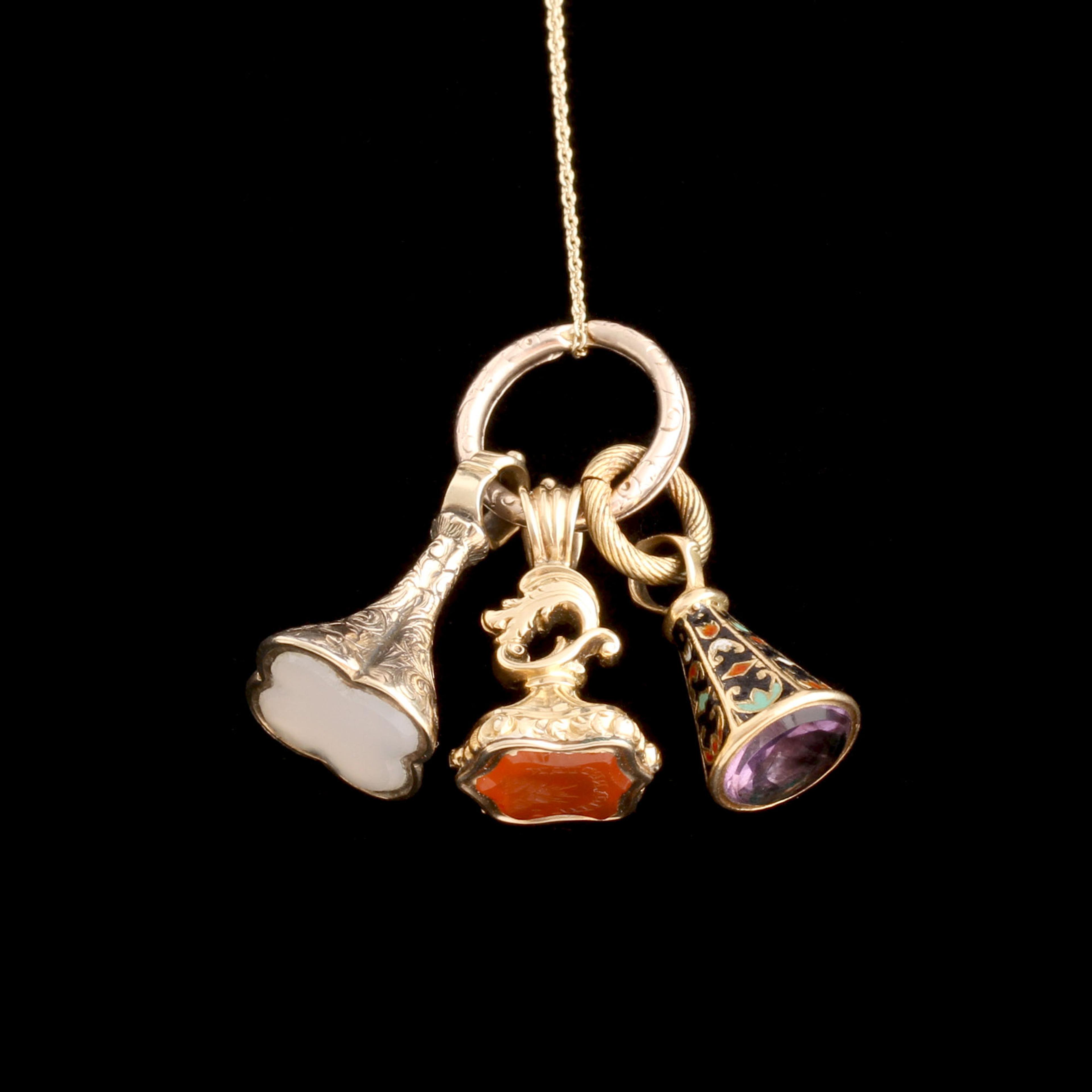 A vow made in the form of three small Georgian-era seals repurposed as pendants: a quatrefoil chalcedony slab, an amethyst seal, and a shield-shaped carnelian intaglio engraved with the phrase “I Will Return.” This message suggests it may have been exchanged between lovers or family before a journey or military departure. Imagine sealing each letter home from war with this promise?