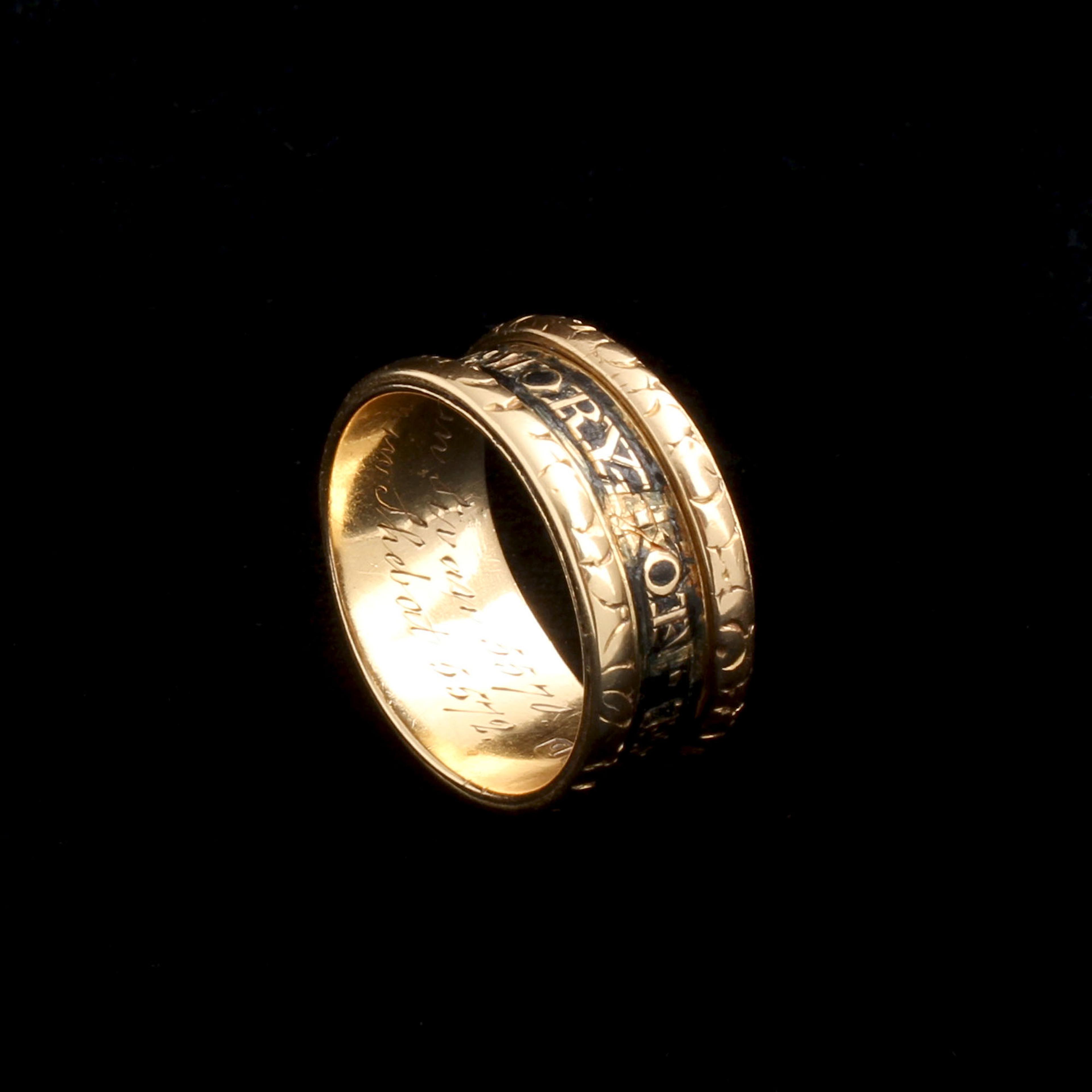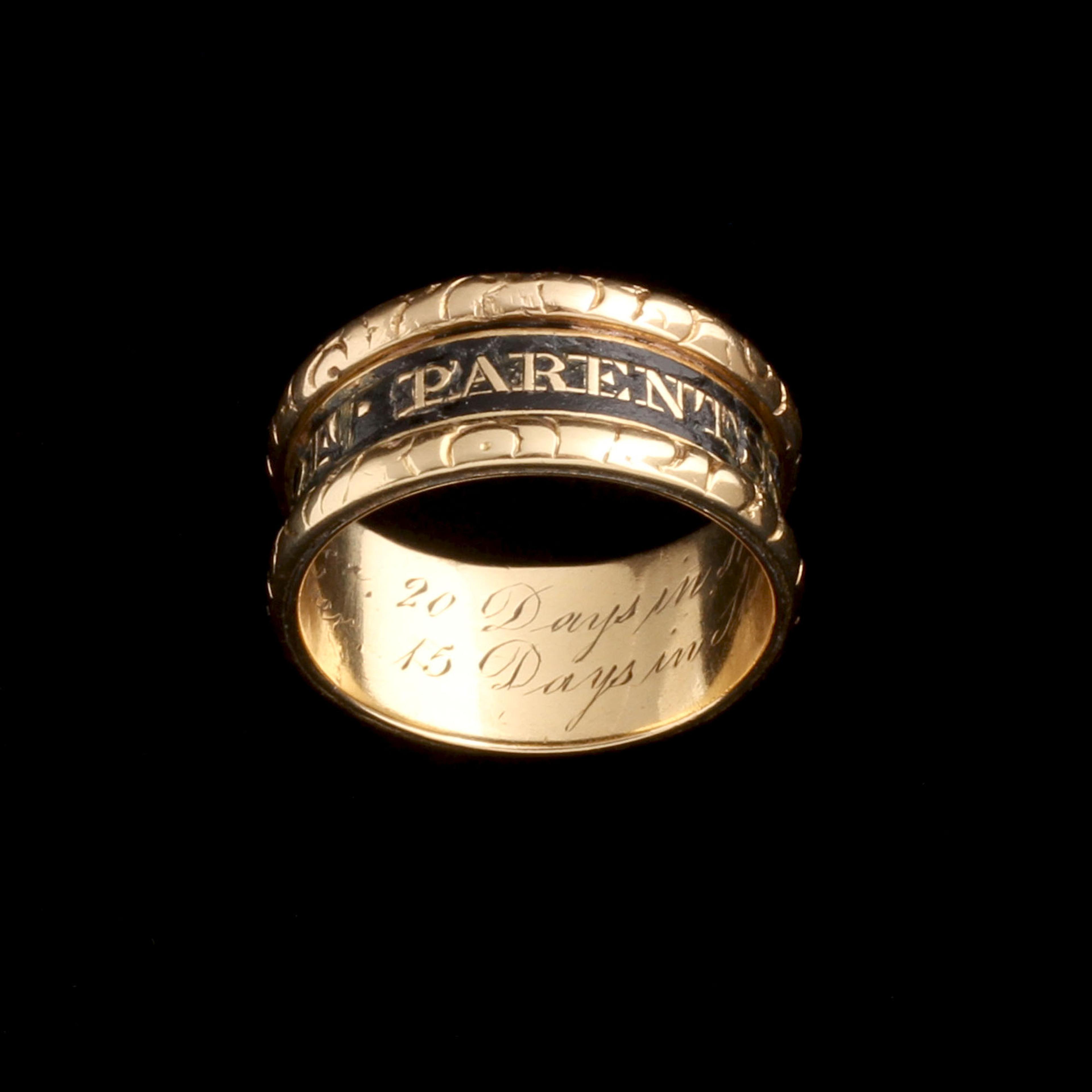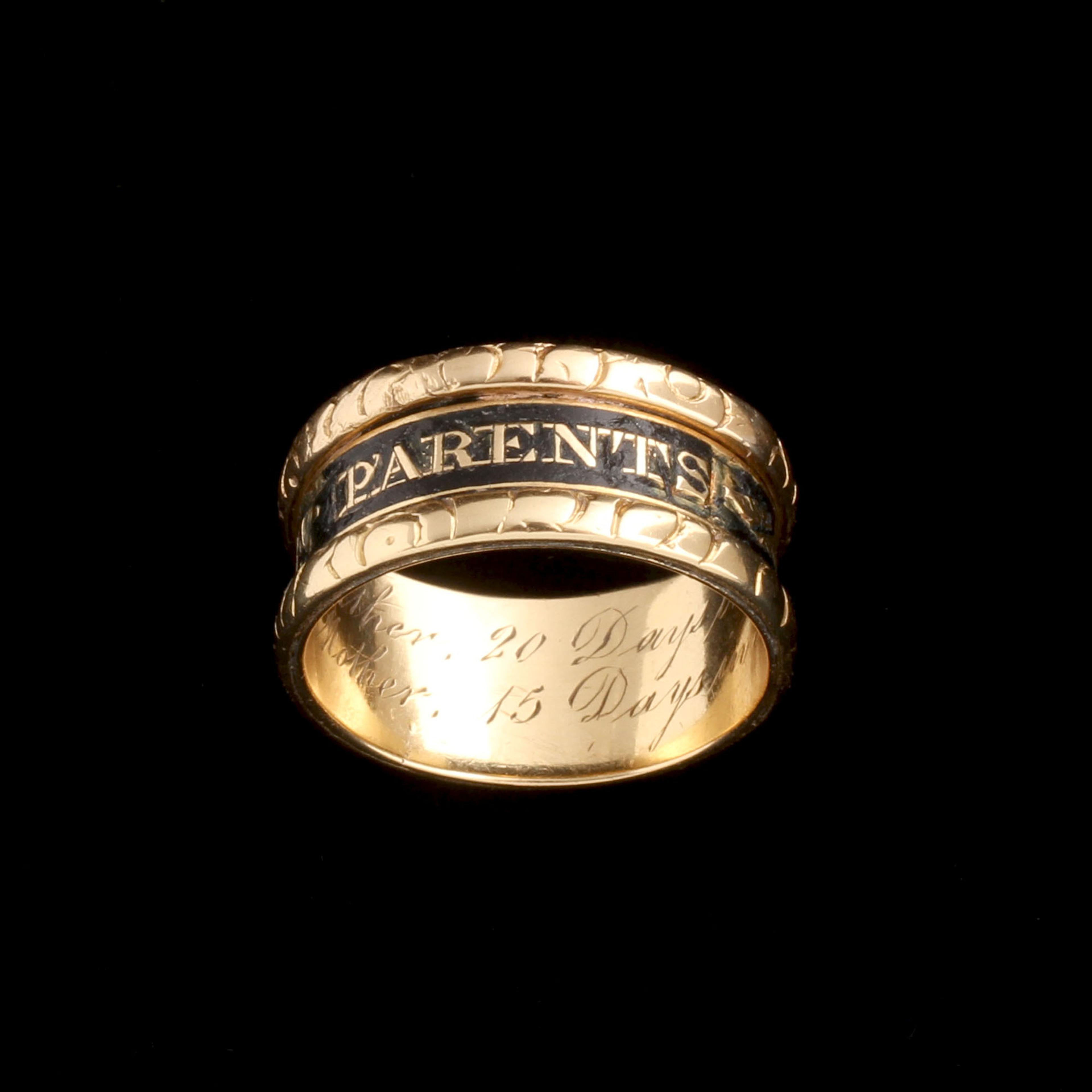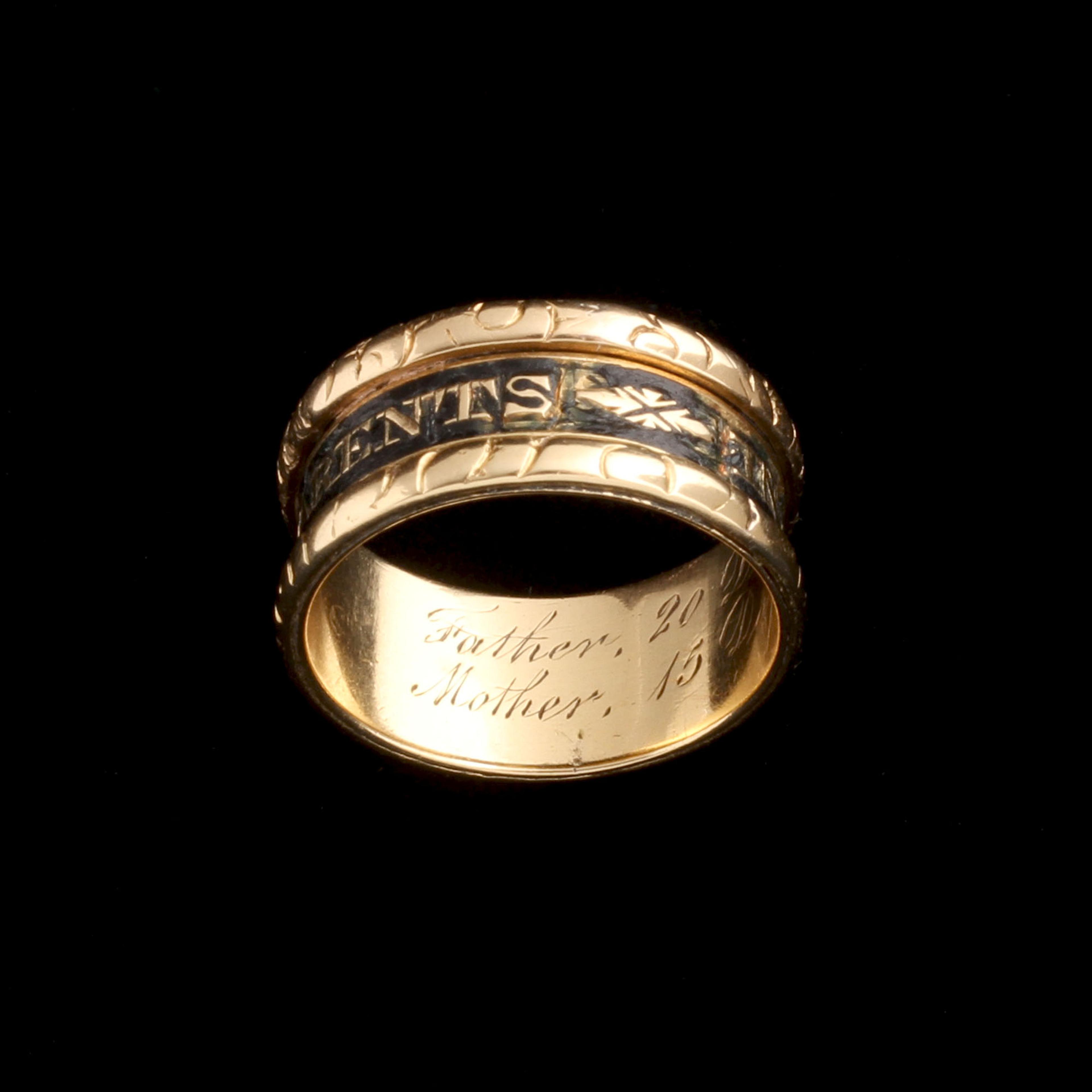 Jewelry with clear Jewish provenance is rare and thrilling to find. In this case, the parents memorialized in this ring were part of a Jewish family, as their death dates are recorded according to the Hebrew calendar. The inscription reads "Father 20 days in Sivan 5570" (which is Friday June 22, 1810) and "Mother 15 Days in Shebat 5572" (Wednesday January 20, 1812). The outside of the ring shows no overtly Jewish symbols; the black enamel and "IN MEMORY OF PARENTS" follow standard English mourning jewelry conventions, and the hallmarks are for London 1817.