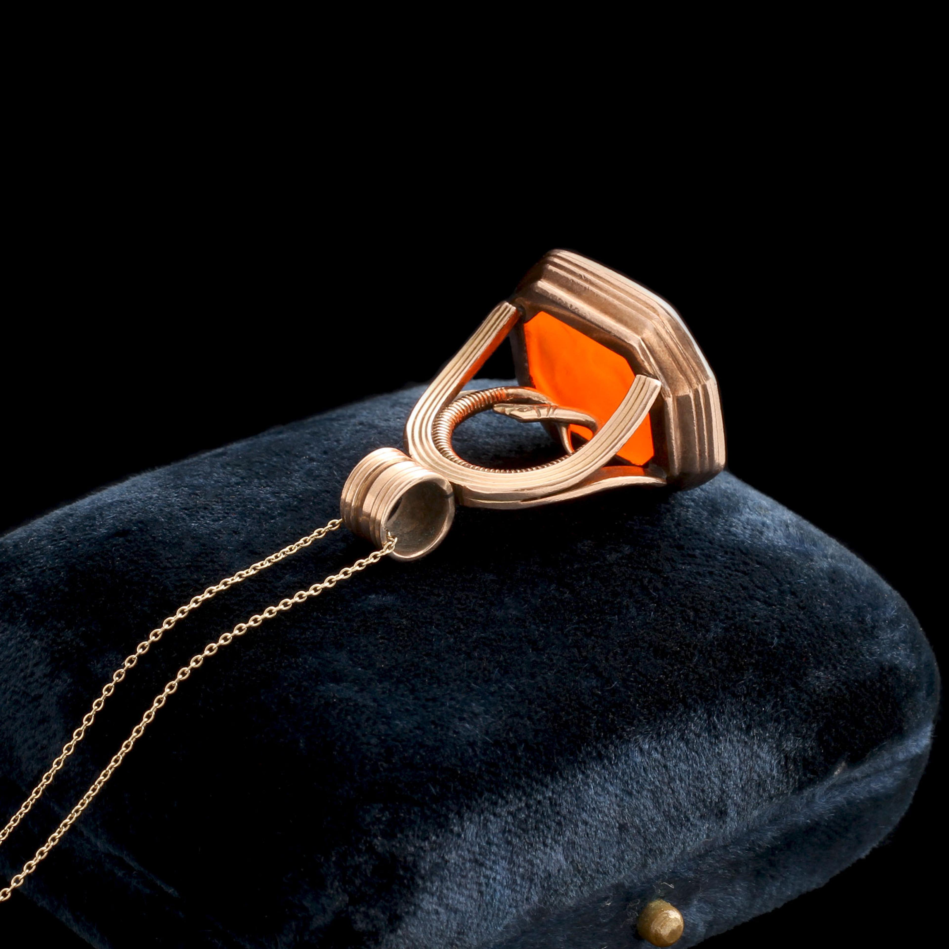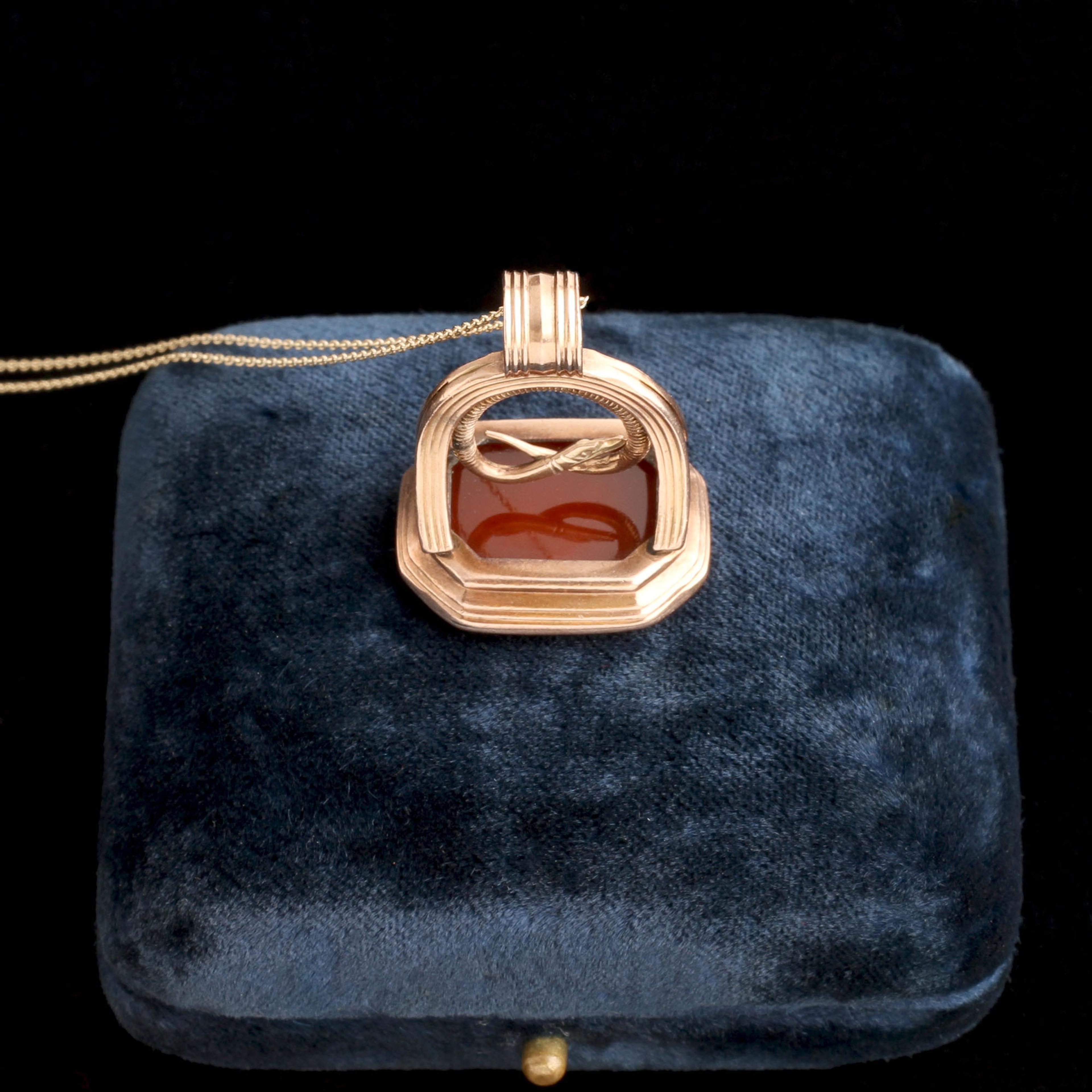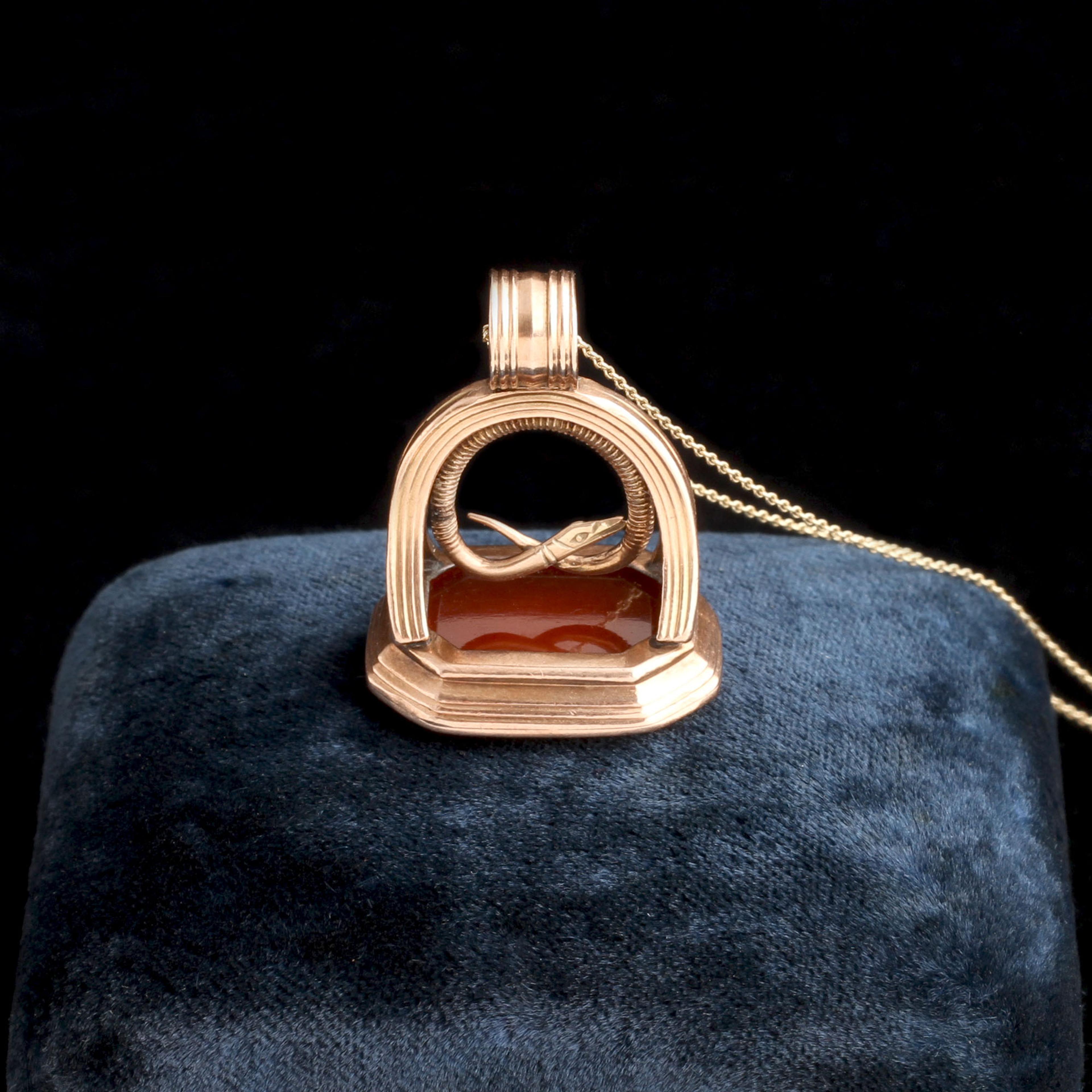 An undulating snake hovers beneath a carnelian plaque. Sneaky.