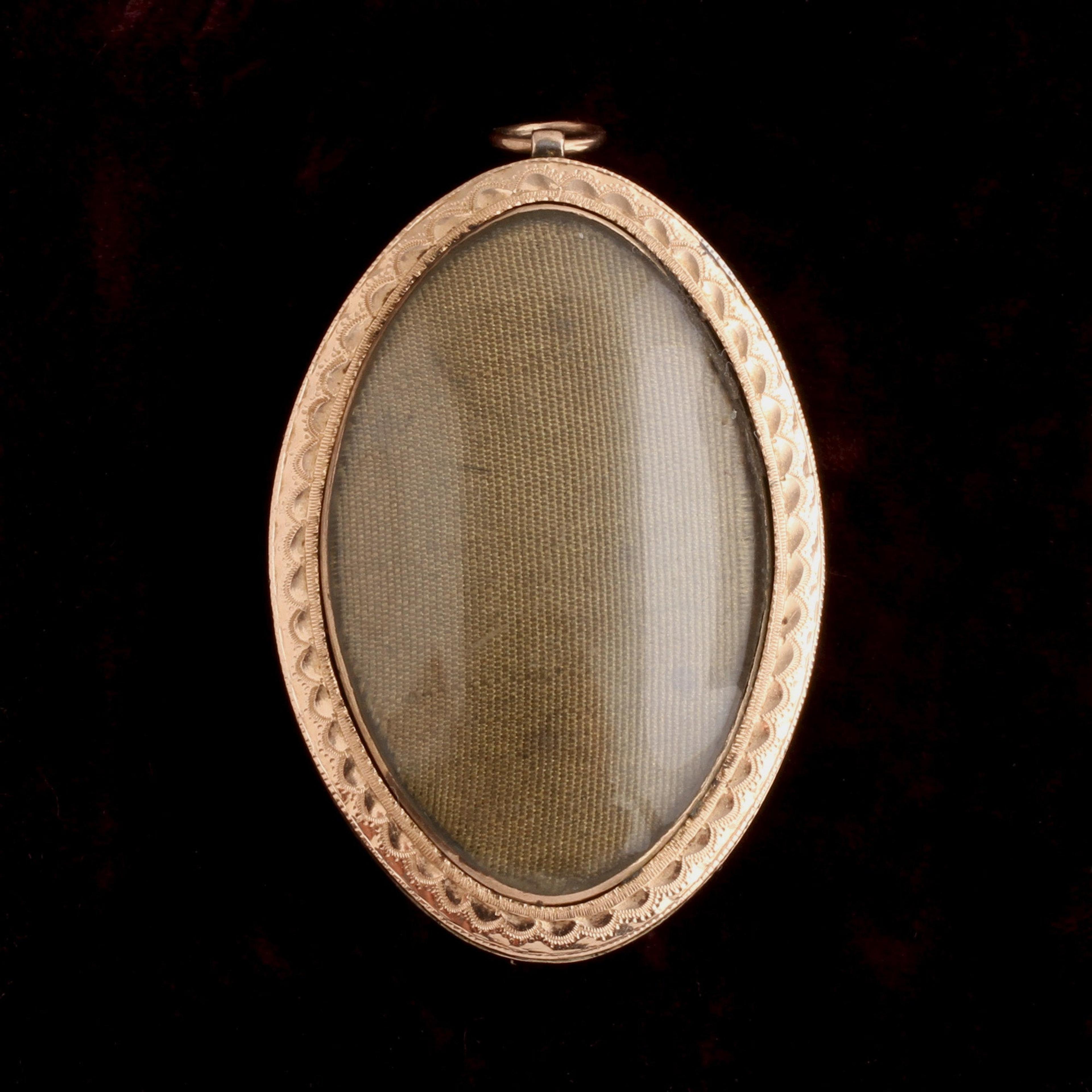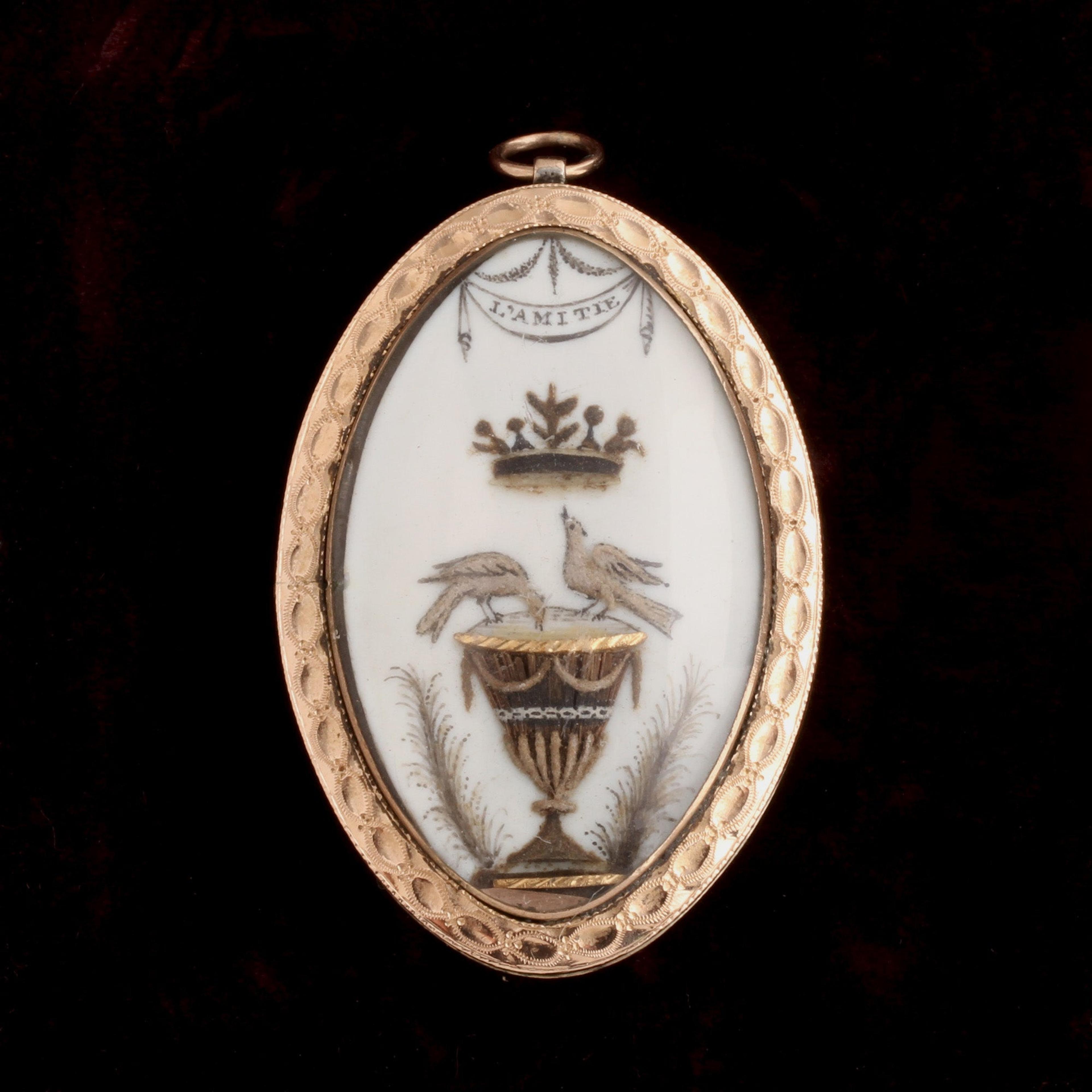 An utterly remarkable, near immaculate Georgian pendant (formerly a brooch) featuring a depiction of lovebirds perched atop a birdbath beneath a crown and banner which reads "L'Amitié". The scene is rendered in macerated hair, gold wire and sepia ink on a thin slice of vellum. The reverse side holds an empty locket.