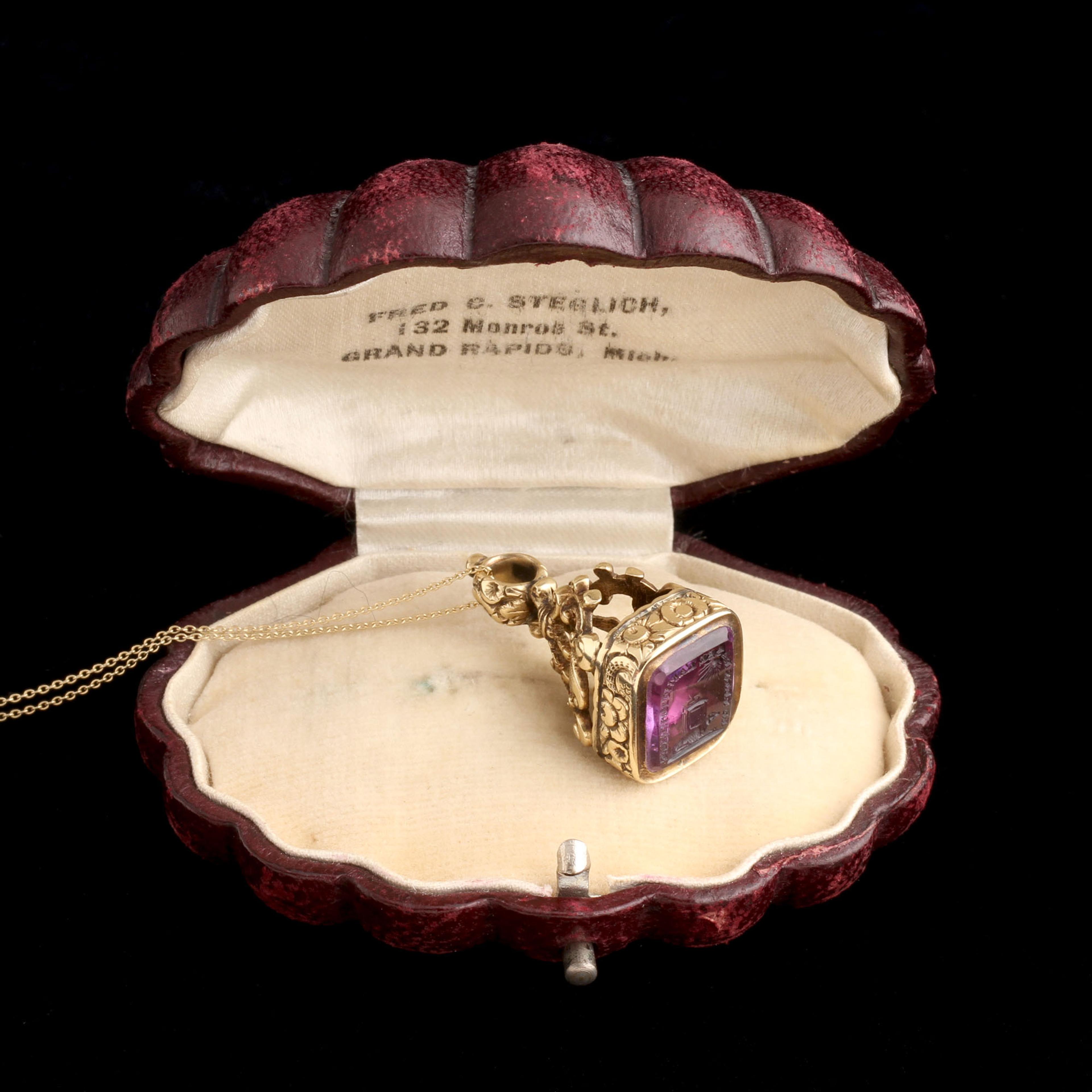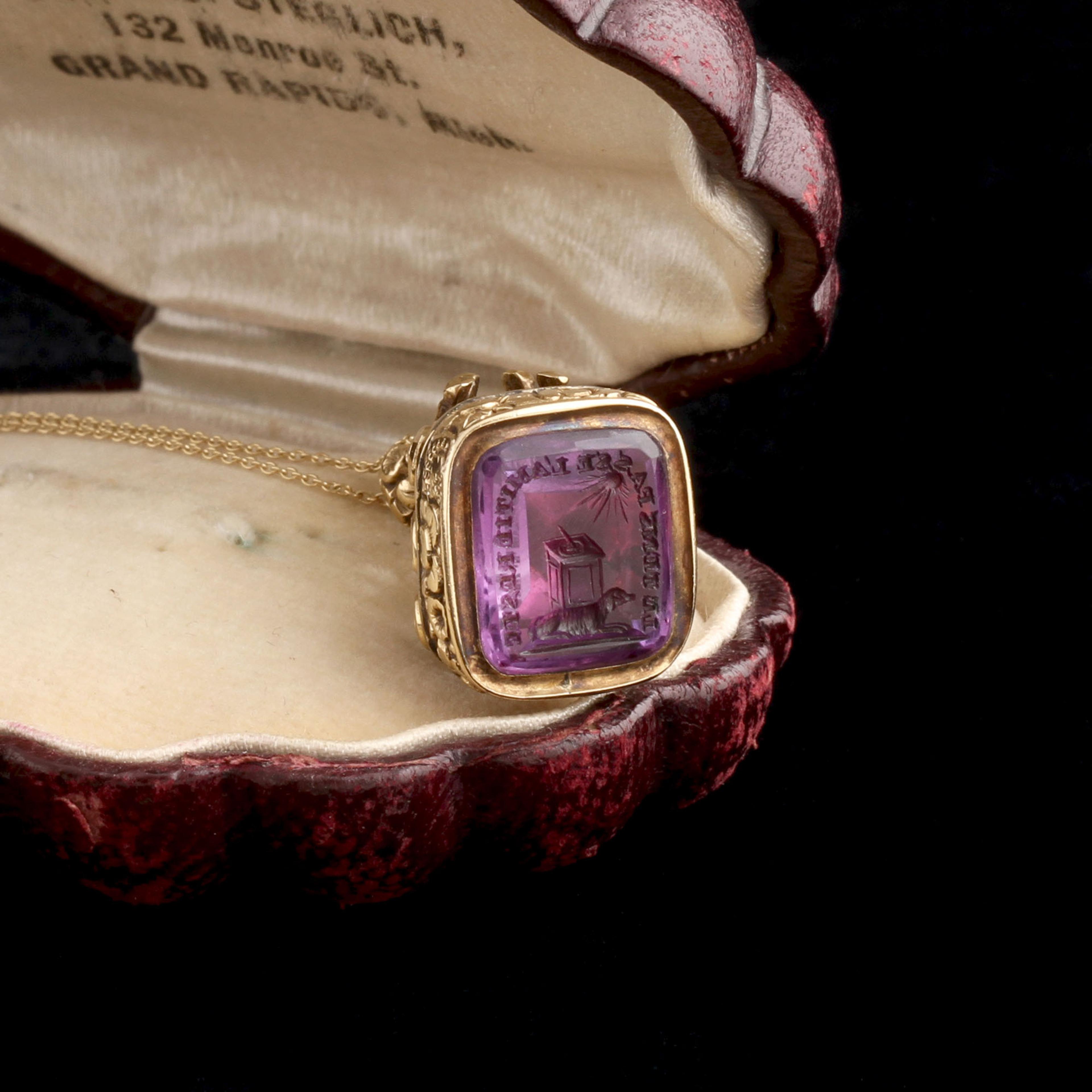Le temps passe l'amitiè reste" - a French sentiment that translates to "time passes, friendship remains". A faithful pooch lies beneath a sundial. The scene is carved into amethyst and would have been used to imprint an image into hot wax. Imagine getting a letter with this as the seal? Swoon!