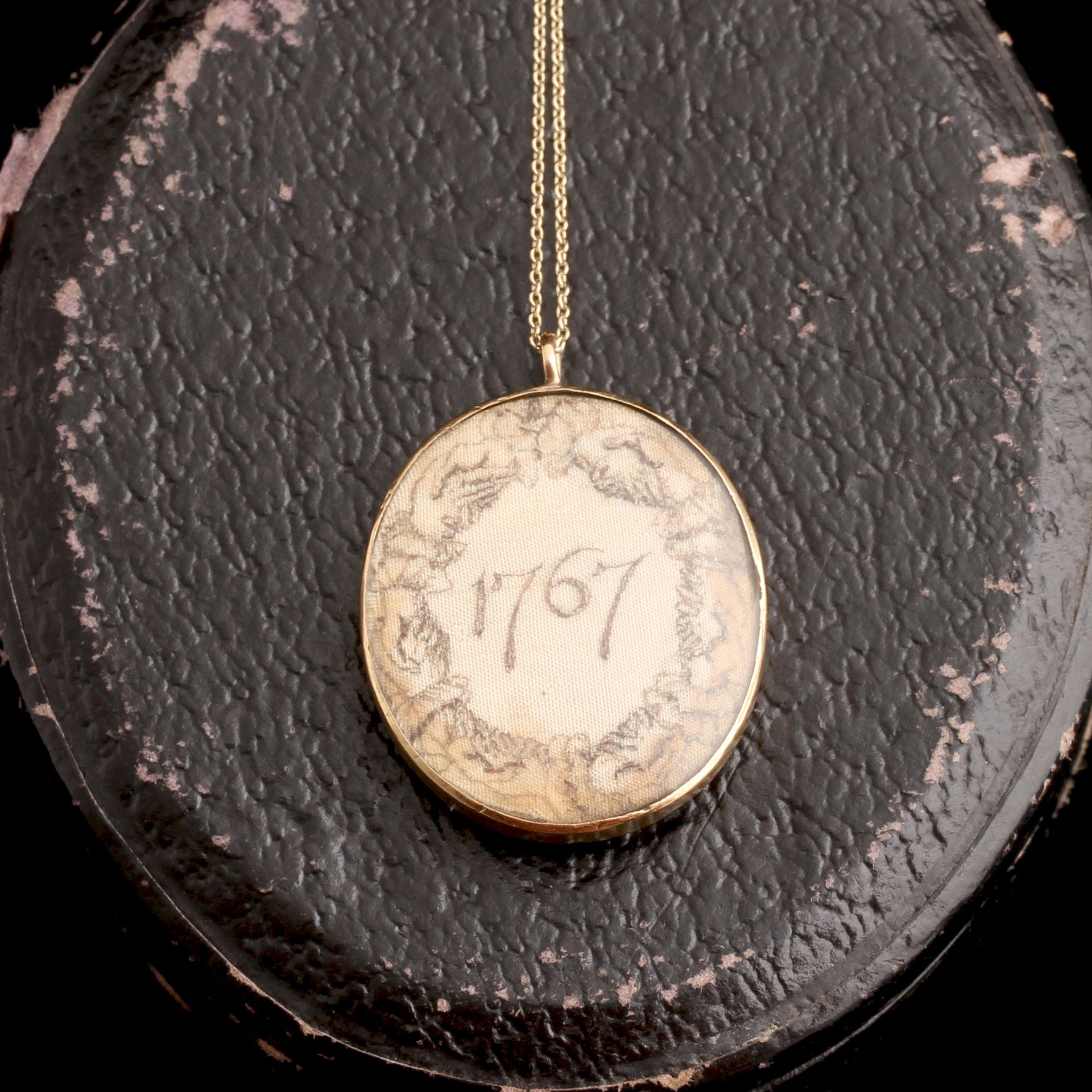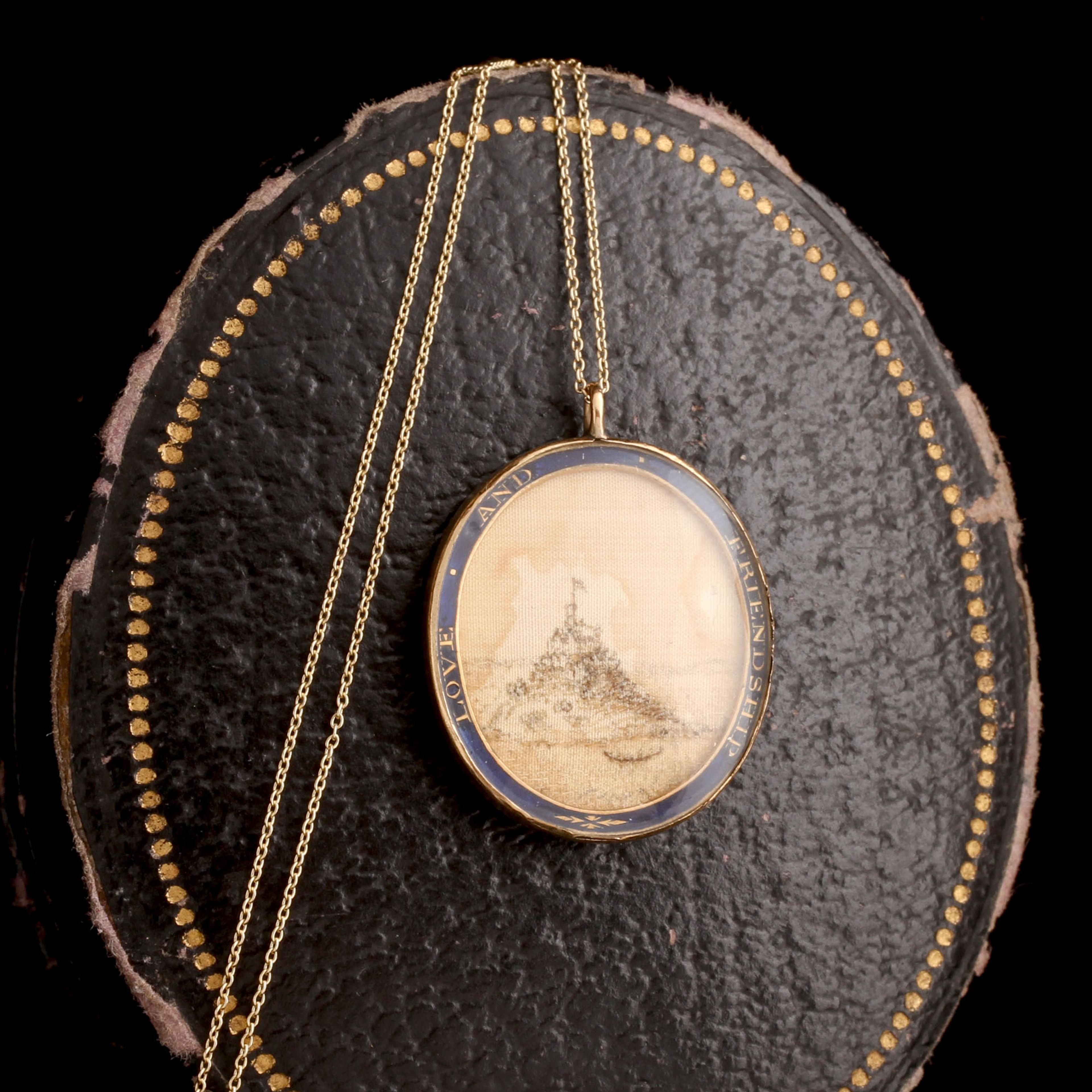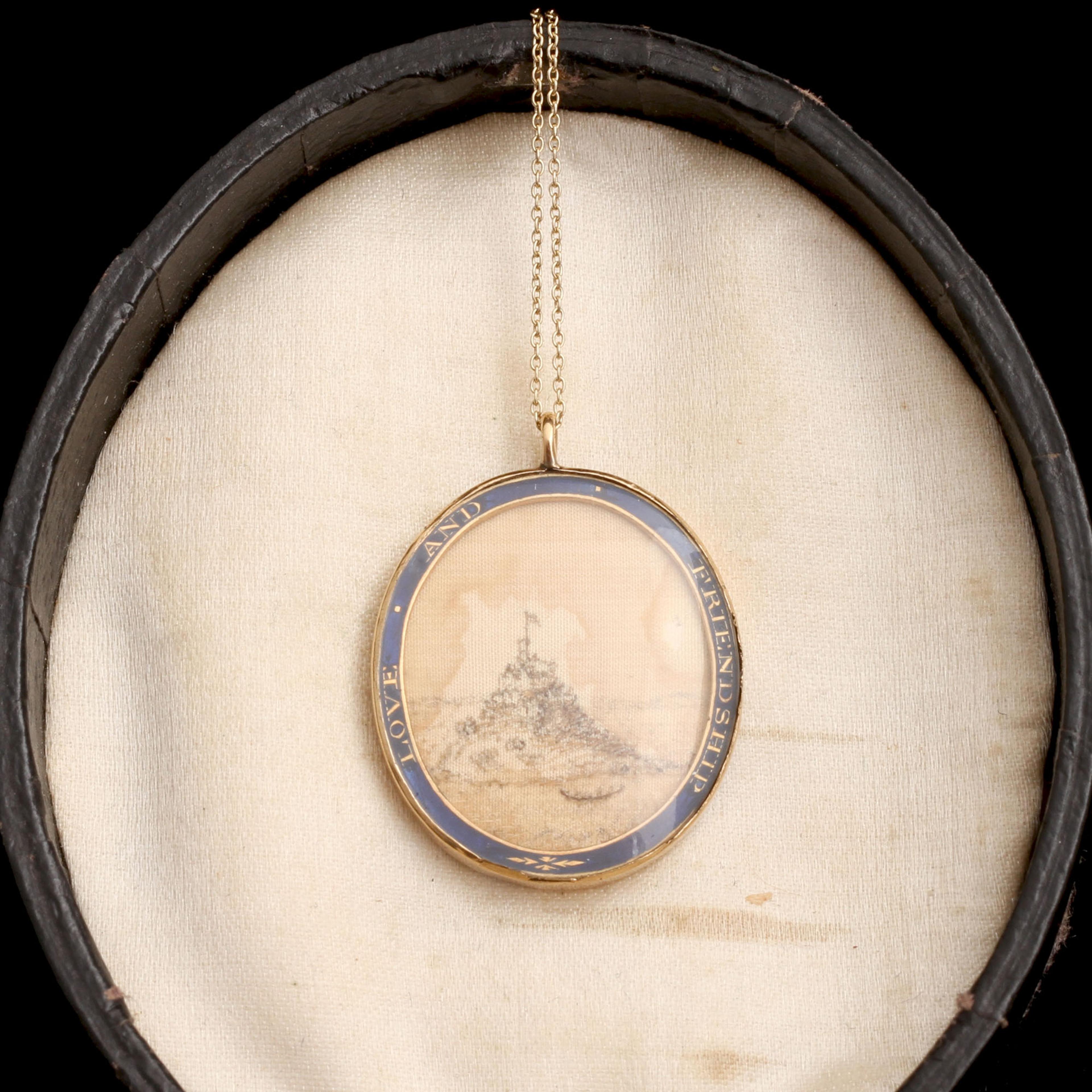 A double-sided Georgian pendant dated 1767, its tiny scenes rendered in silk embroidery. It was (incredibly!) almost certainly worked with human hair as thread; this was common for love and mourning tokens of the era. One side depicts St Michael’s Mount in Cornwall, a tidal island crowned by its medieval abbey, long associated with protection, divine guidance, and steadfastness. The reverse shows six pairs of clasped hands with ruffled cuffs, a motif of unity and friendship.