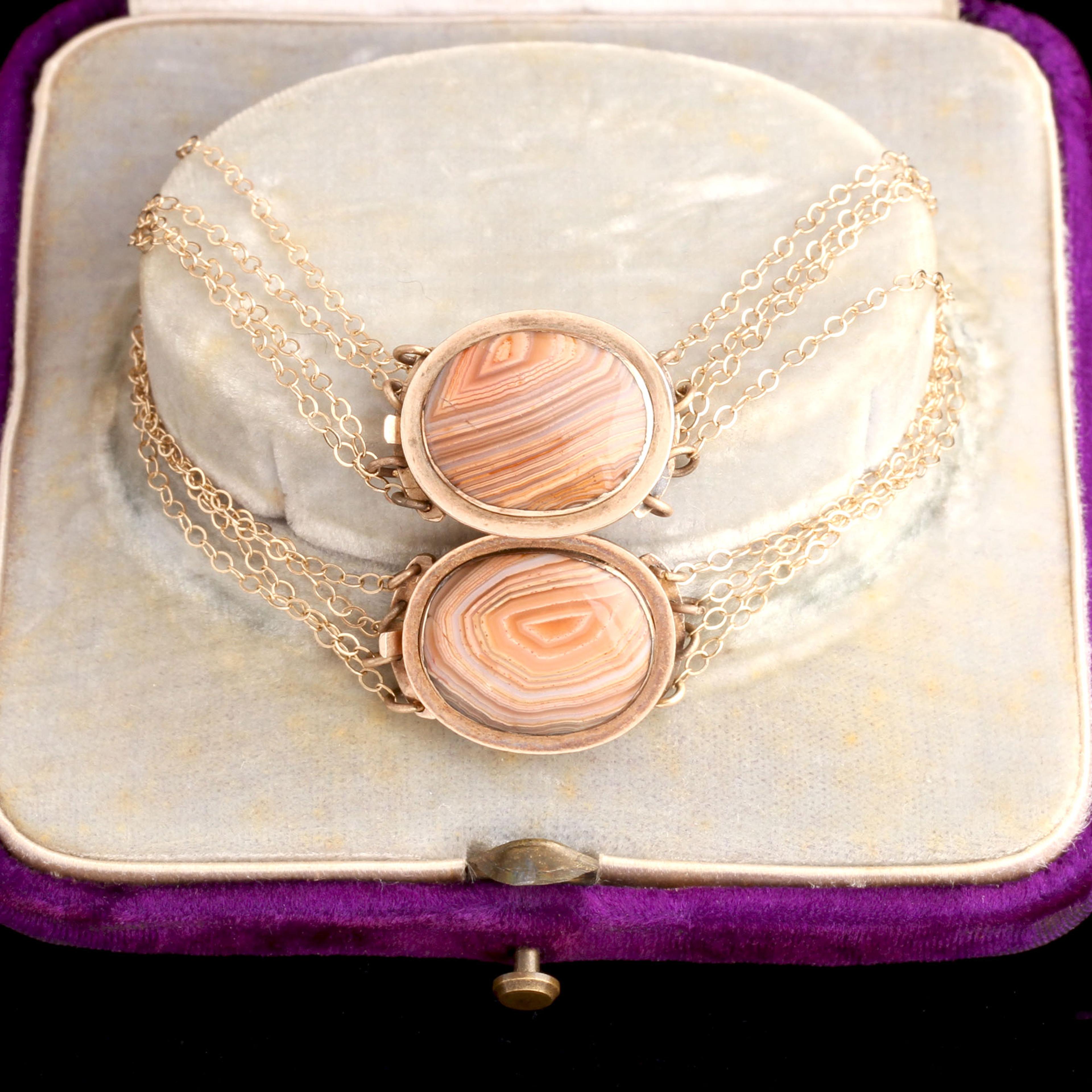 10k gold (tests), 5/8" x 1/2" agate cabochons, 14k gold chain
