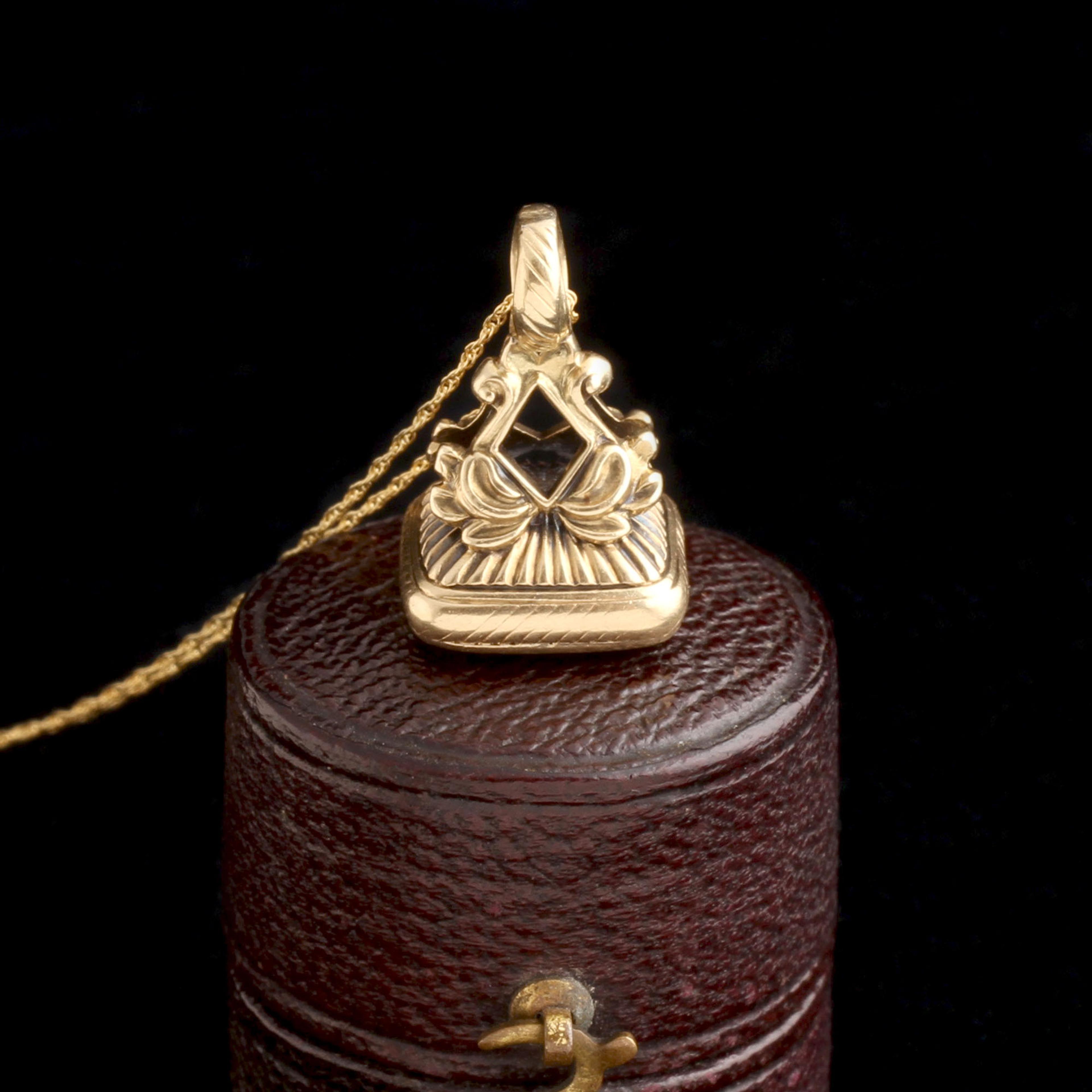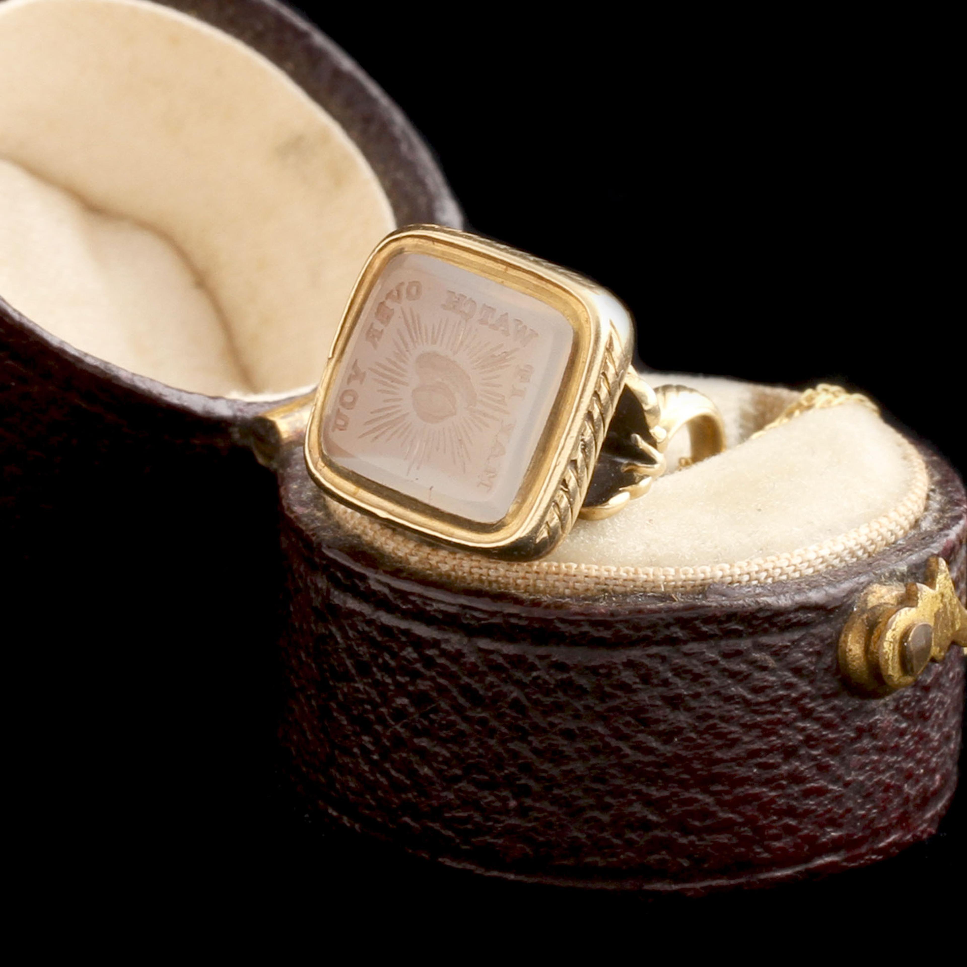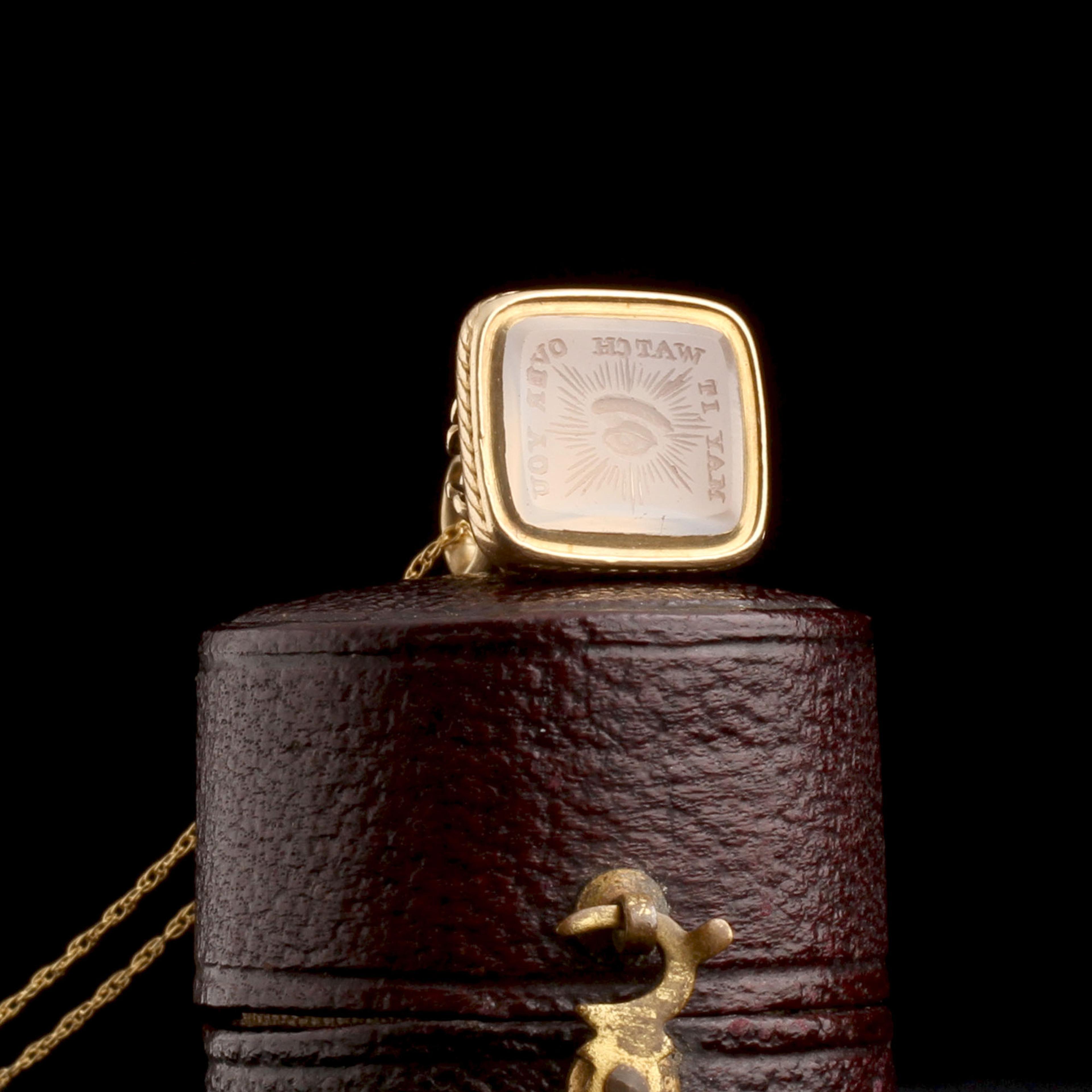 The disembodied Eye of Providence, with rays surrounding it, was a general emblem of divine oversight before it became a Masonic symbol. It was used on the Great Seal of the United States in 1782. It was carved into a chalcedony wax seal here, along with the motto "MAY IT WATCH OVER YOU", as a protective symbol.