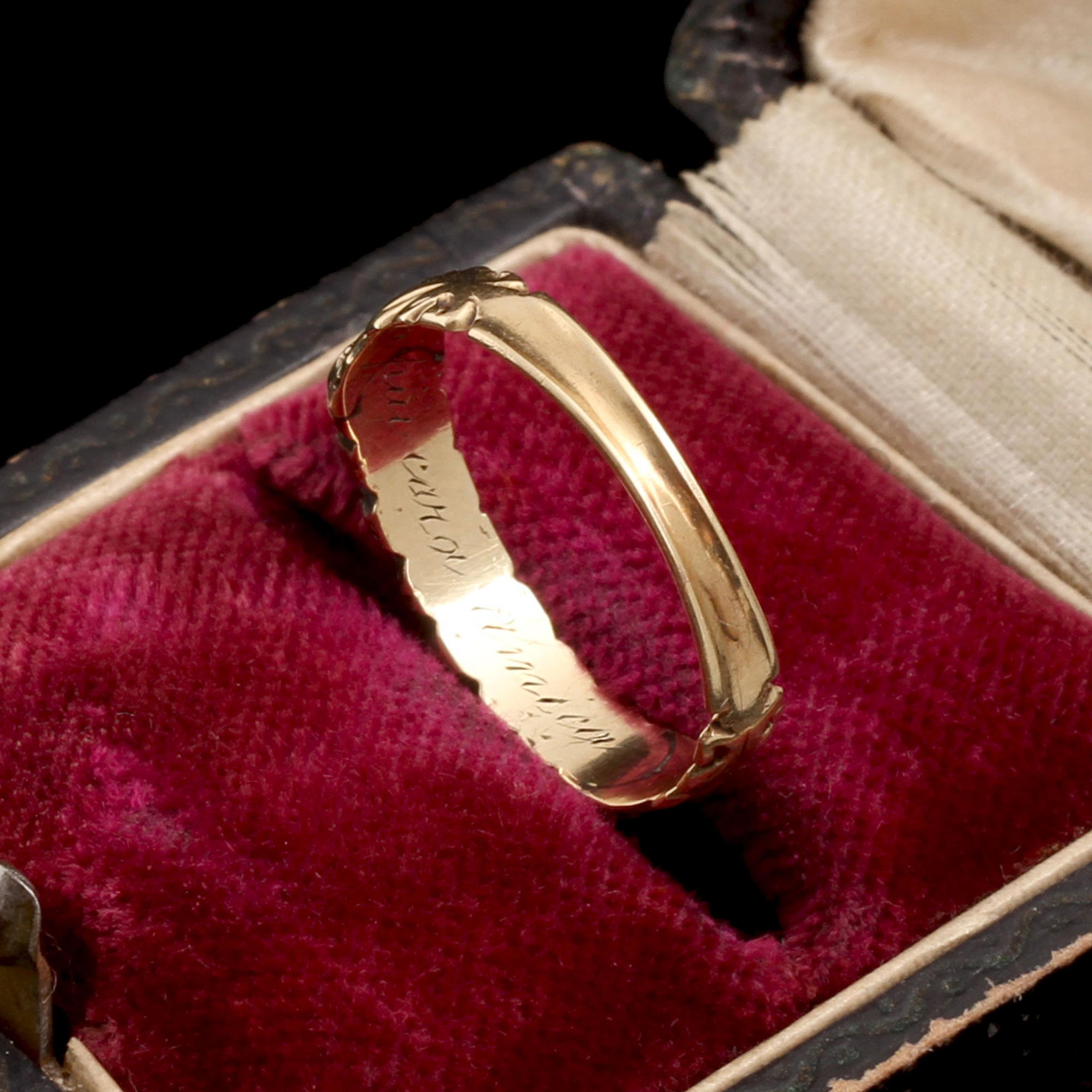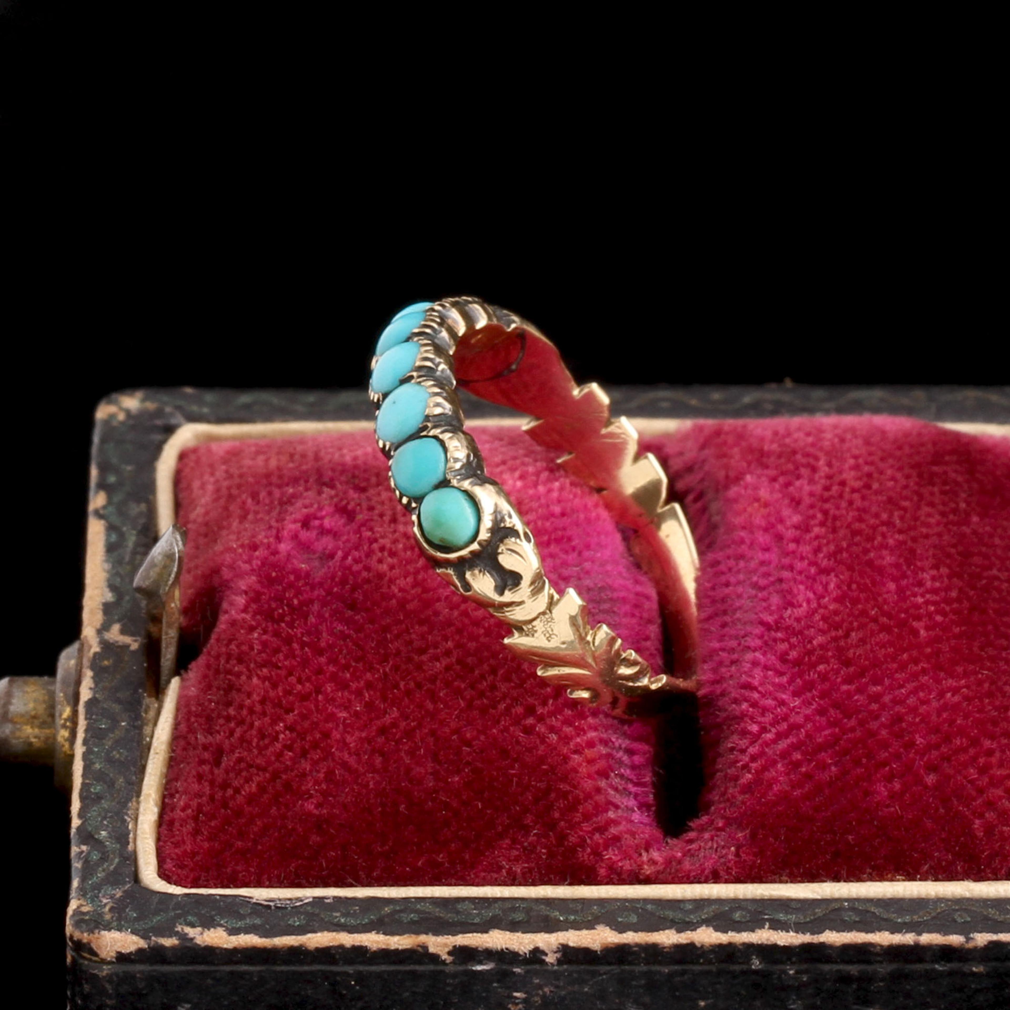 DURING THE GEORGIAN period (1714-1830), Italy was considered the cultural heart of Europe. Wealthy British and European travelers felt it to be an unmissable stop on the Grand Tour, and Italian was the "romantic" language of choice for engravings on jewelry. Here, the inscription "Mia piu cara amica" ("My dearest friend") appears inside a half-hoop ring set with turquoise. This blue stone was famous for representing loyal friendship. The feminine form of the words are used, so we imagine this ring was given from one affectionate female friend to another.
