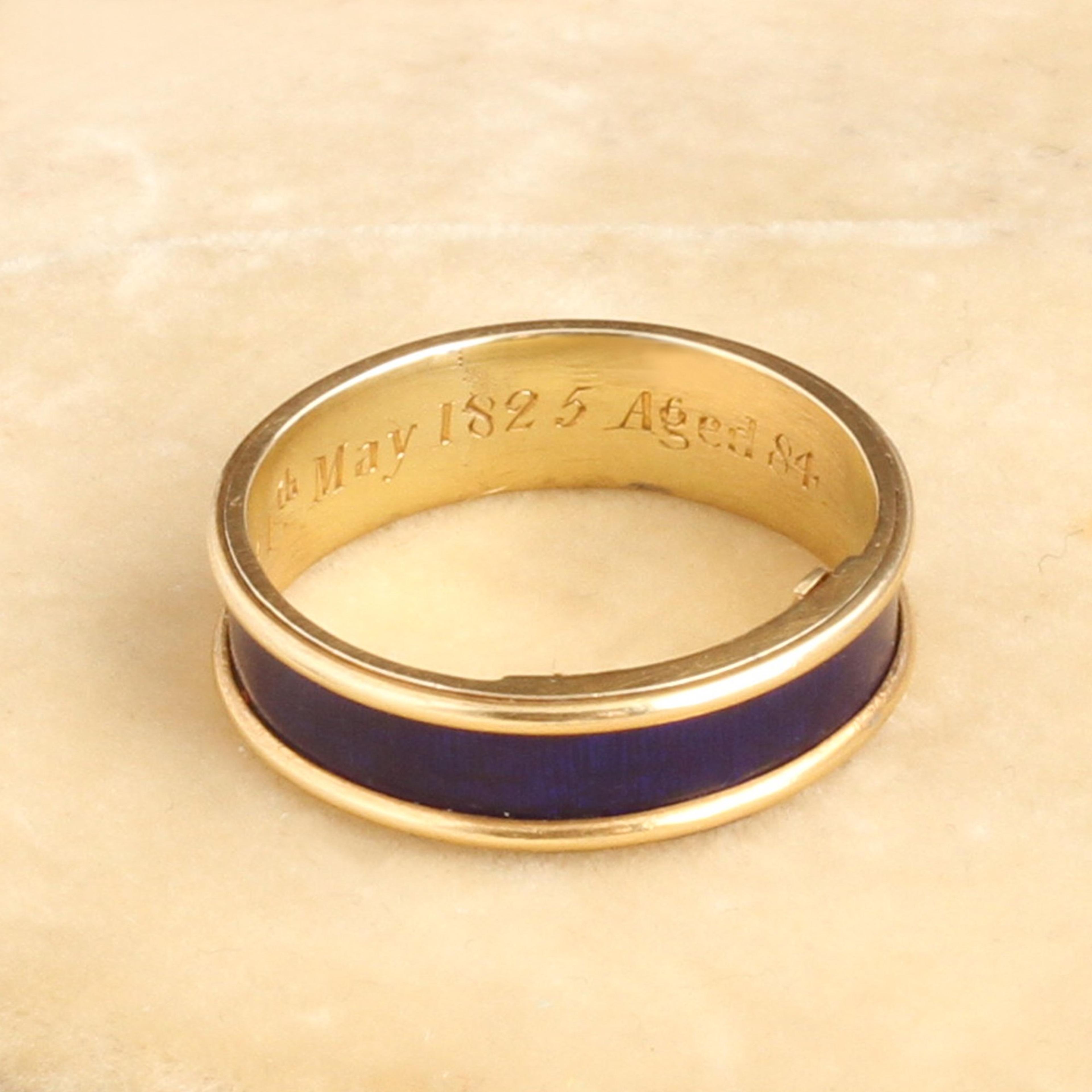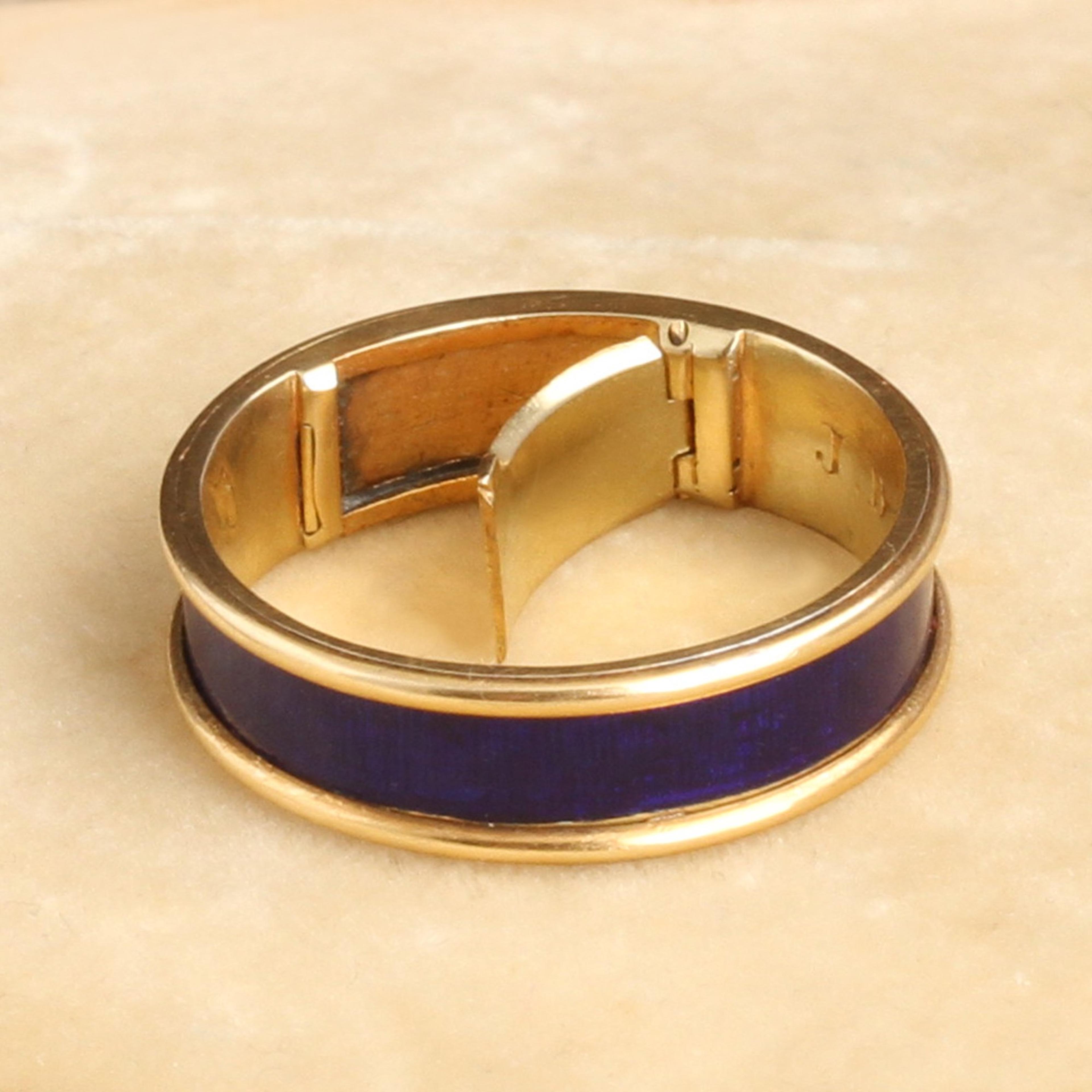 This unassuming gold and blue enamel ring is a mourning ring dating to the Regency period. Engraved inside are the following details: "J. D. died 24th May 1825 Aged 84." The interior golds a hinged locket which once would have held plaited hair of the deceased but is now empty. This style of concealed locket mourning ring is quite unusual and very very special.