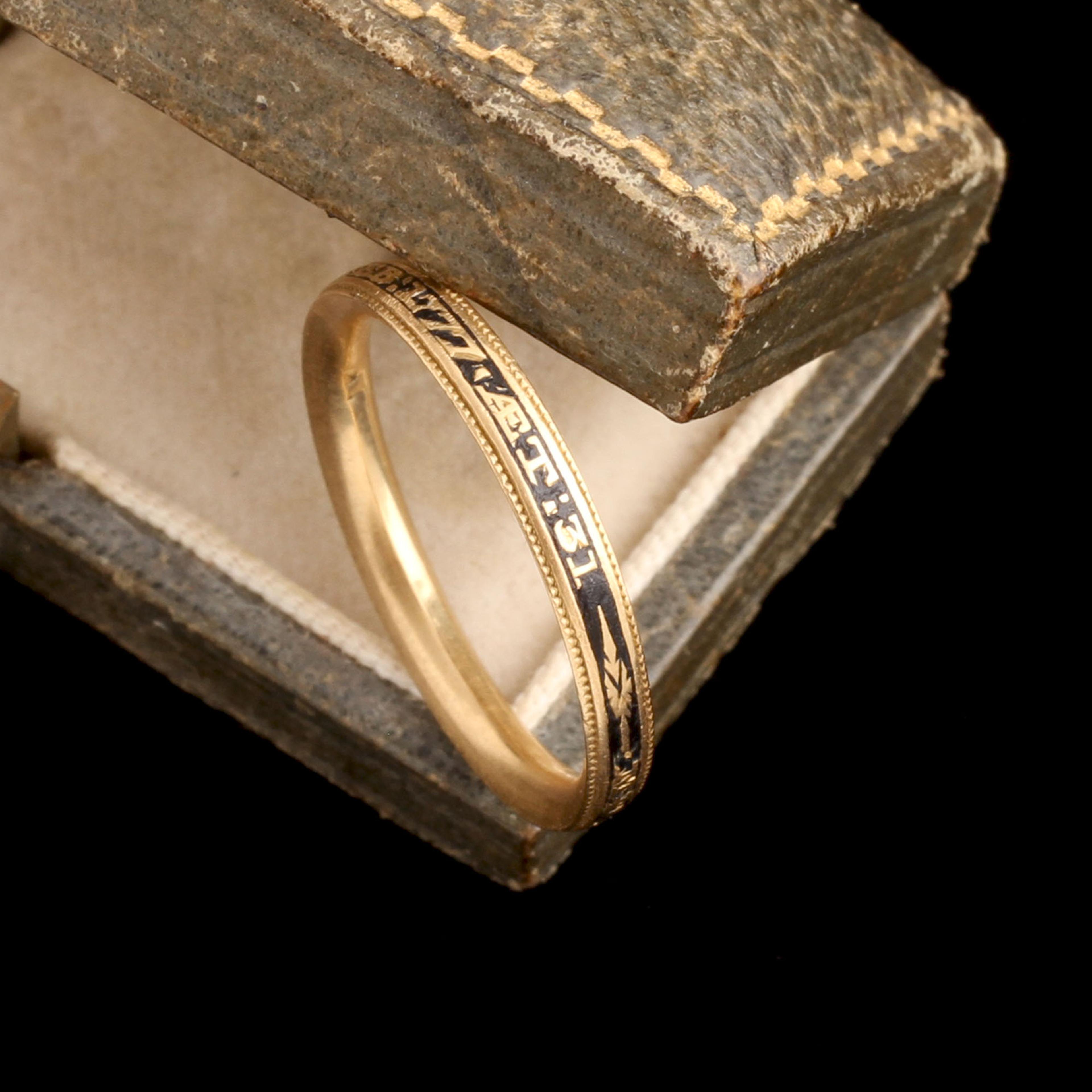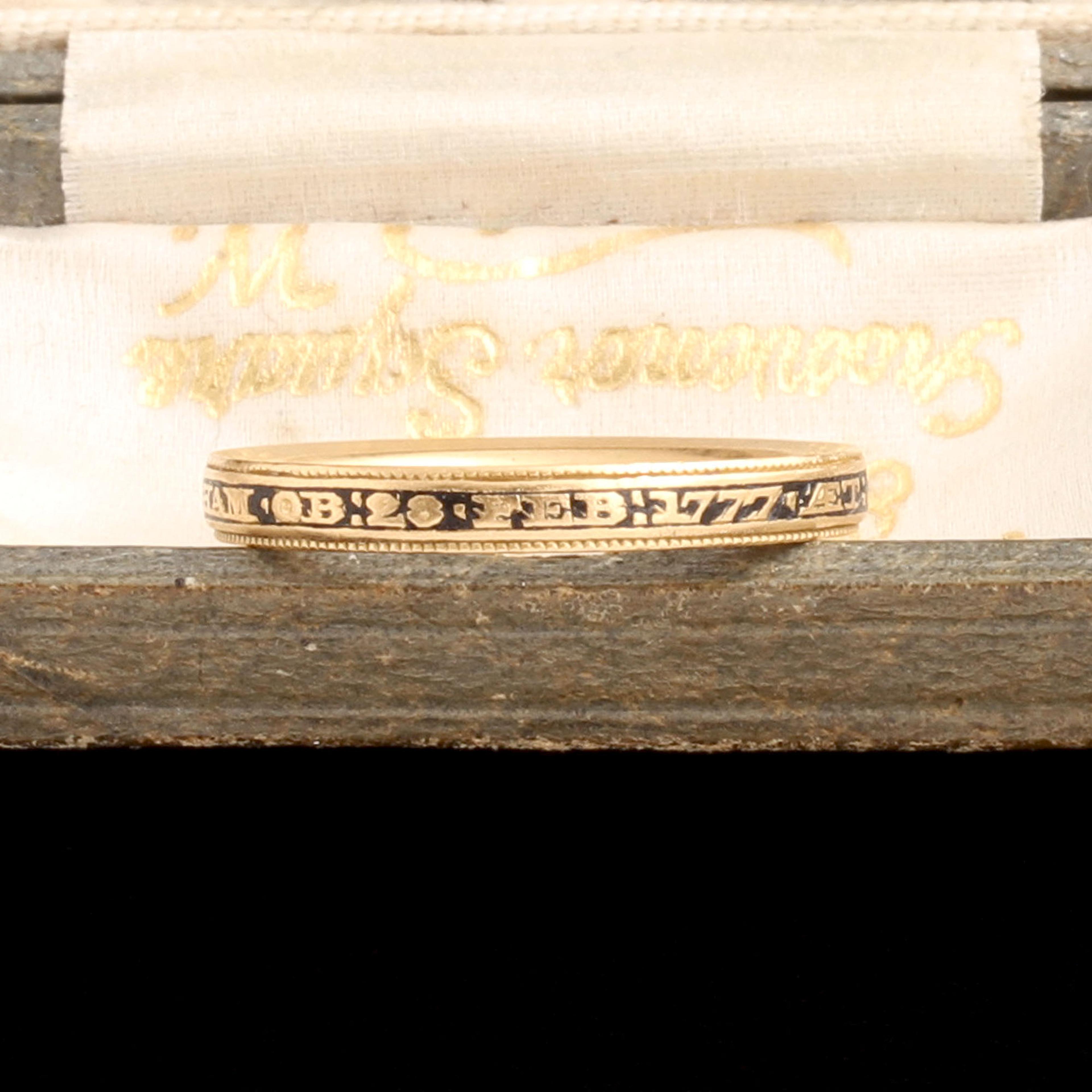 This Georgian mourning band was made to commemorate the death of Mrs Sarah Burningham. The enameling technique used to make a ring like this is called champlevé. This method required the jeweler to cut away the gold of the band to form shapes, letters, or numbers (in this case it reads: “Mrs Sarah Burningham OB 28 Feb 1777 AET 31”), and then flood the recessed space with enamel, which would then be fired to harden it. This ring is a size 7.5 and cannot be resized.