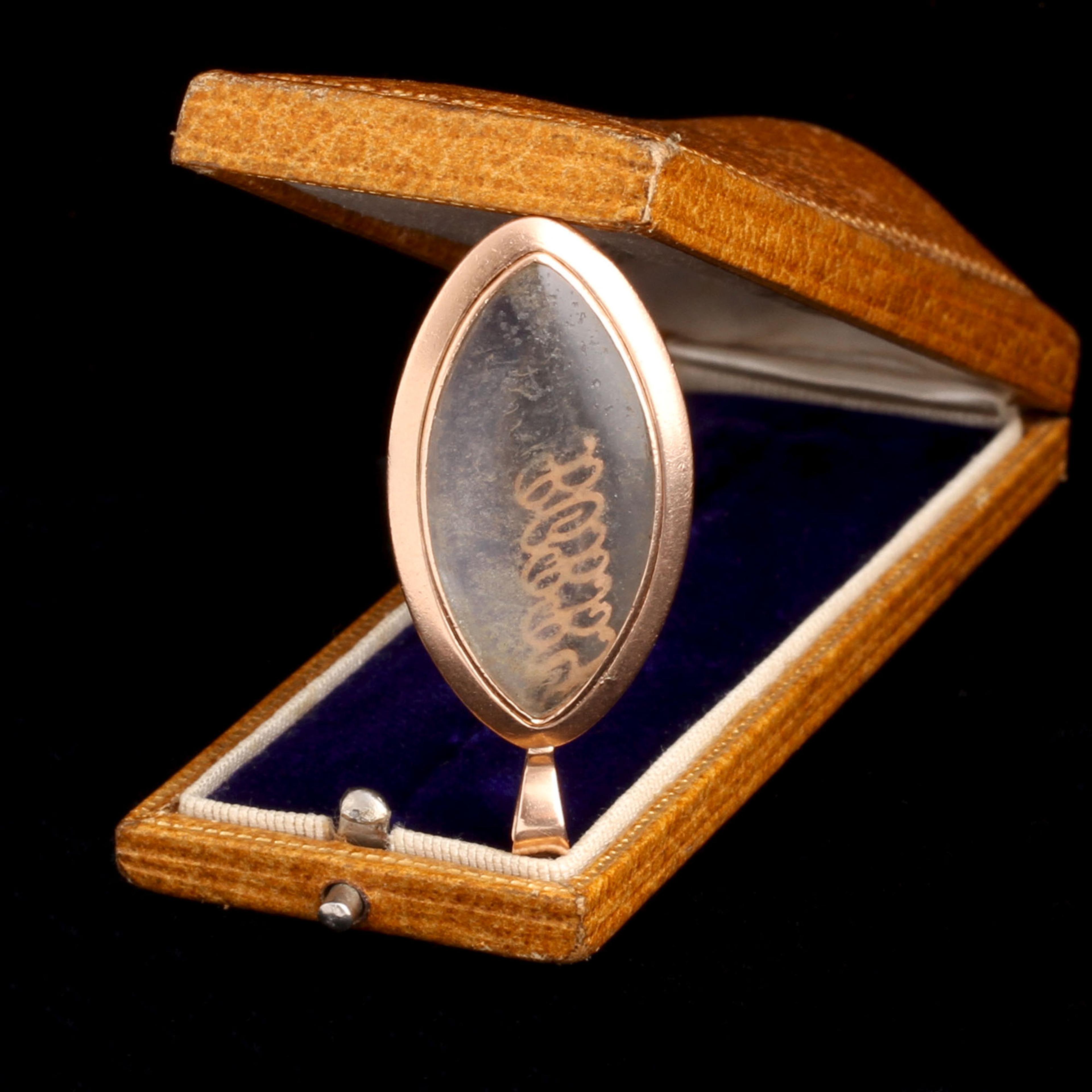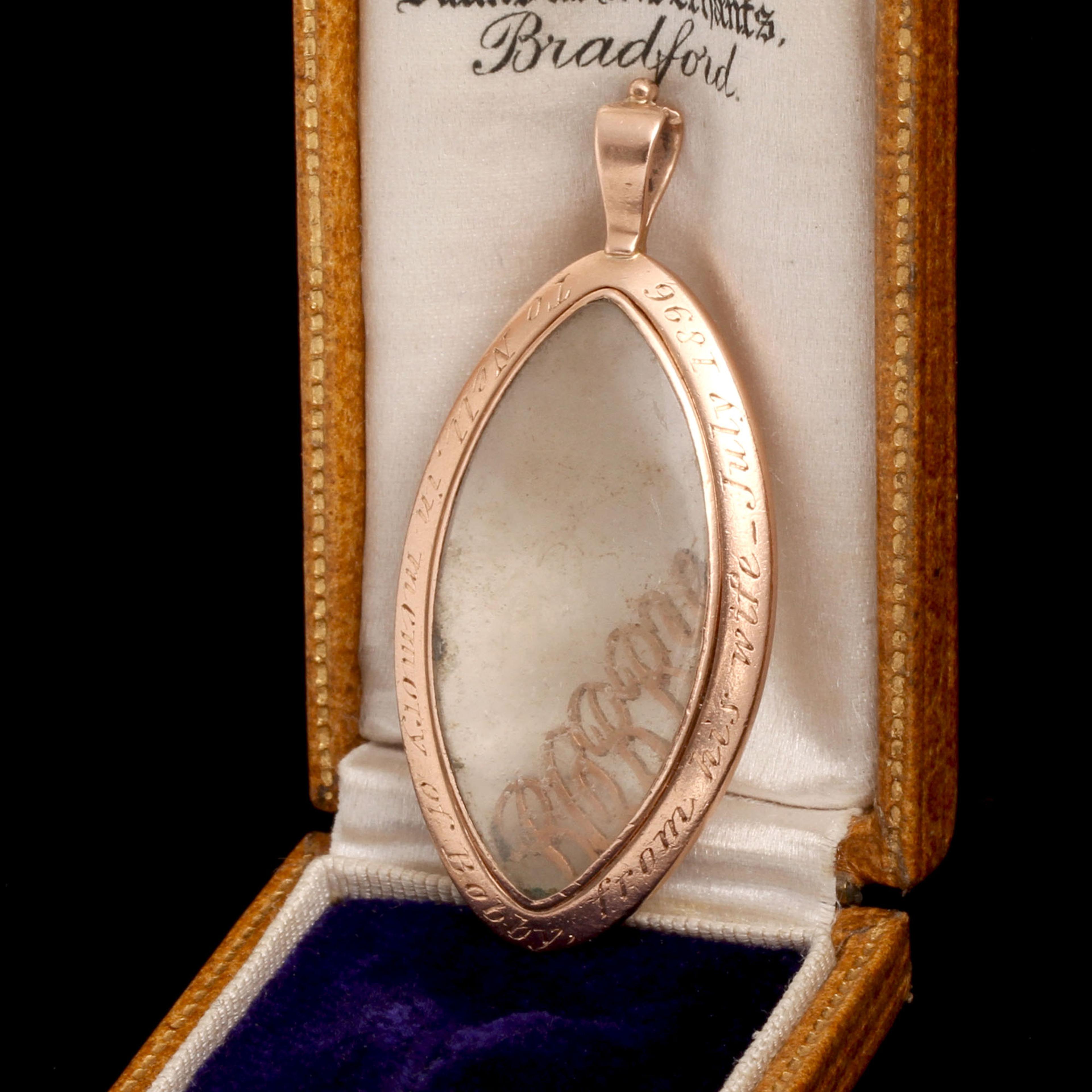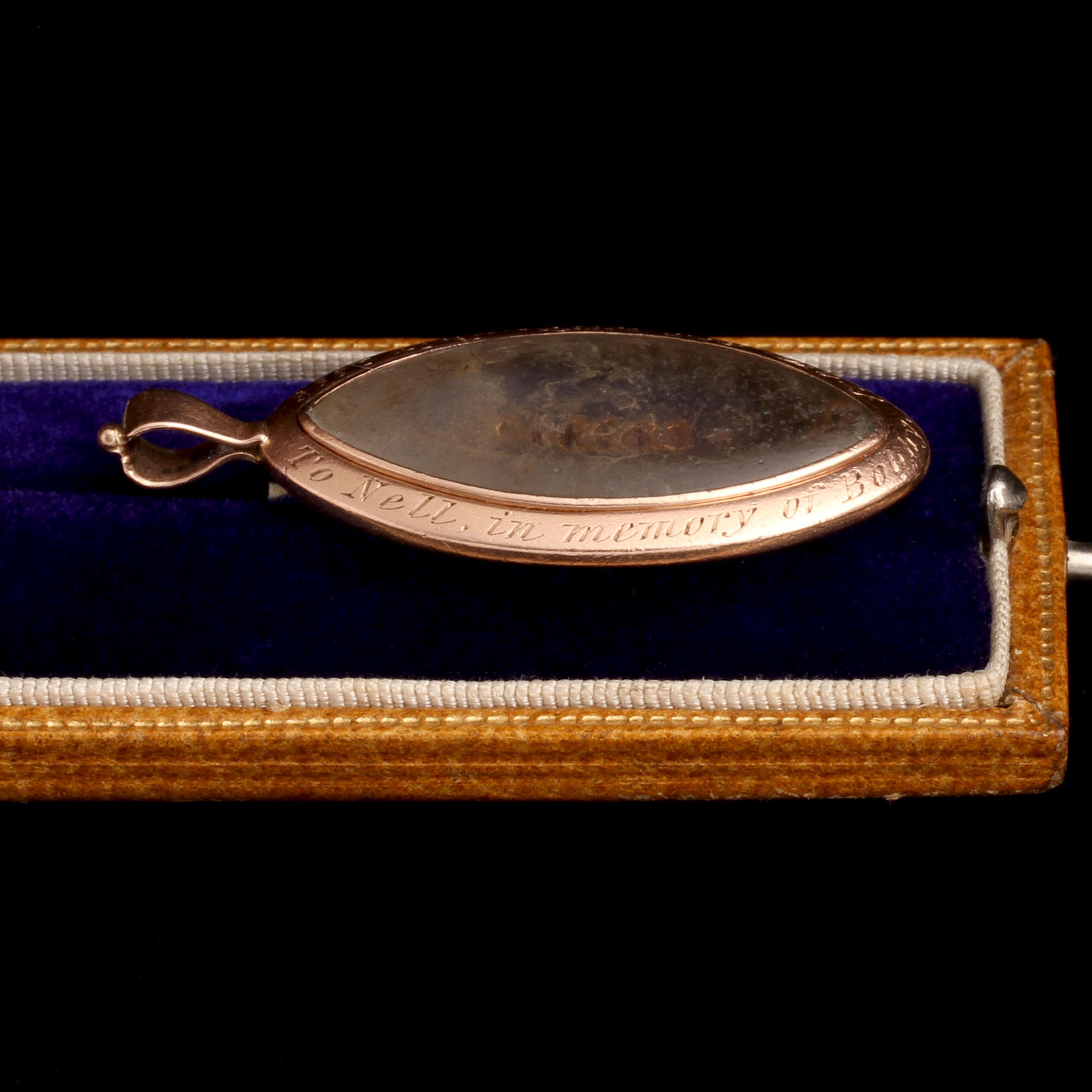 The locket's from around 1790, but someone customized it about a hundred years later. Inside, there's a gold charm type of thingy that says "Bobby" and a dedication engraved around the frame. Noticeable scratches means that whoever loved this "Bobby" guy also loved this locket and wore it often.