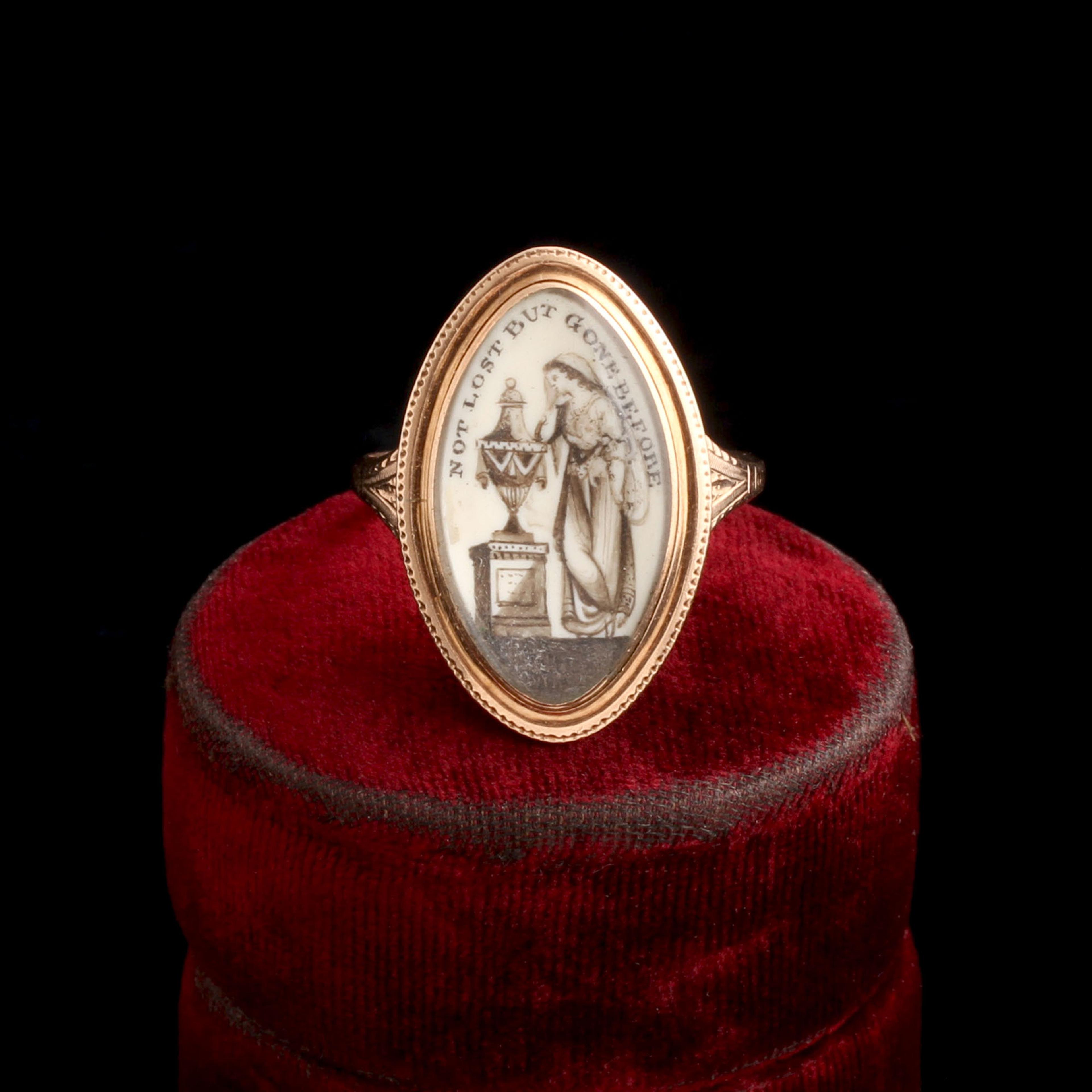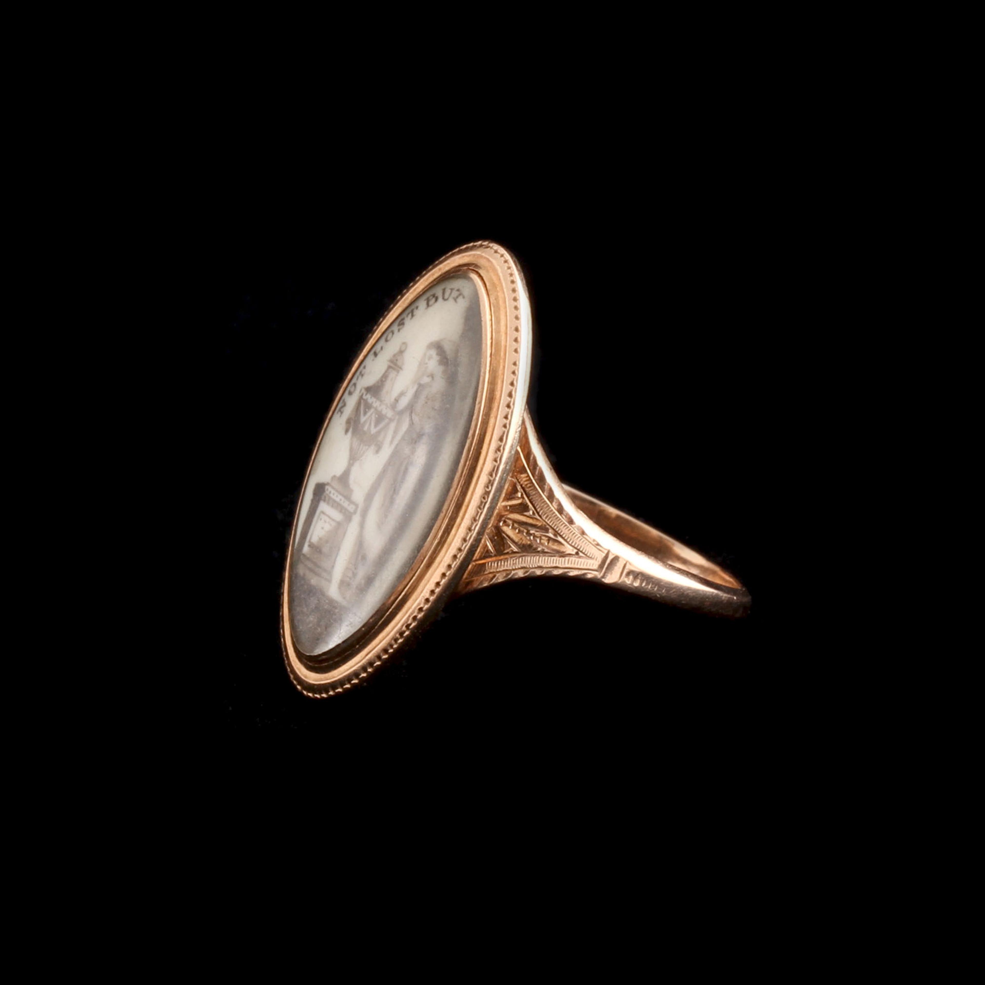 This ring was made to commemorate D Smyth, who was 45 when he died. The year was 1783; that February, Great Britain acknowledged the independence of the United States of America. The sentiment "NOT LOST BUT GONE BEFORE" is rendered in a type of ink we're not used to seeing anymore: a mix of sepia (cuttlefish ink) and chopped-up hair, likely Mr. Smyth's. The phrase means, essentially, "See you on the other side". The Neoclassical veiled woman leaning on an urn could be considered the 18th century emoji for "mourning".