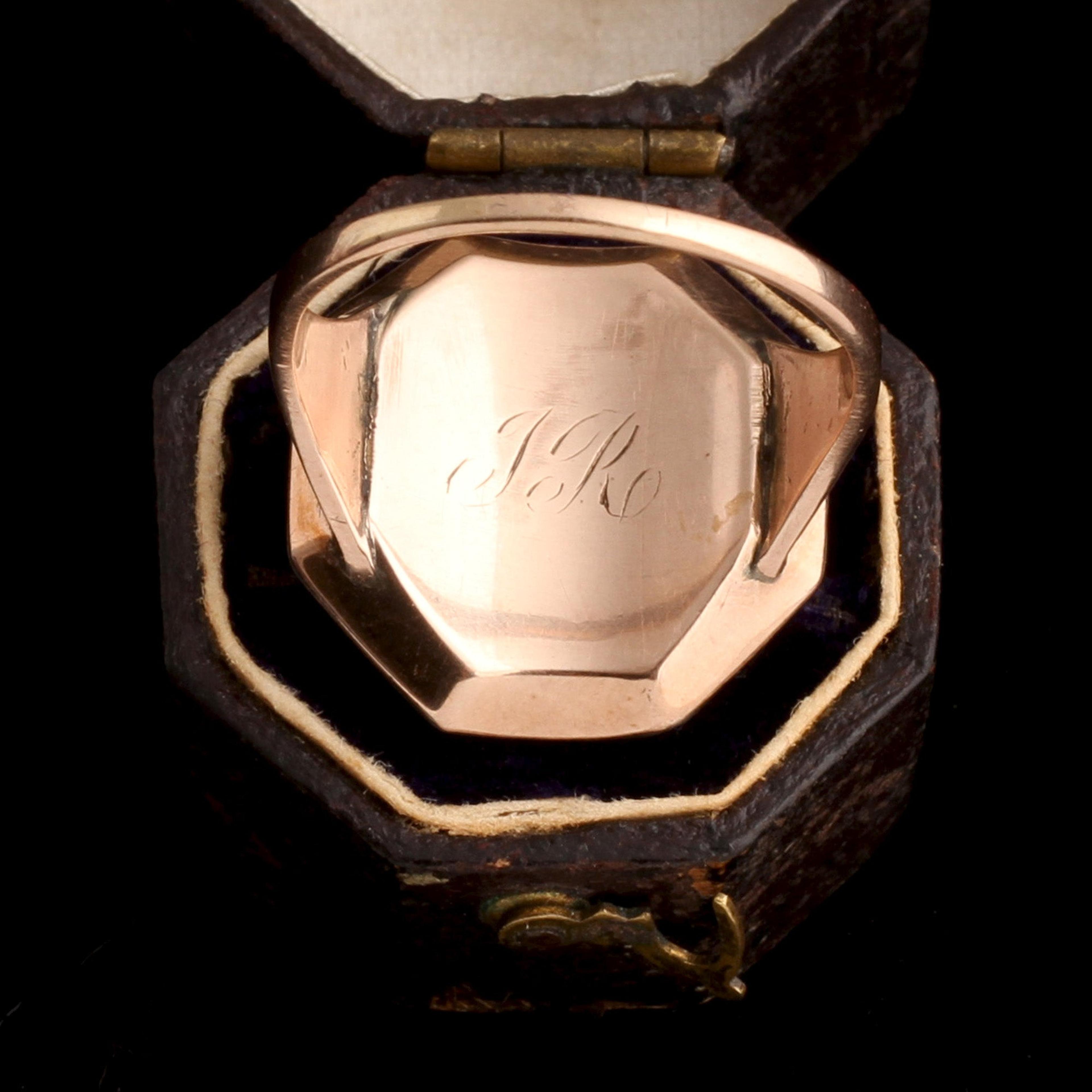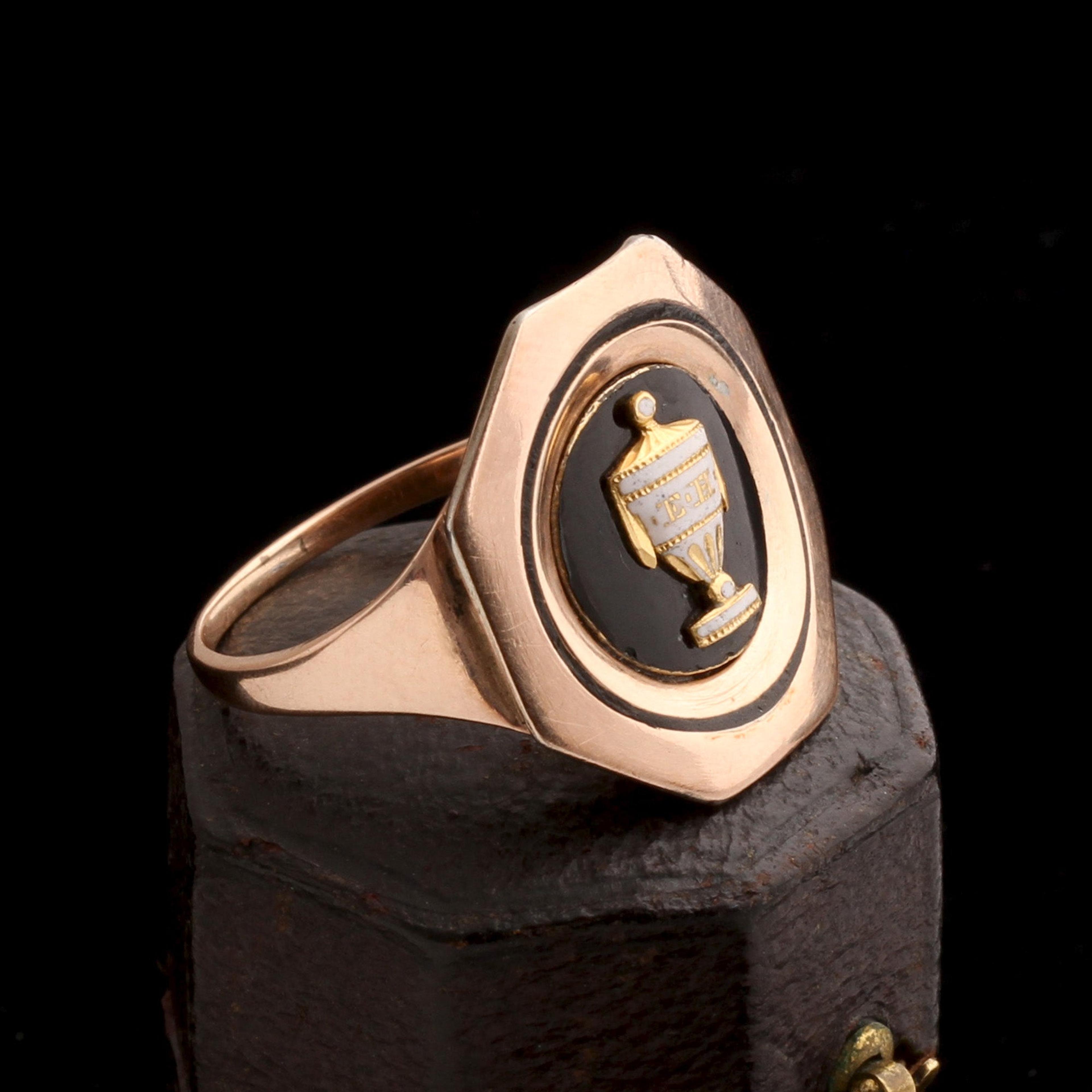 Sometimes we can pinpoint the exact funeral at which these types of mourning rings were distributed to friends and family of the deceased. This one, though, is full of mysteries. “EH” is being remembered, because his or her name appears on the white urn.On the reverse, the recipient's initials: “JR”.