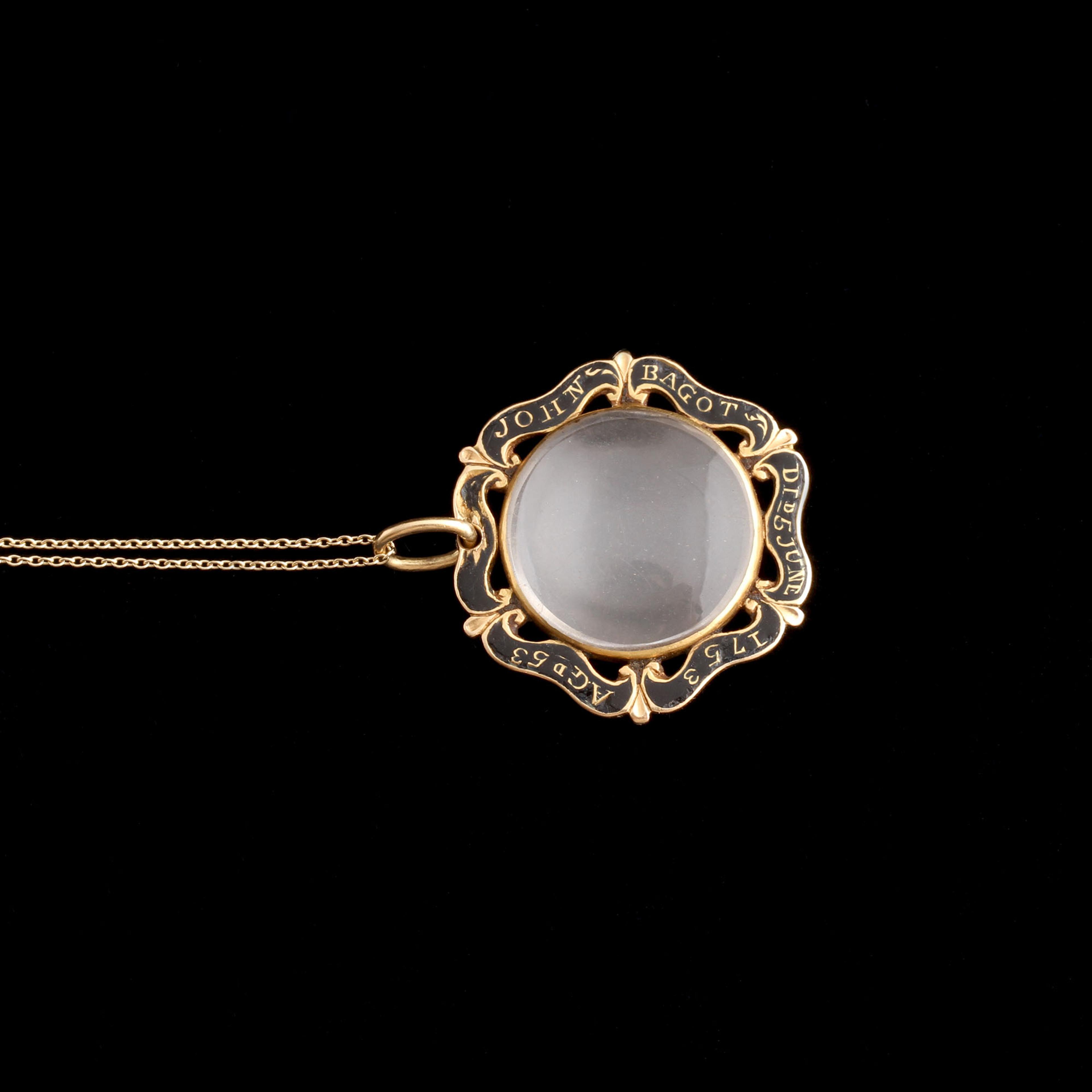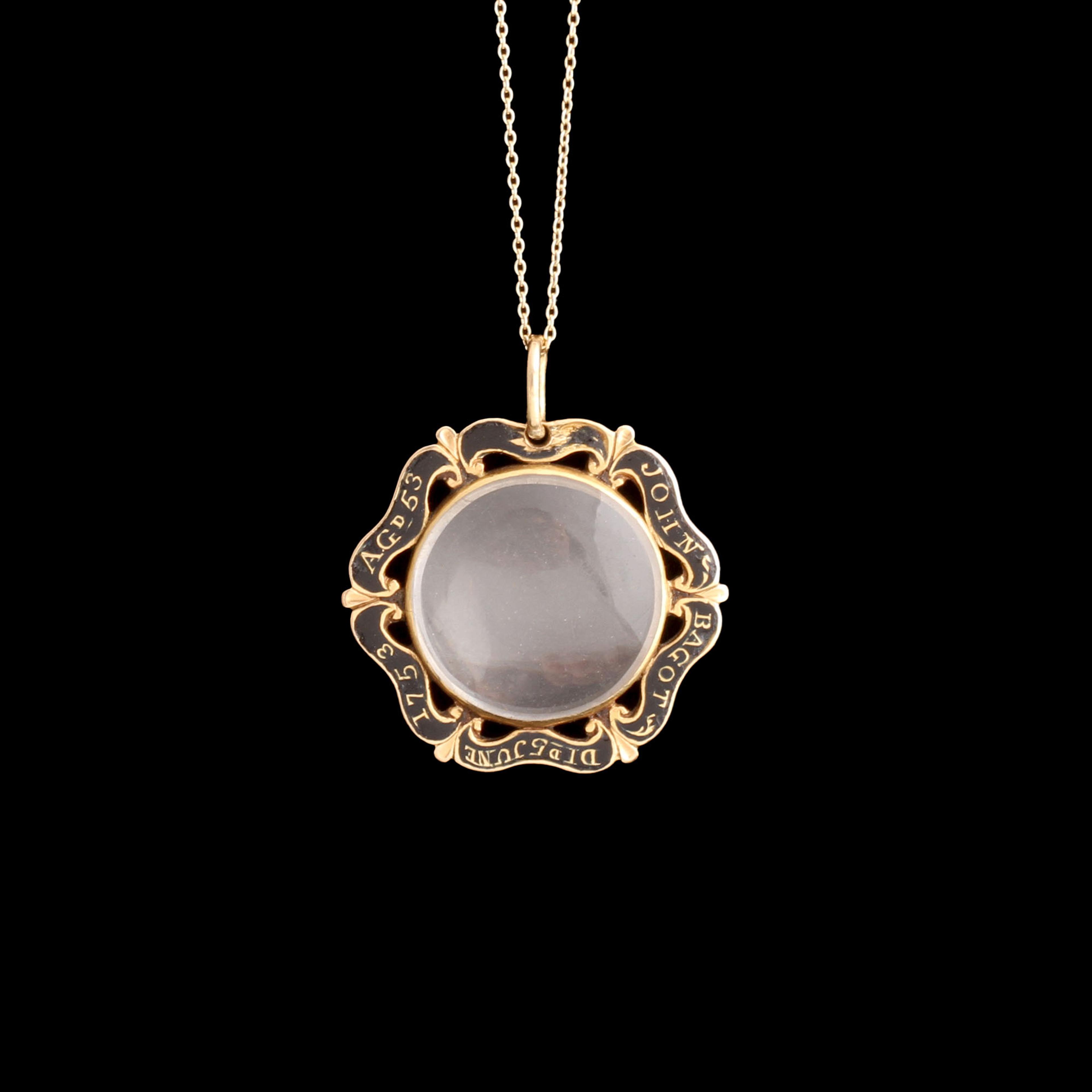 We imagine this locket is dedicated to a fiancee who died before the pair got to do the marriage "thing". The reverse side is enameled in the same way, but the gold letters on black enamel say "John Bagot Di[e]d 5 June 1753 AG[E]D 53". Hopefully the lover left behind didn't have to wait too long to join her lover (CARNALLY!) in heaven. A truly unique object.