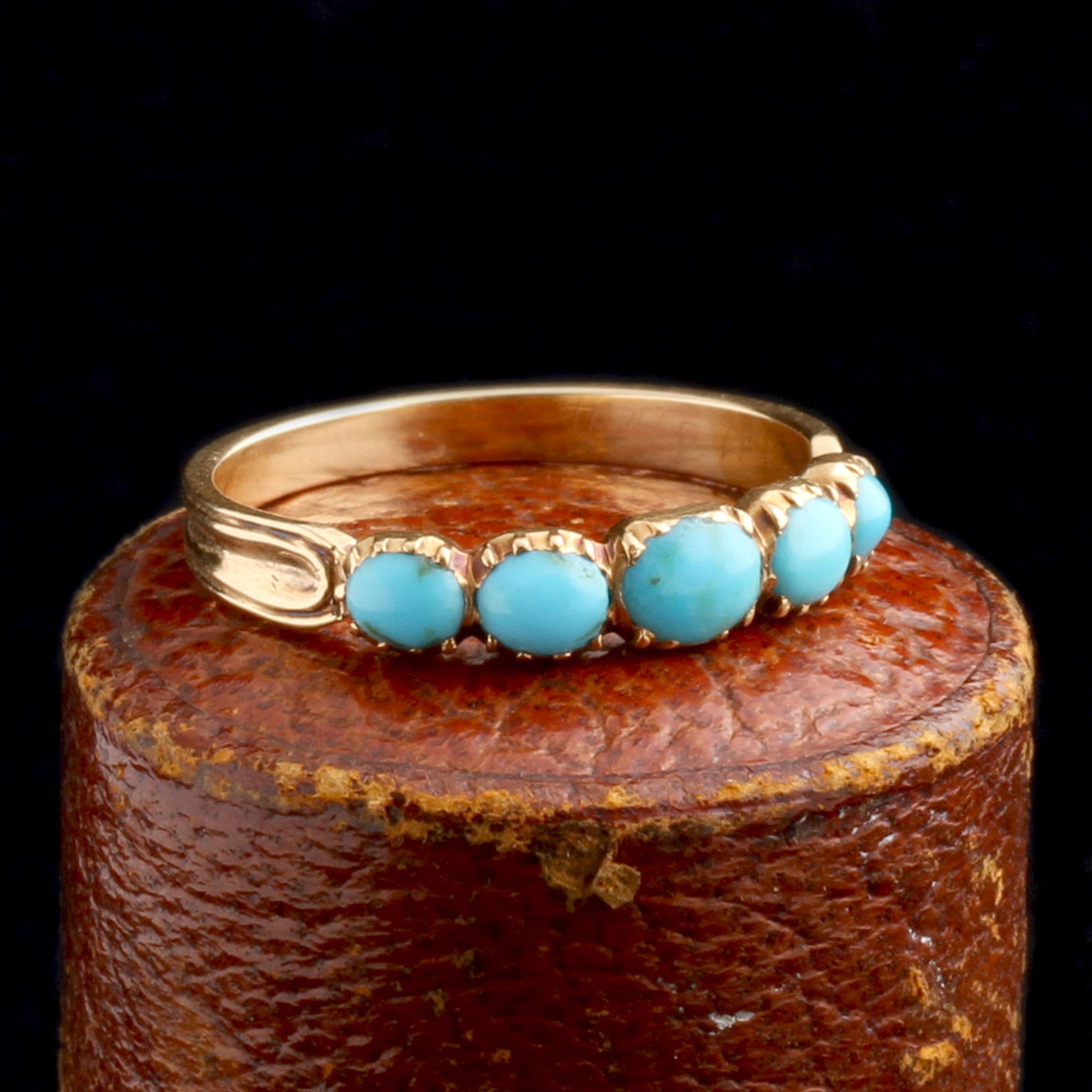 Squat little oval cuties line up along this Georgian half-hoop. Made around 1820 with graduated turquoise cabochons that subtly show off their darkened age spots.