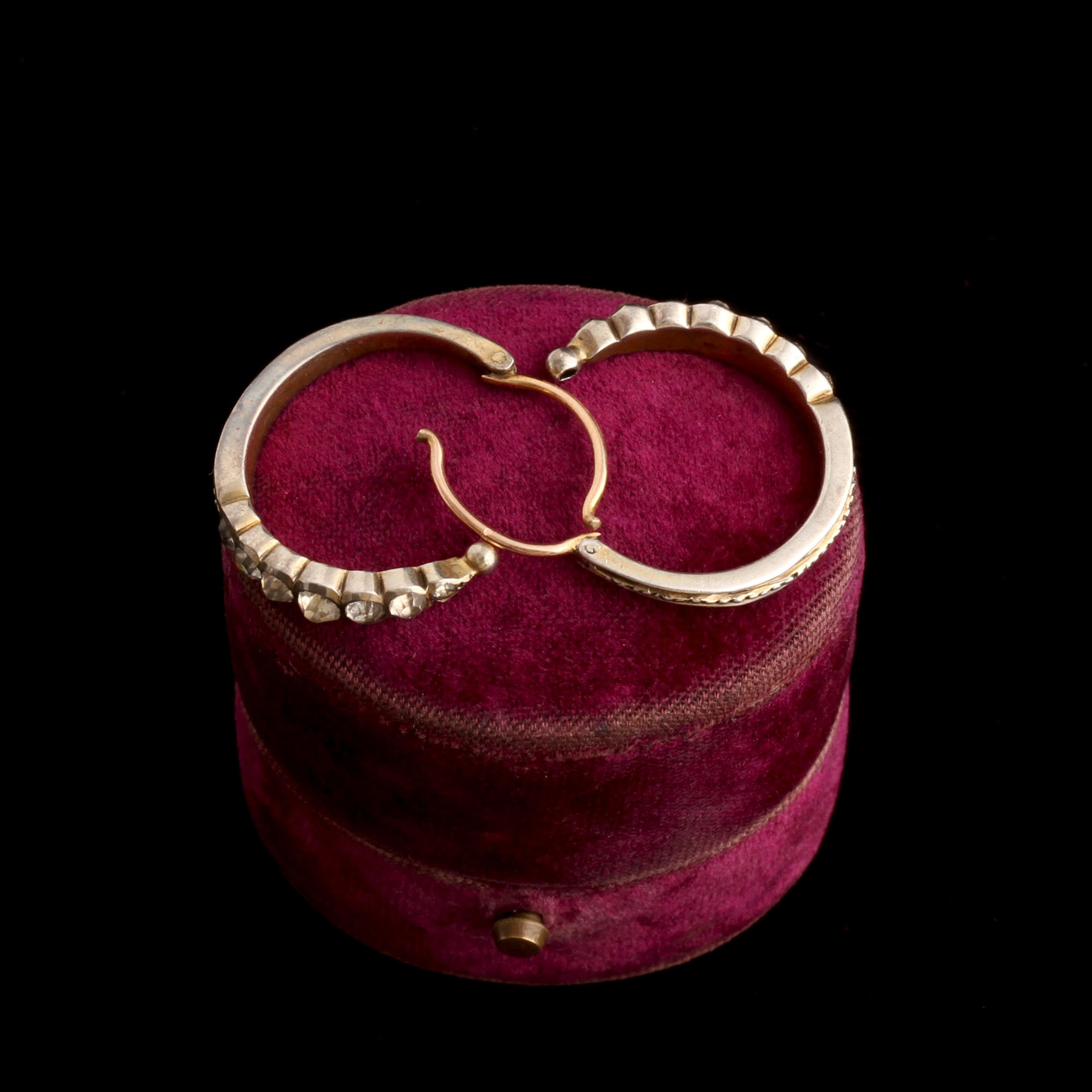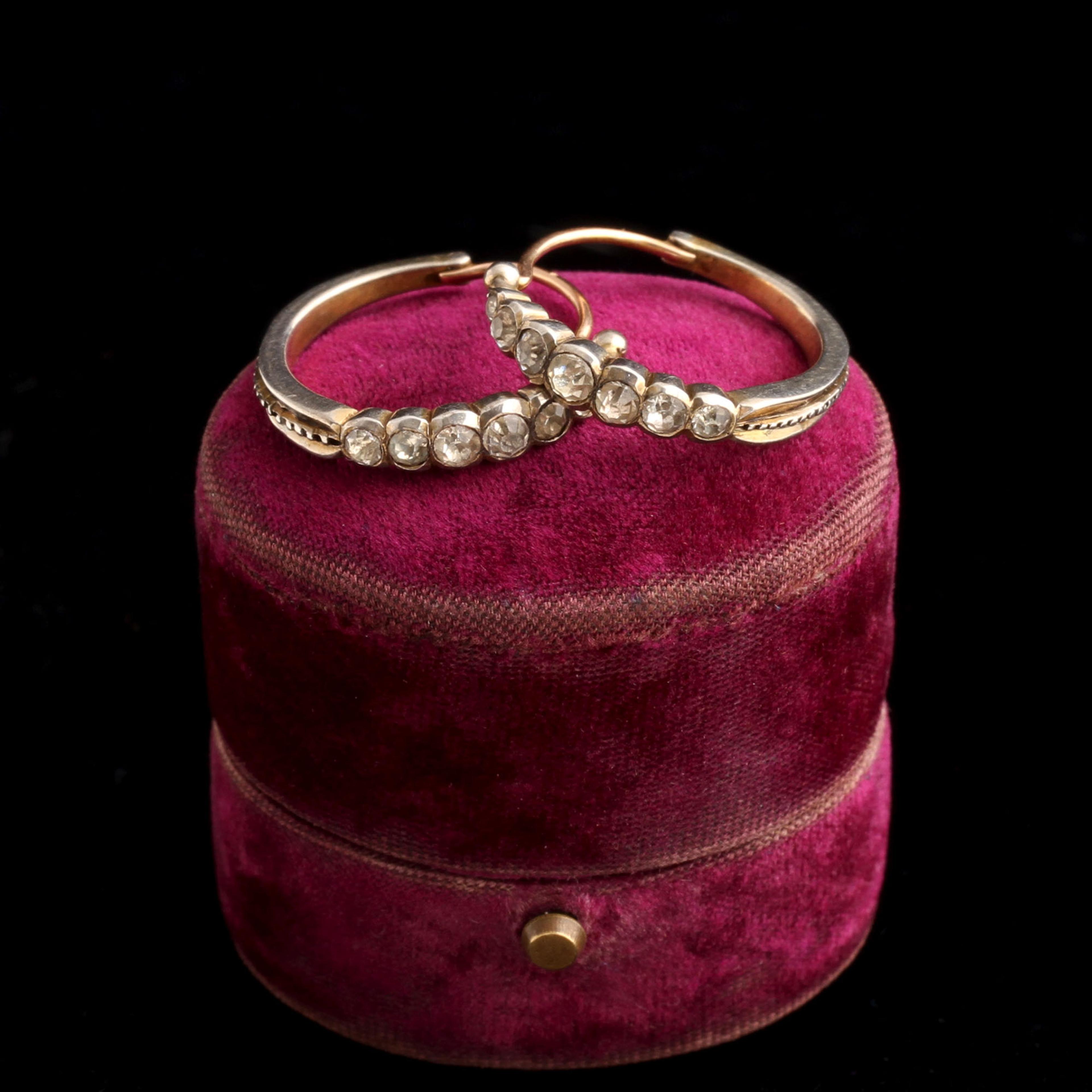 A just about perfect pair of minimal Georgian hoops modeled in gold and silver and set with graduated white pastes.