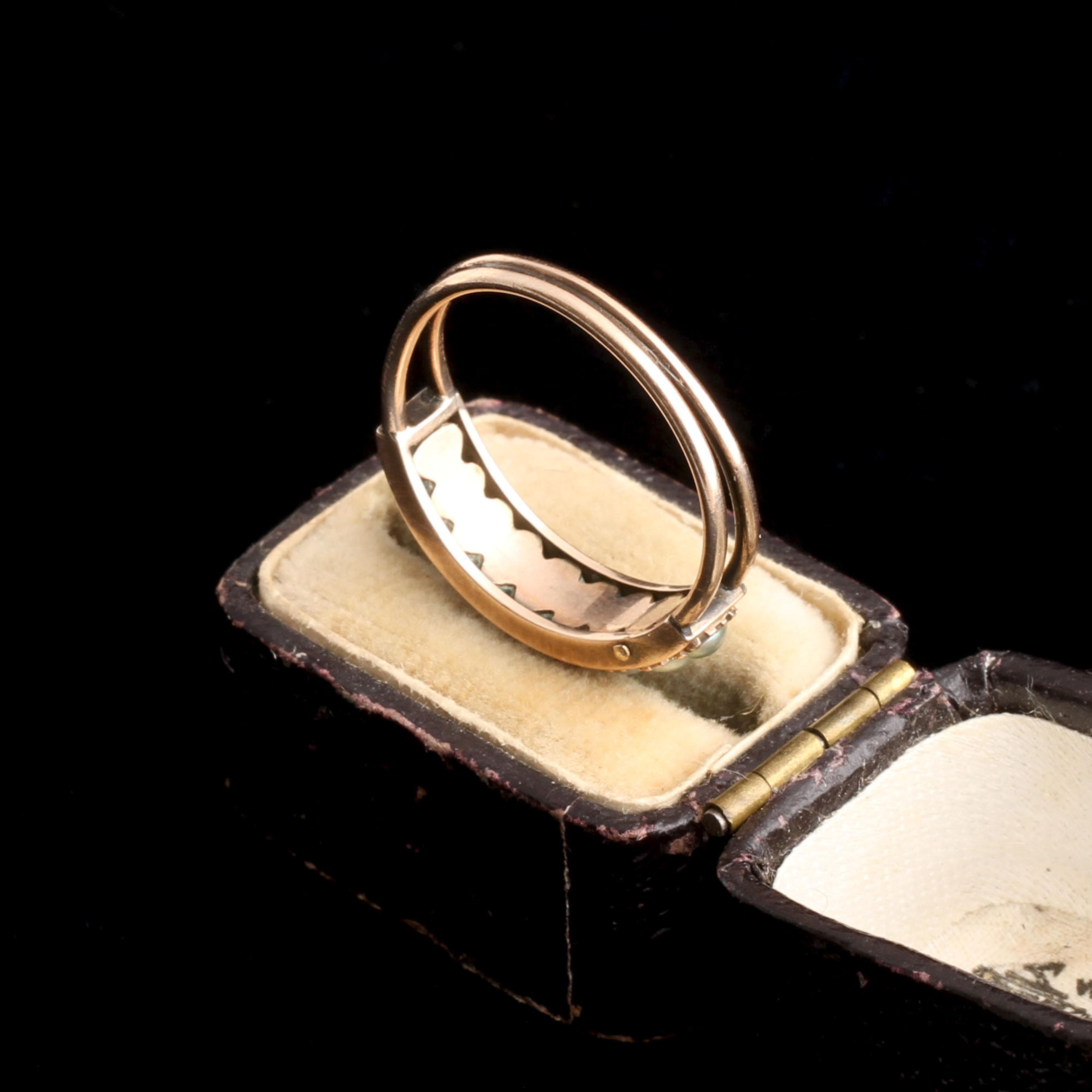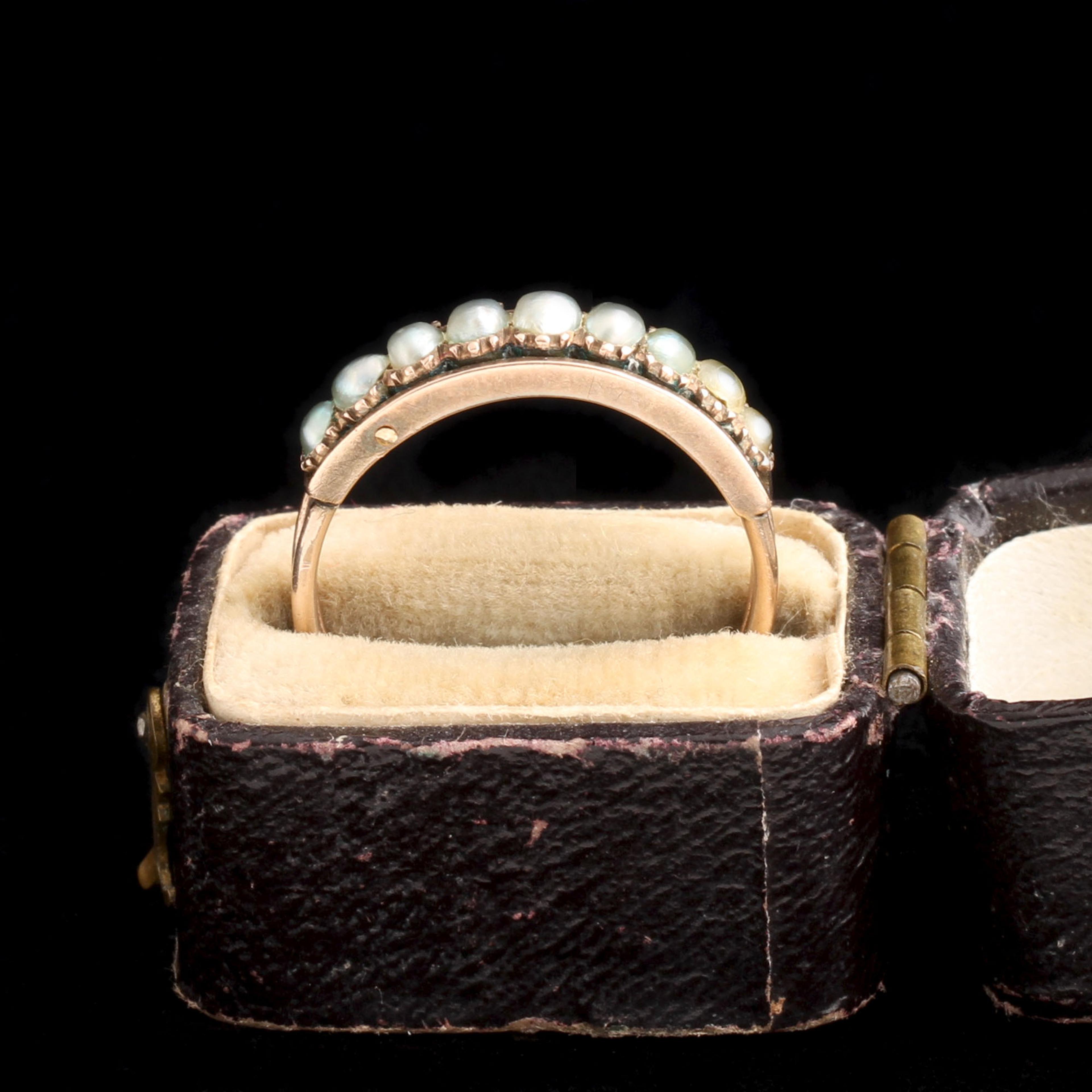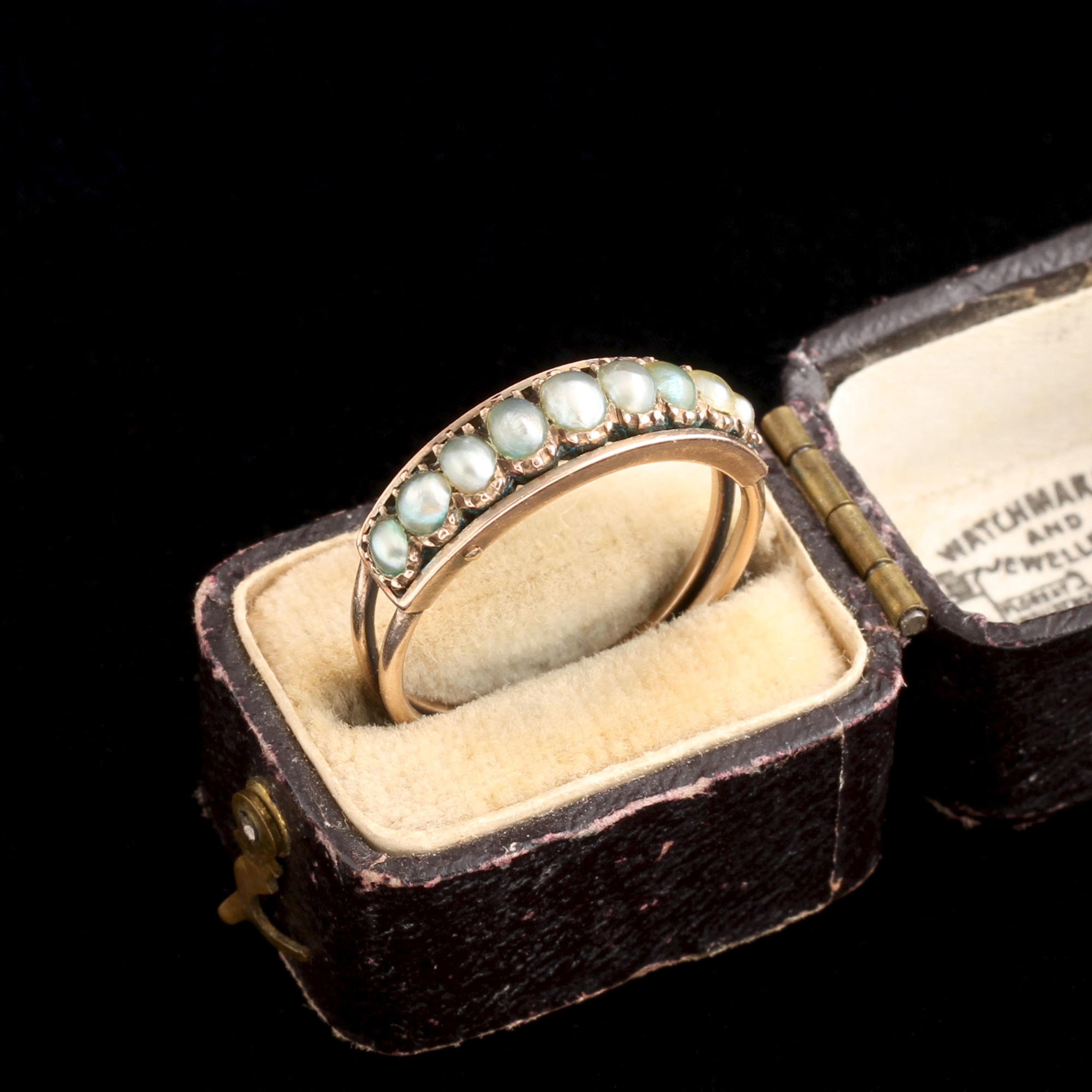 A later Georgian half hoop ring set with nine pearls and a twinned hoop. An old repair on one side consists of a small gold peg - presumably added to reinforce the connection between the frame and the arc of pearls.