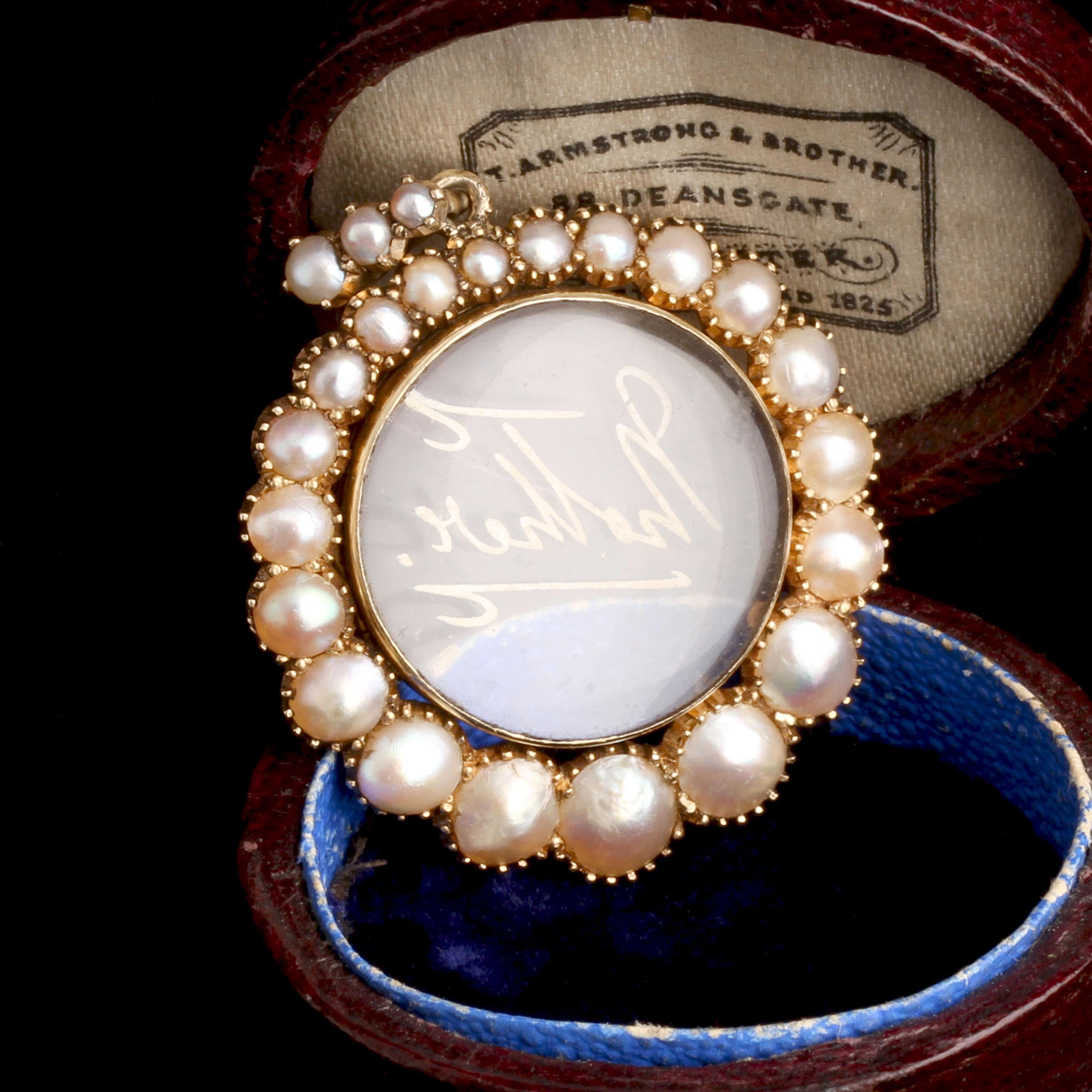 THIS PEARL LOCKET, crafted around 1800 in typical Regency style, features natural split pearls and a rock crystal lens. About a century later, a Victorian/Edwardian jeweler modified this family heirloom by carving the word "Mother," in reverse into the rock crystal. We believe the engraving was done in Mother's own handwriting.