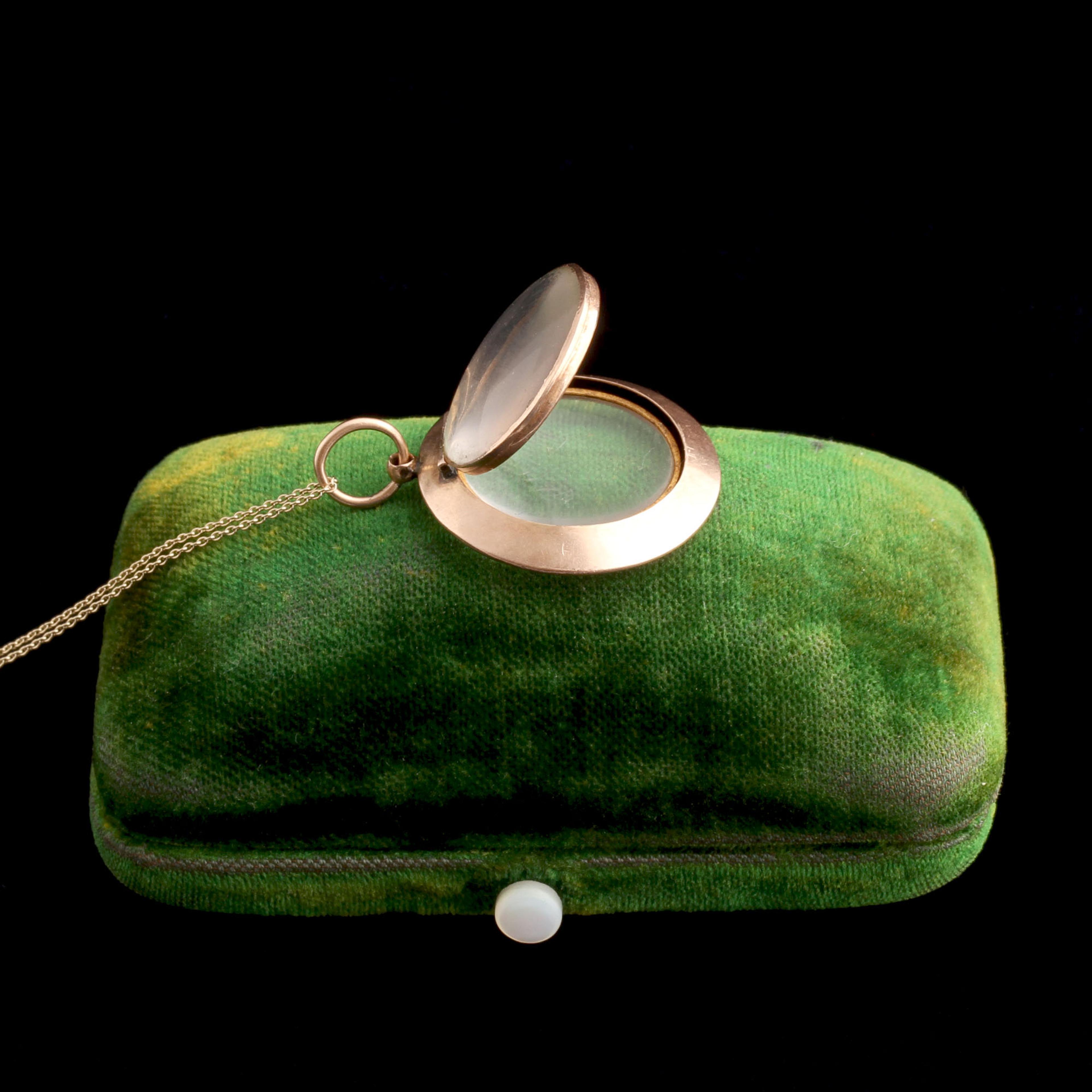 Elegant in its simplicity, this Georgian locket is modeled in gold with a reeded edge framing the central glass lens and a hinged panel at the back. On a new 14k gold chain.