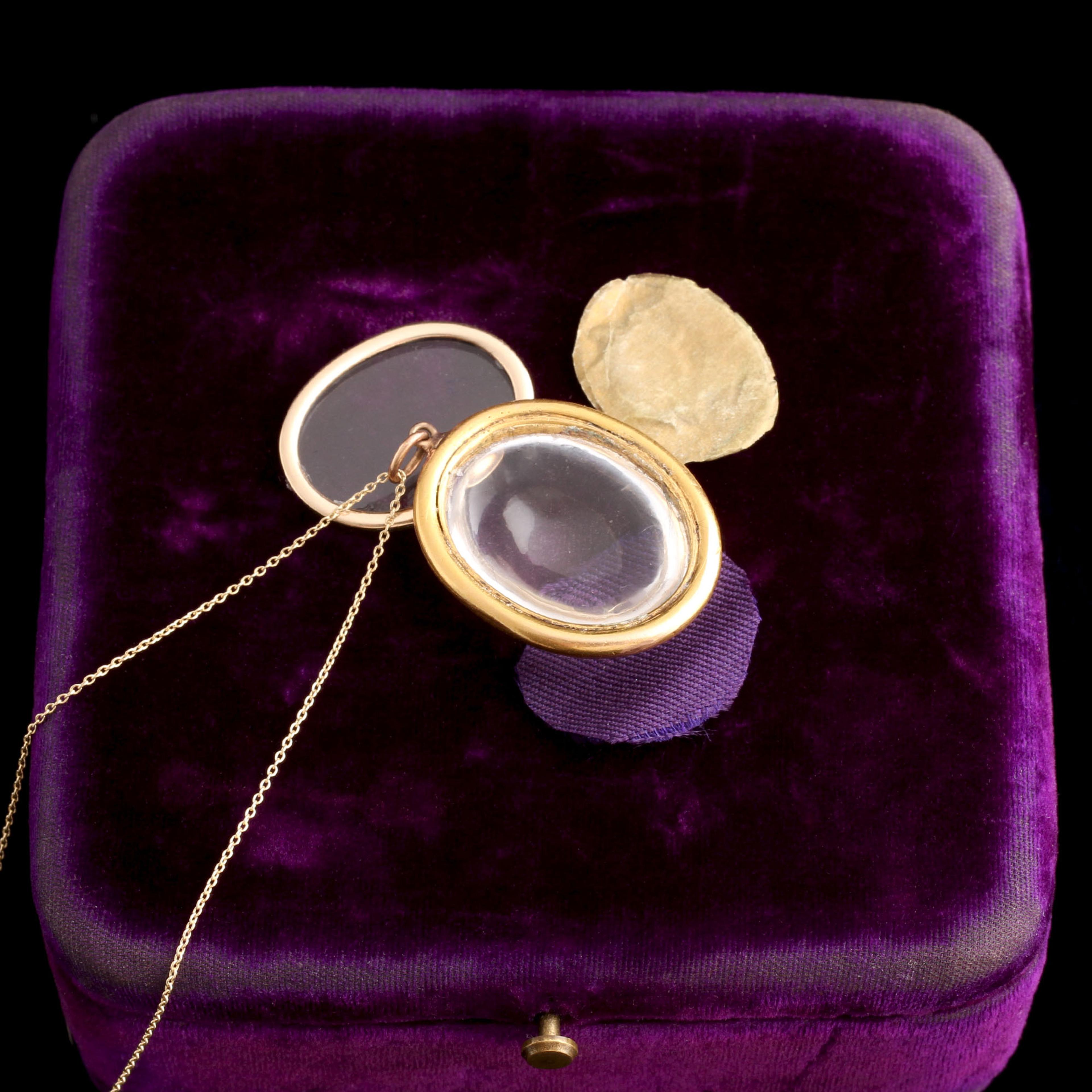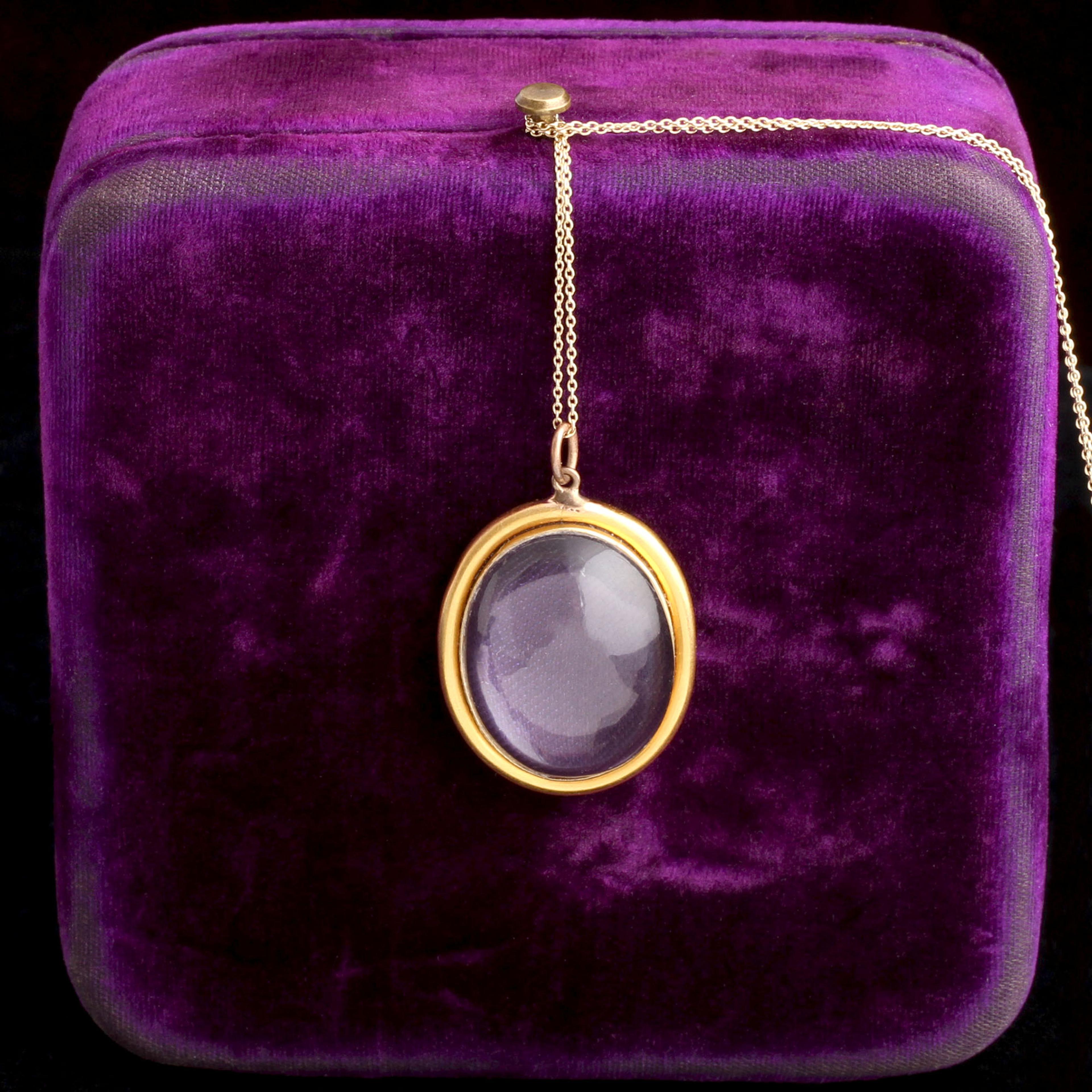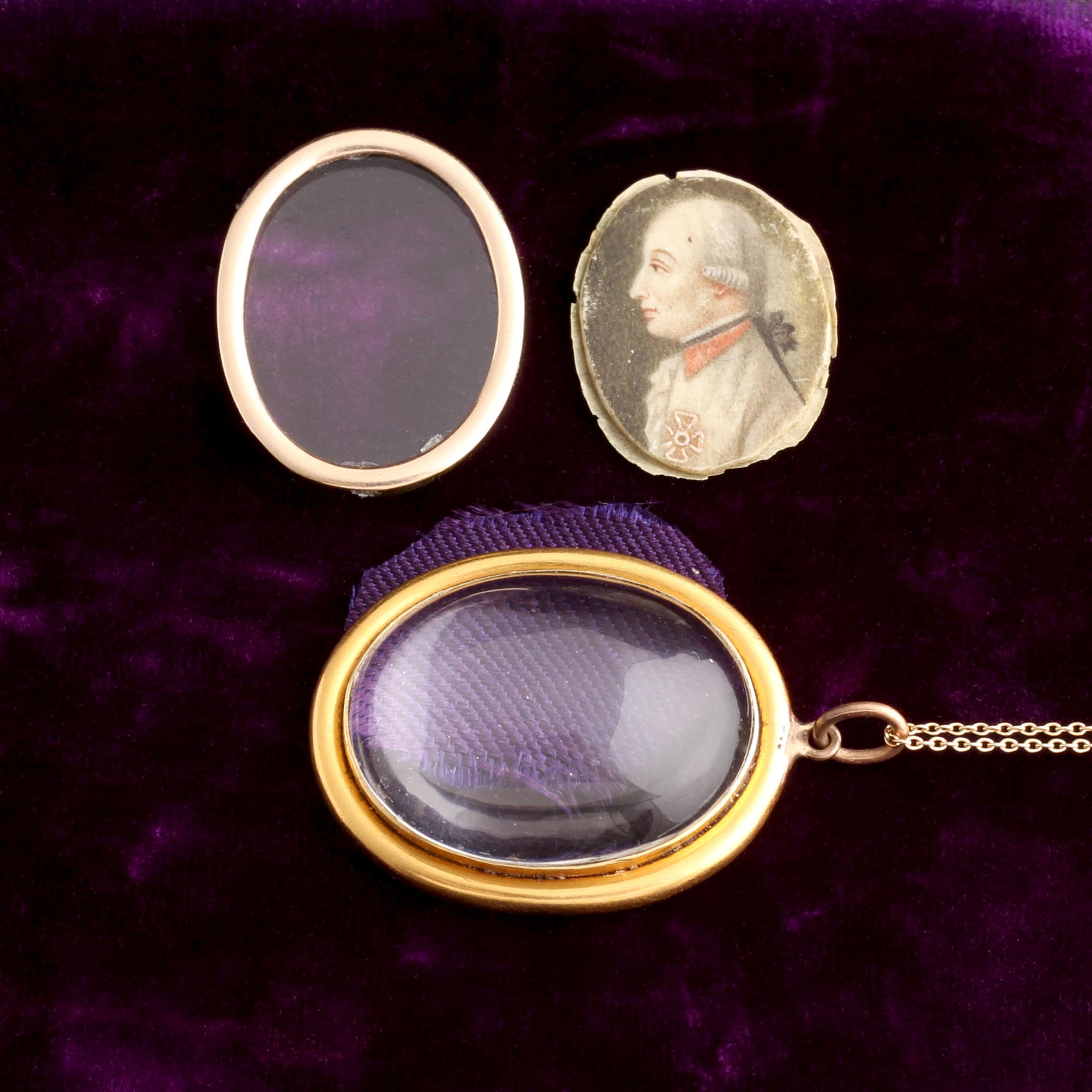 An exquisitely simple, finely made late Georgian locket with a heavy gold frame and domed oval rock crystal. The reverse side holds a locket with a hand-painted portrait of a gentleman in a George Washington-esque wig. The lens at the back is easily removed to swap out the portrait or the swatch of purple fabric.