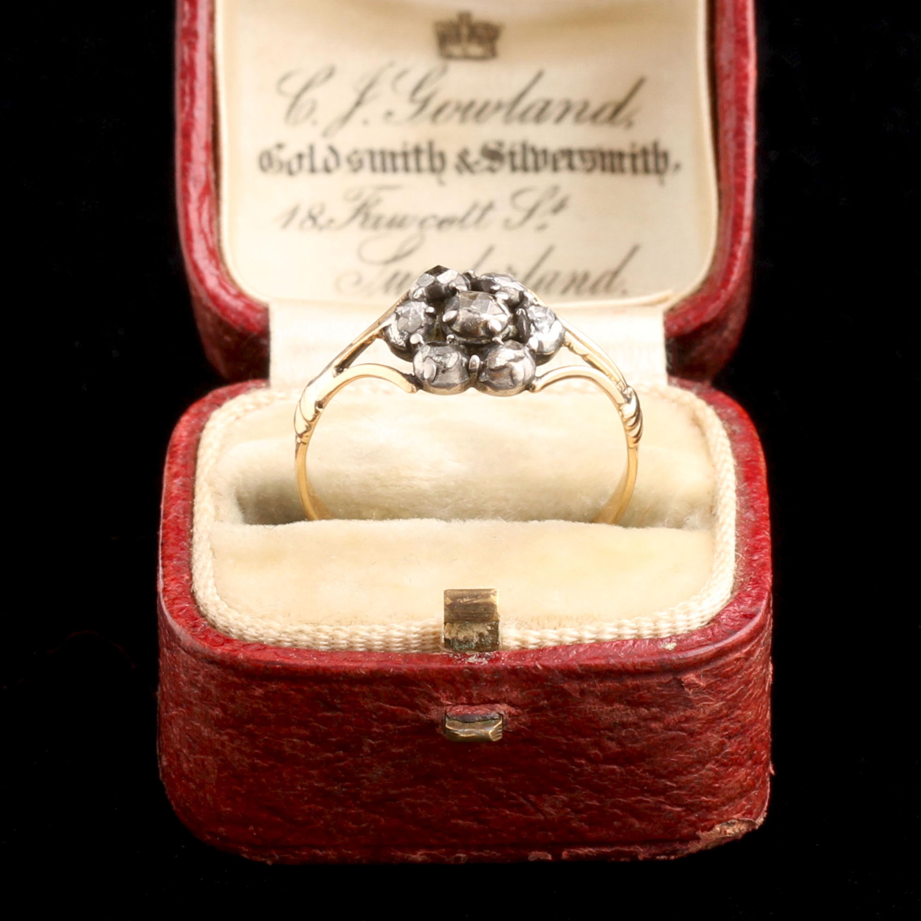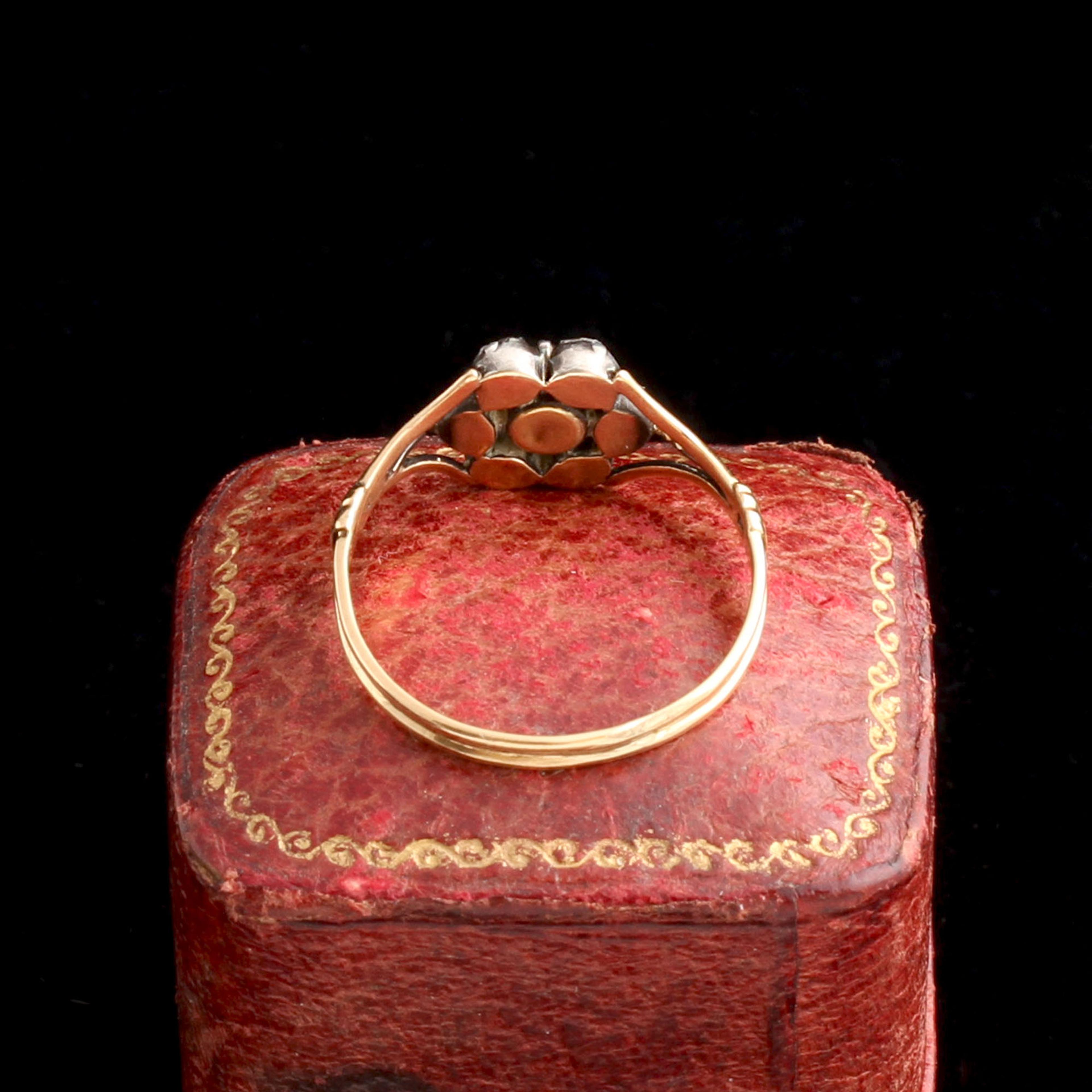 This diminutive diamond cluster ring dates from around 1800. The stones (rose cuts with a single table cut in the halo) are set in silver collets and backed with foil, which was the standard practice for setting transparent gems up until the early Victorian period. These stones have a slight gray tint, probably owing to the age of the settings, but still have a formidable sparkle. (Please note that it is best not to immerse foil-backed diamonds in water as it is possible for moisture to seep behind the stones, this means no wearing this beauty in the shower or the swimming pool).