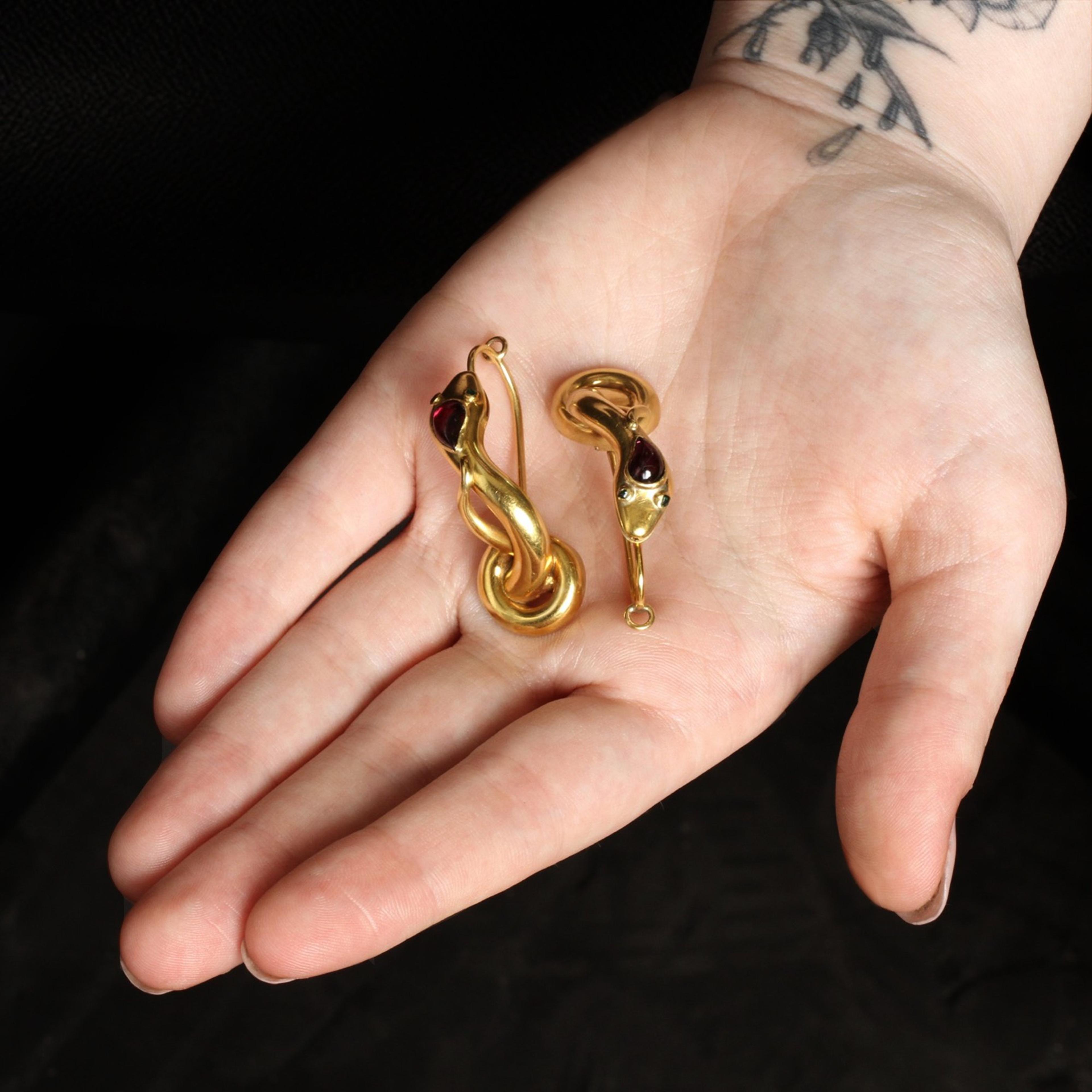 Each of these phenomenal late Georgian snake earrings have faceted emerald eyes and a head set with a deep purplish red garnet in the shape of a witch's heart. The back-to-front closures fasten at the top of each tooth-filled mouth. The wires feature loops that were probably designed to be attached to a wig, but for our more modern purposes, they will rest at the back of the earlobe to stabilize the weight of the earrings and keep them facing forward.