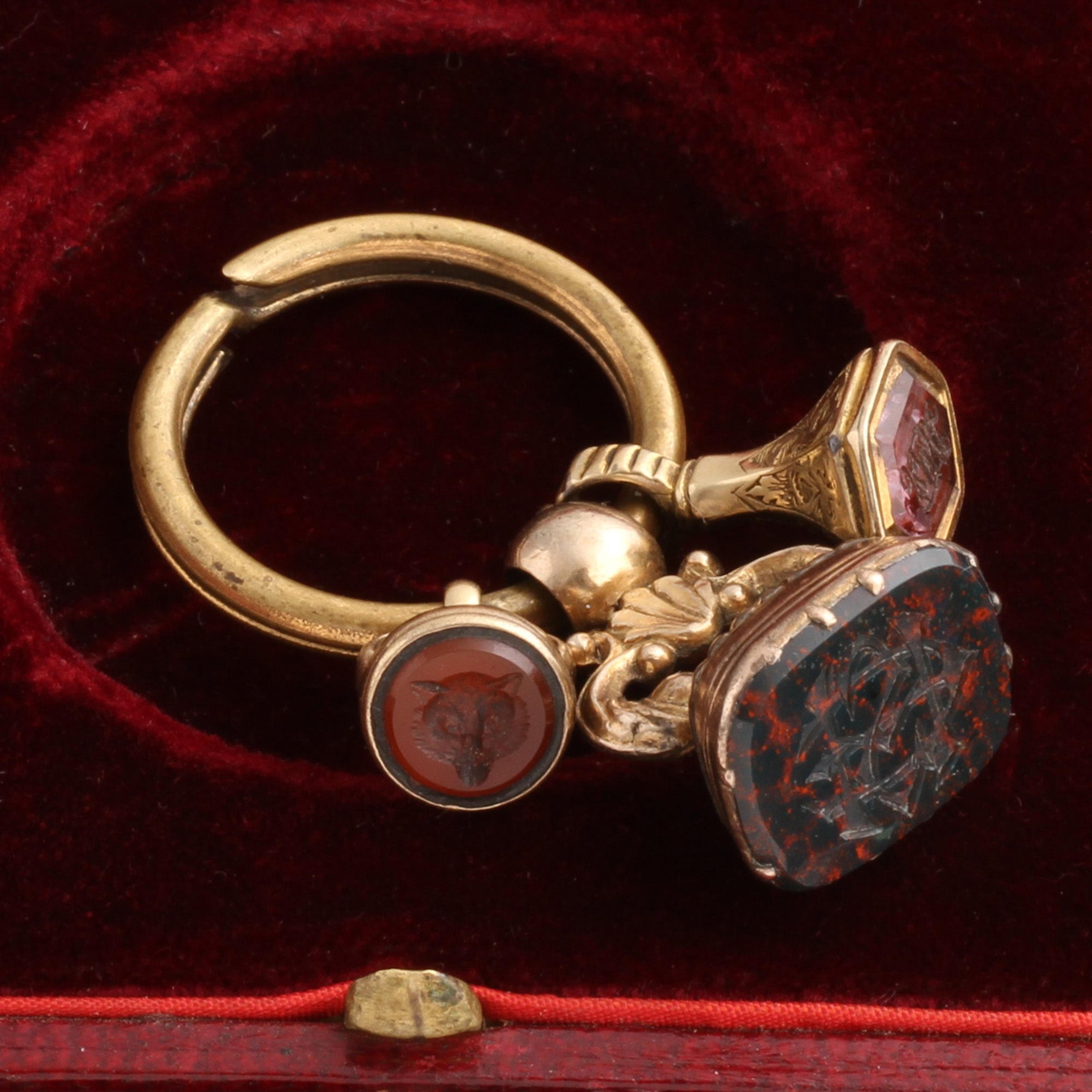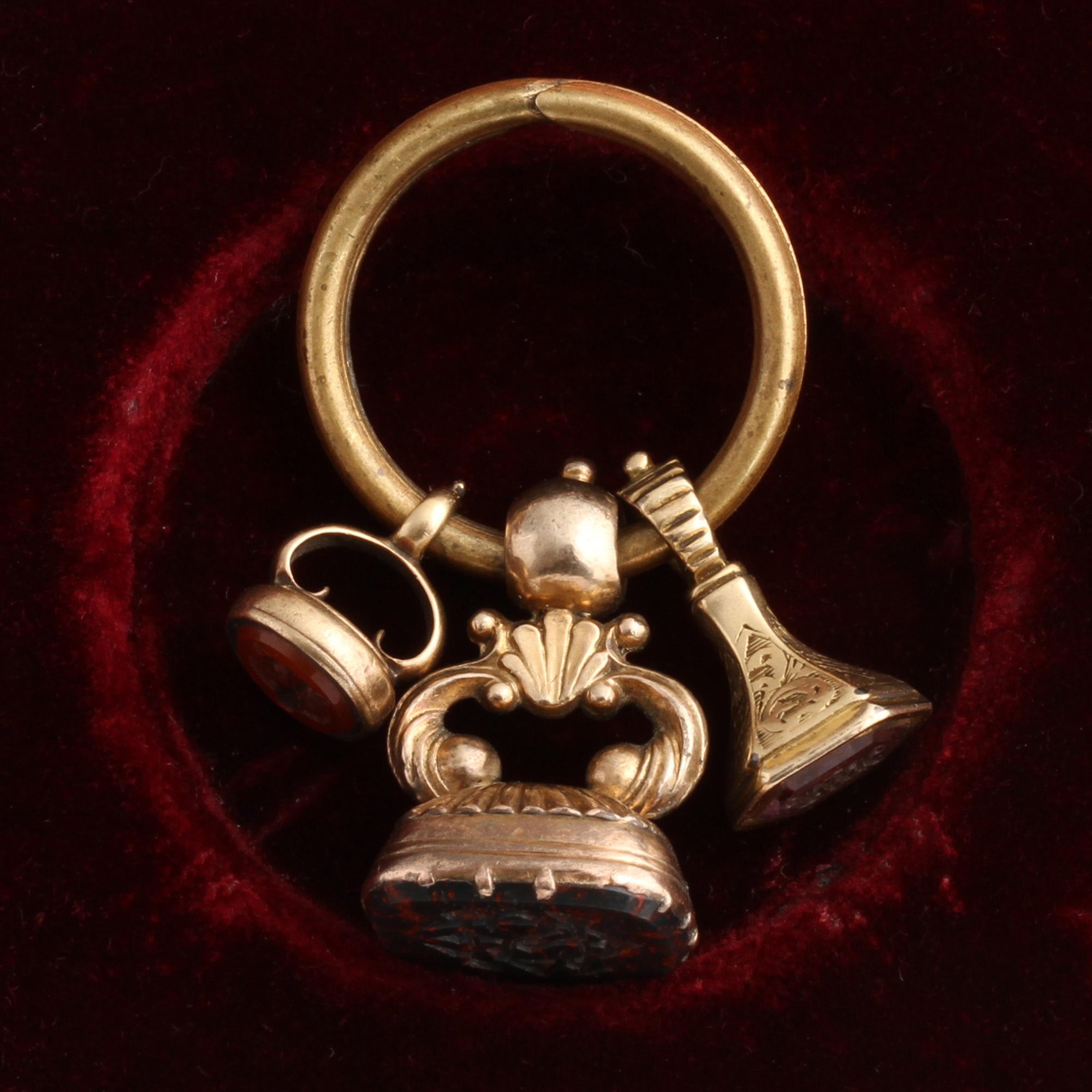 A trio of Georgian wax seals threaded onto a split ring. Fashioned in base metal, the three seals feature a carnelian fox, the initials "VWH" in amethyst and "ESH" in bloodstone.