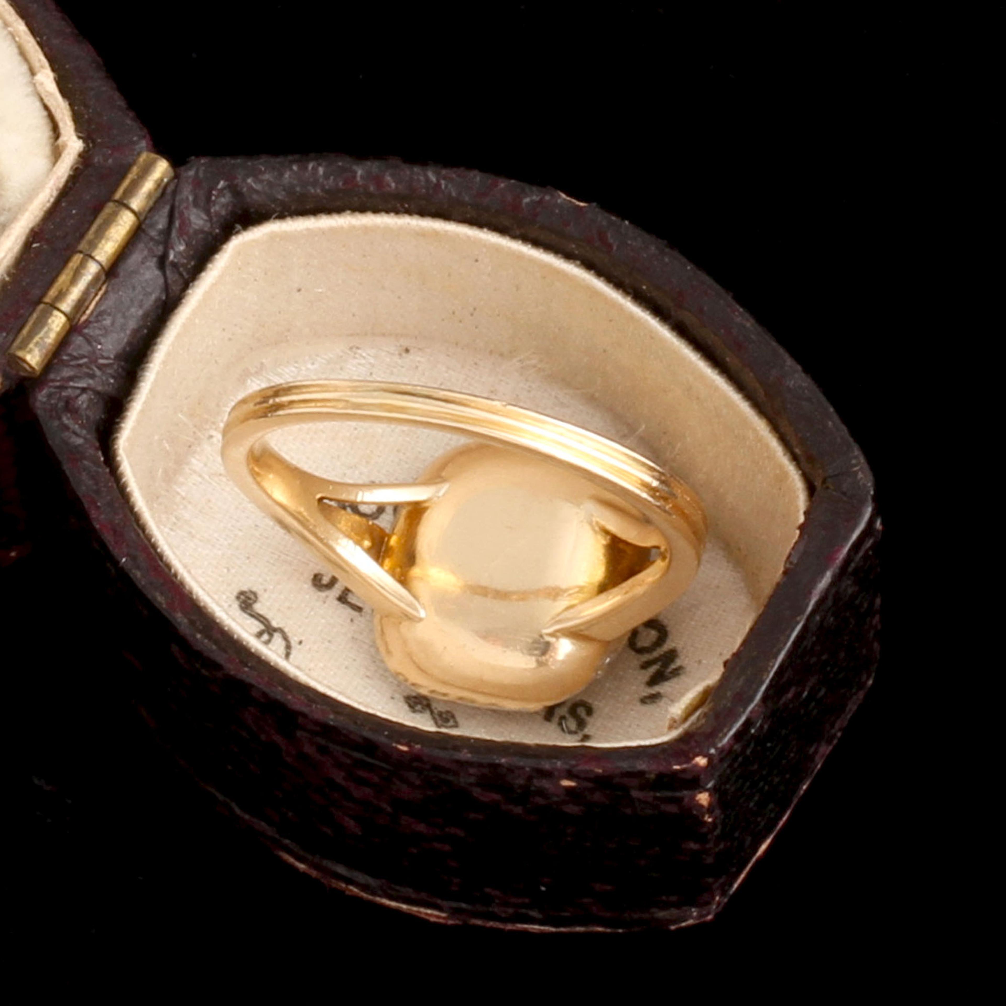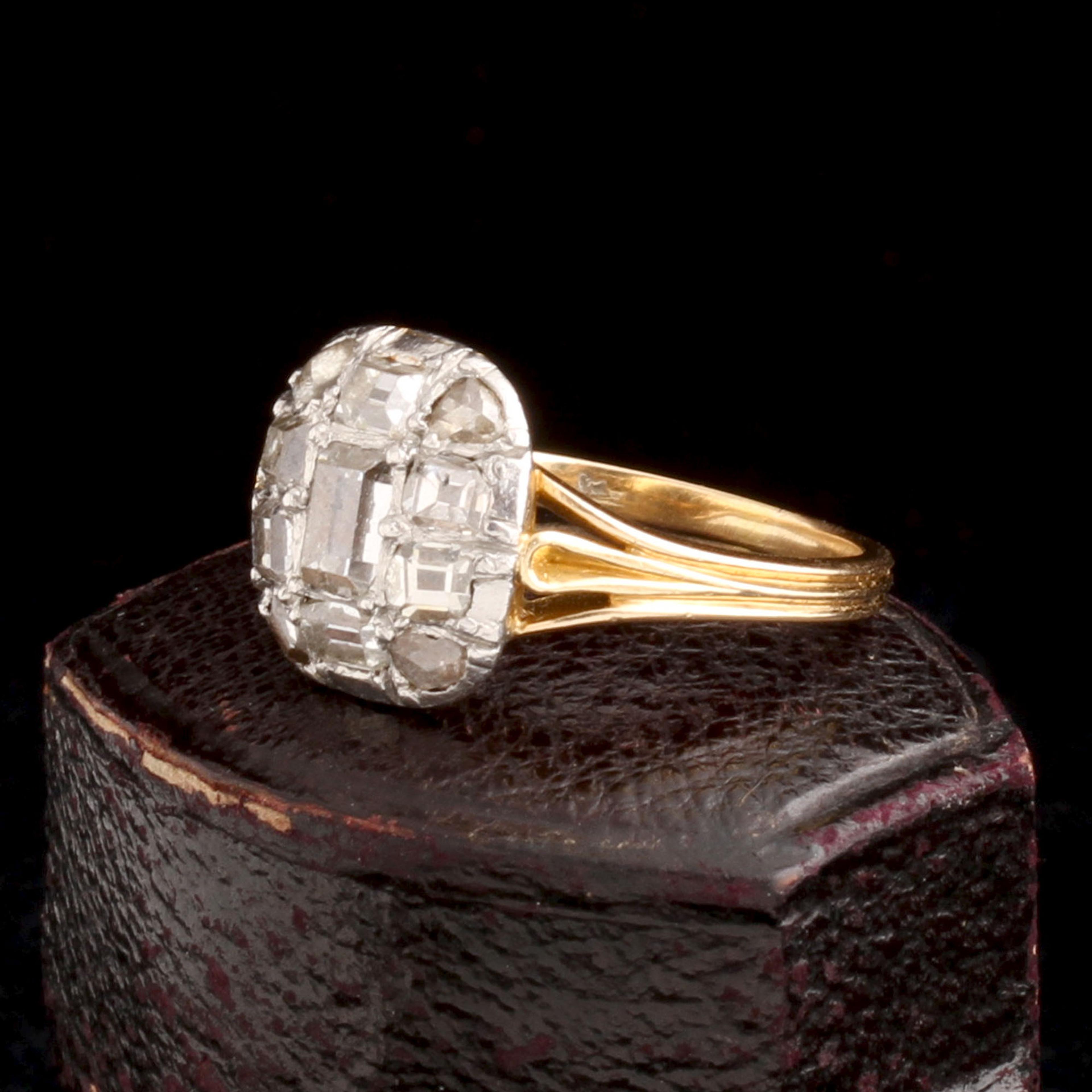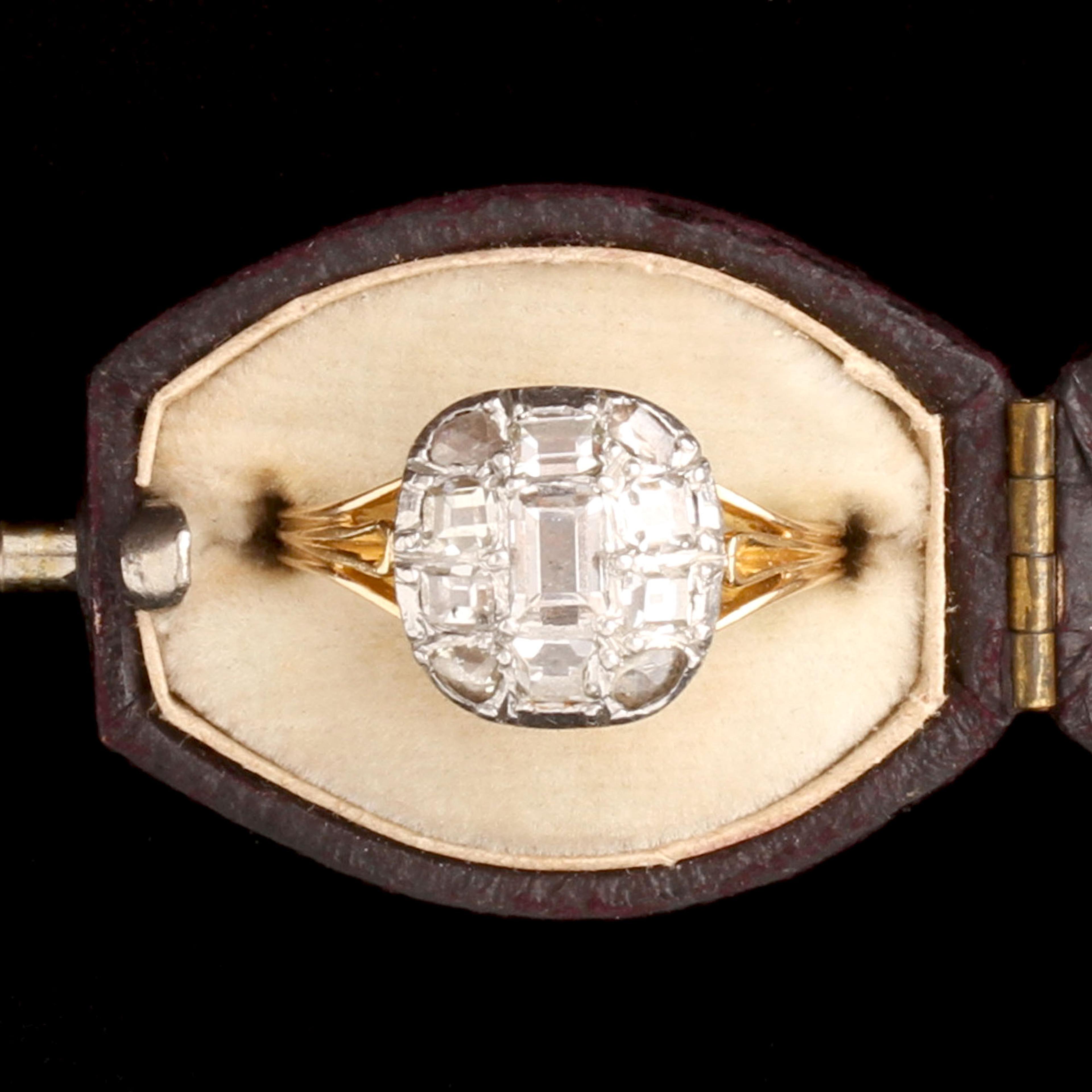 The boat-shaped marquise diamond cut was developed around this time, supposedly to imitate the smile of Louis XV’s mistress, the marquise de Pompadour. Paste — an imitation gemstone made from leaded glass — was newly developed in the 18th century, and set into jewelry with the same creativity and care as its more precious counterparts. Real and imitation gems were almost always set in closed-backed settings, lined on the underside with thin sheets of foil to enhance the color of the stone and highlight it's sparkle. This makes Georgian rings tough for modern women to wear, especially on an everyday basis: genteel, jewelry-owning ladies of the 18th century were not famous for working with their hands like we are. Nor did they wash their hands as much as we do. Water will virtually ruin a foiled setting, so take special care with your Georgian ring. Very little jewelry from this period is still in circulation, and it's very difficult to repair.