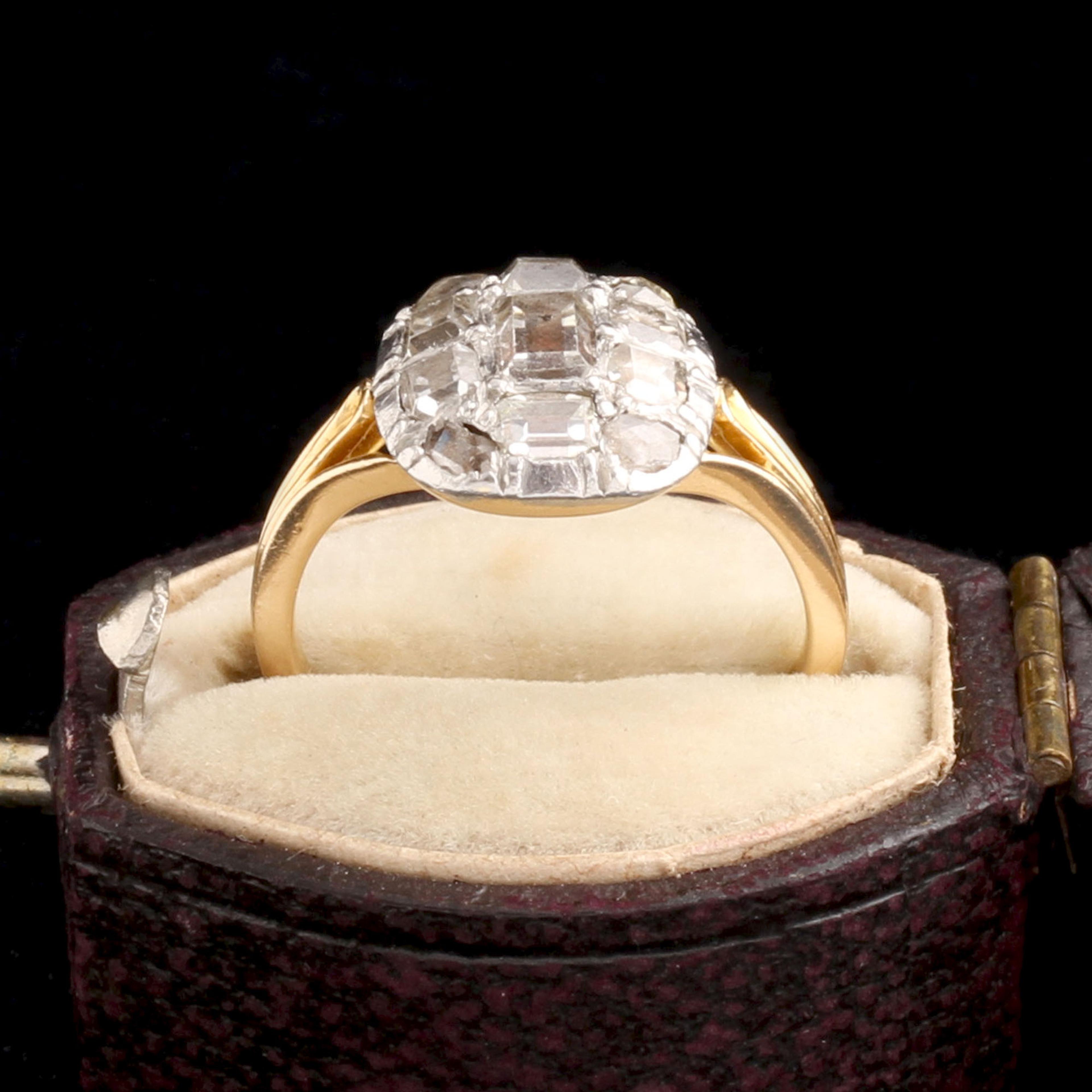 THE TABLE CUT was the first major diamond faceting technique. It has a flat top and four simple facets on the sides. The way to make it: grind off one of the points of the diamond. Here, in a typical early 1800s setting (silver, split shoulders, dished and closed back) 7 table cut diamonds are arranged with 4 rose cut diamonds in a turtle-shell shape.