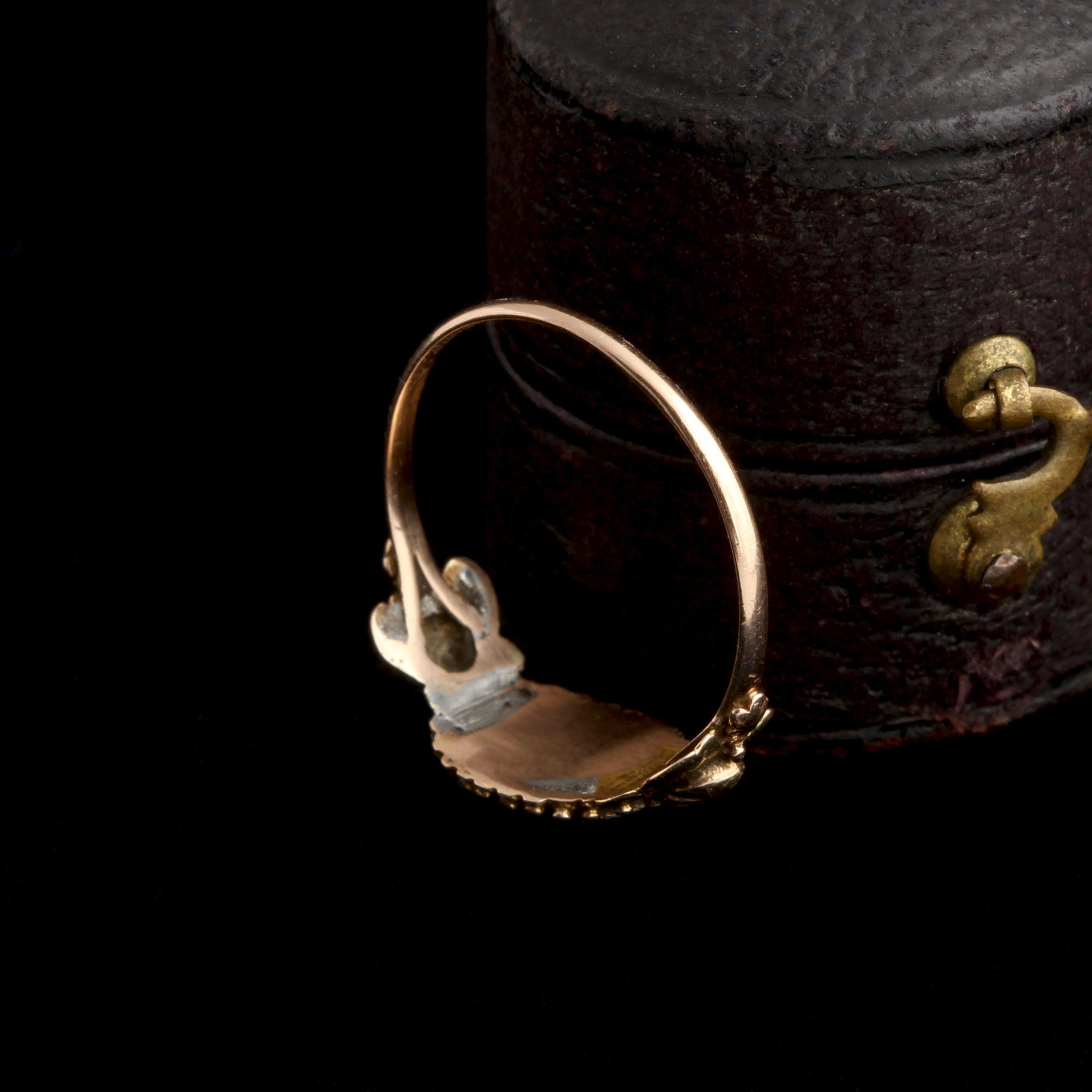 The boat-shaped marquise diamond cut was developed around this time, supposedly to imitate the smile of Louis XV’s mistress, the marquise de Pompadour. Paste — an imitation gemstone made from leaded glass — was newly developed in the 18th century, and set into jewelry with the same creativity and care as its more precious counterparts. Real and imitation gems were almost always set in closed-backed settings, lined on the underside with thin sheets of foil to enhance the color of the stone and highlight it's sparkle. This makes Georgian rings tough for modern women to wear, especially on an everyday basis: genteel, jewelry-owning ladies of the 18th century were not famous for working with their hands like we are. Nor did they wash their hands as much as we do. Water will virtually ruin a foiled setting, so take special care with your Georgian ring. Very little jewelry from this period is still in circulation, and it's very difficult to repair.