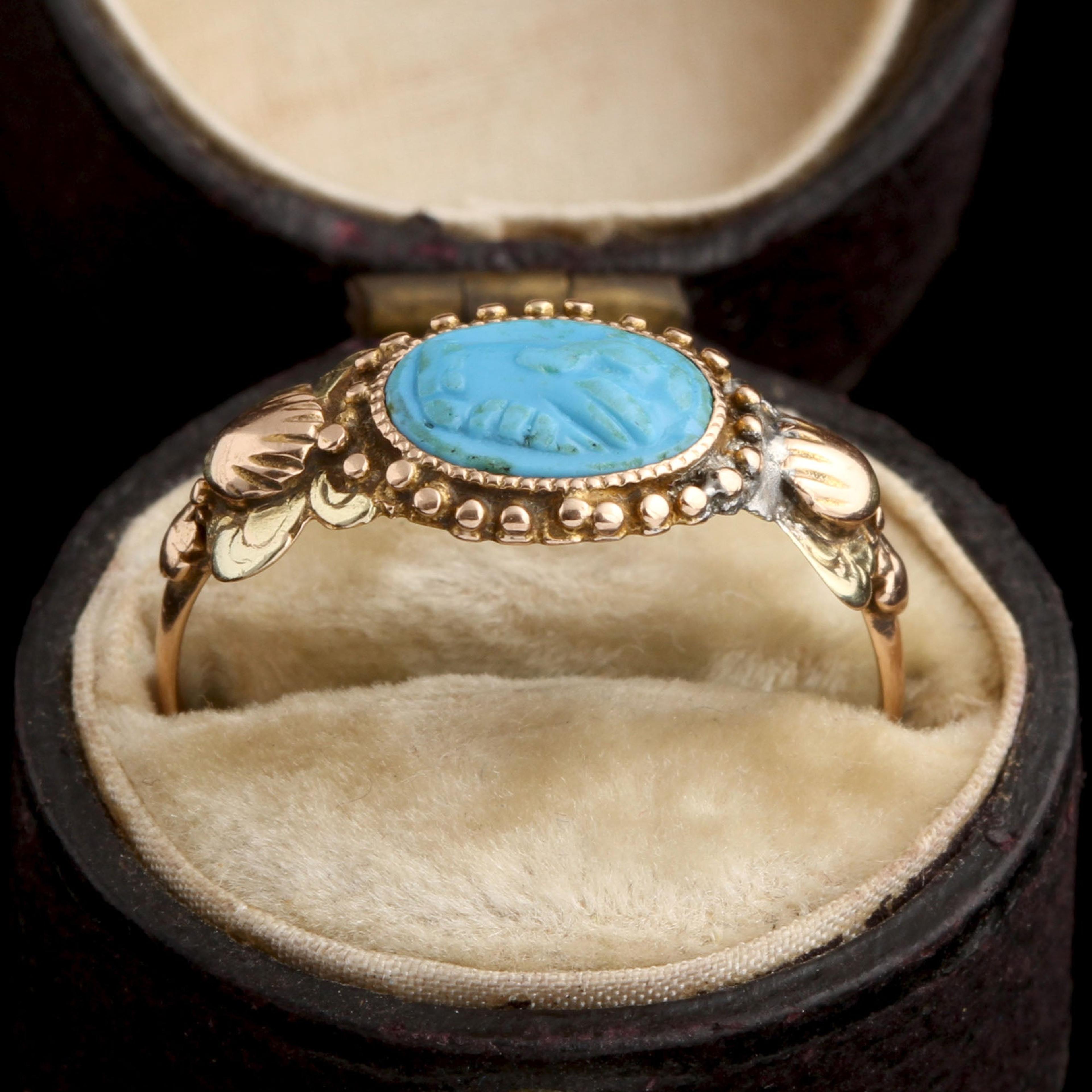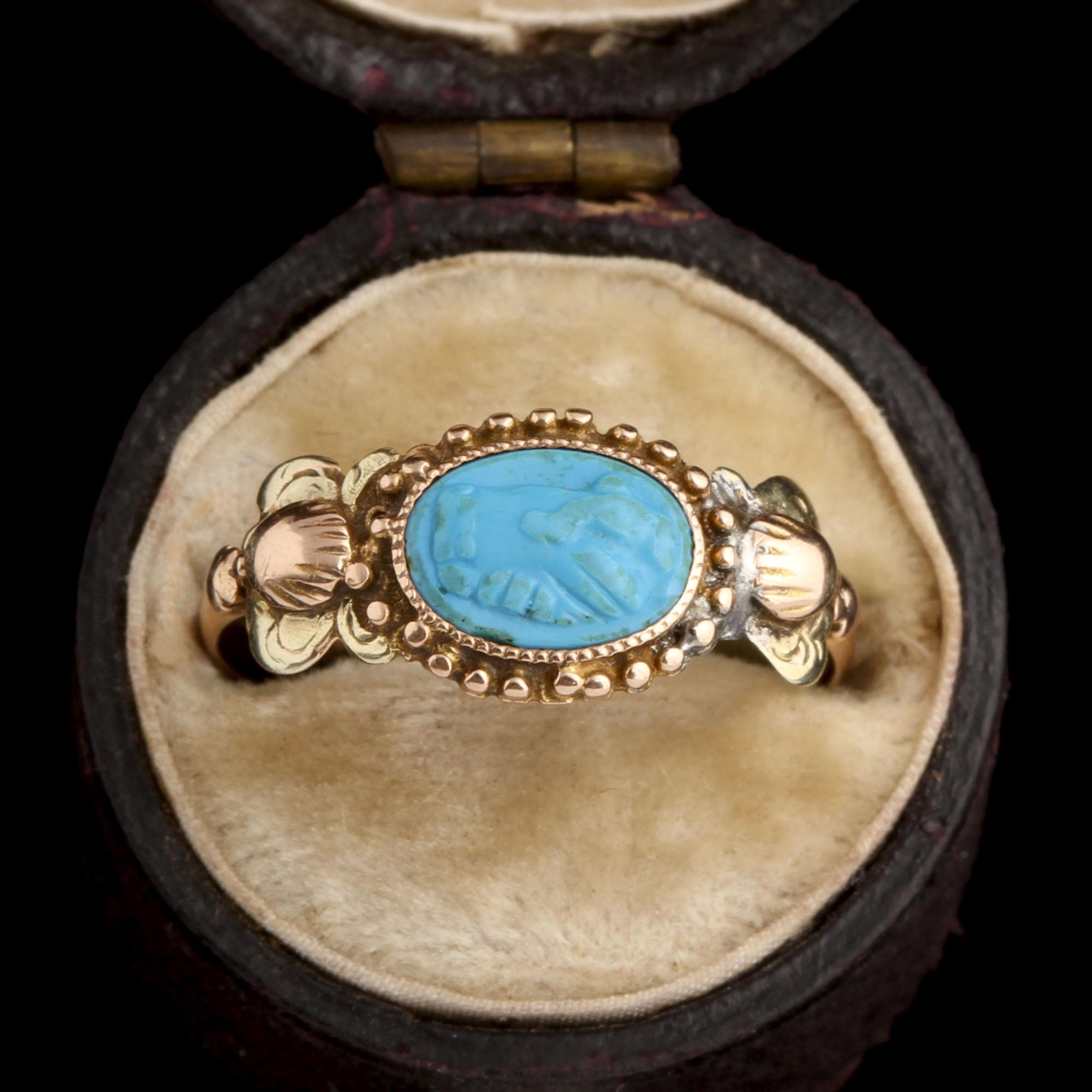 This ring was a commitment jewel. The fede motif (two clasped hands) represents the joining of hands of the couple at a marriage ceremony, a practice that dates back to ancient Rome and was known as 'dextrarum iunctio'. This fede is turquoise-colored glass, pressed in the Georgian era and set into a tricolor gold mounting with shell and flower details at the shoulders.